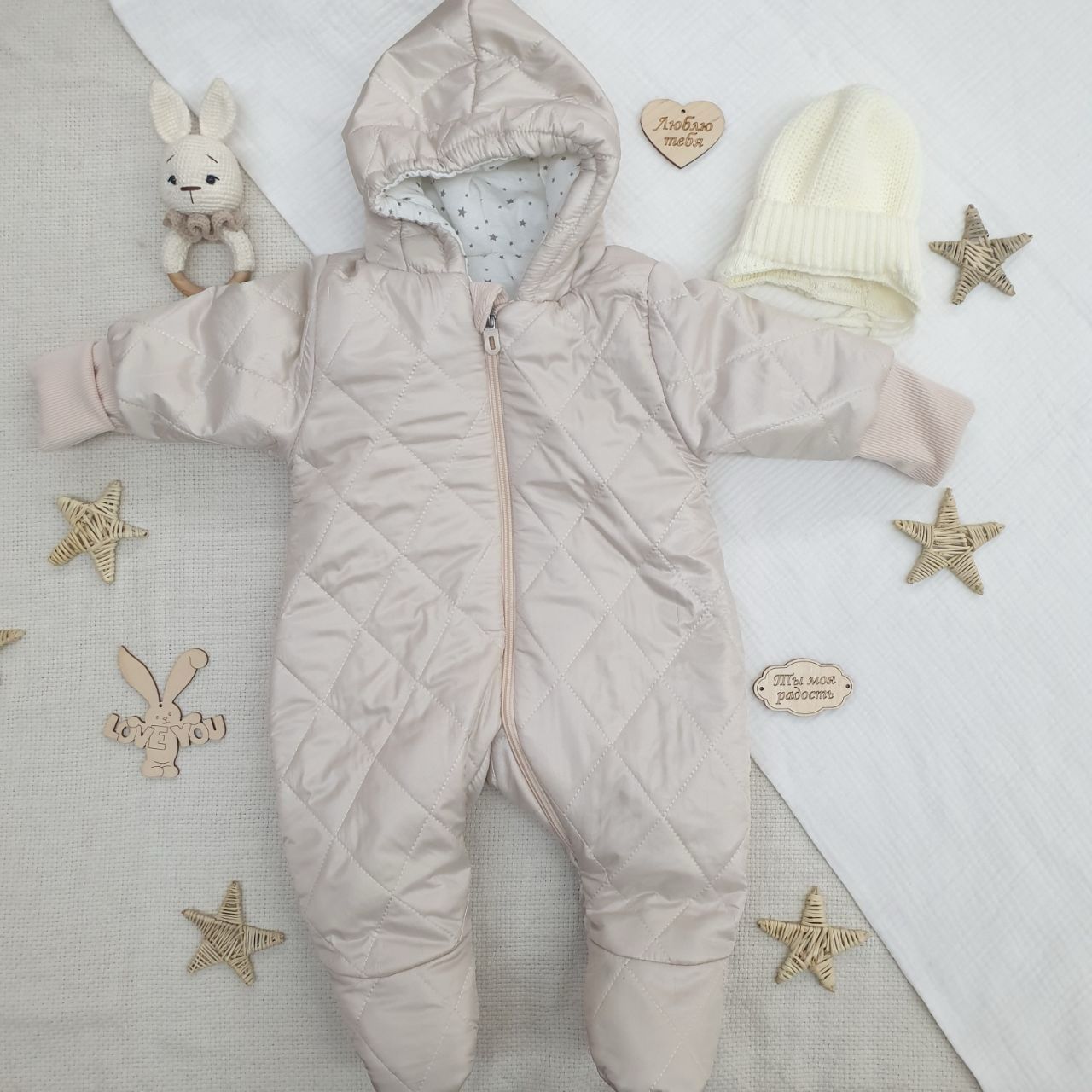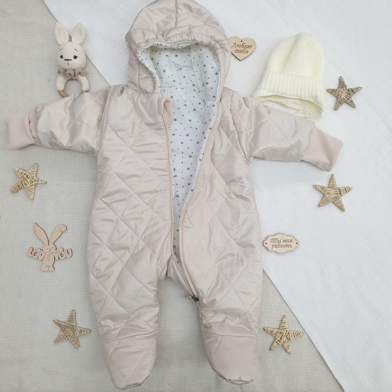 11-415 Комбинезон детский, светло бежевого оттенка. Теплый, стеганый комбинезон до -10 градусов, подойдет для осени и весны.