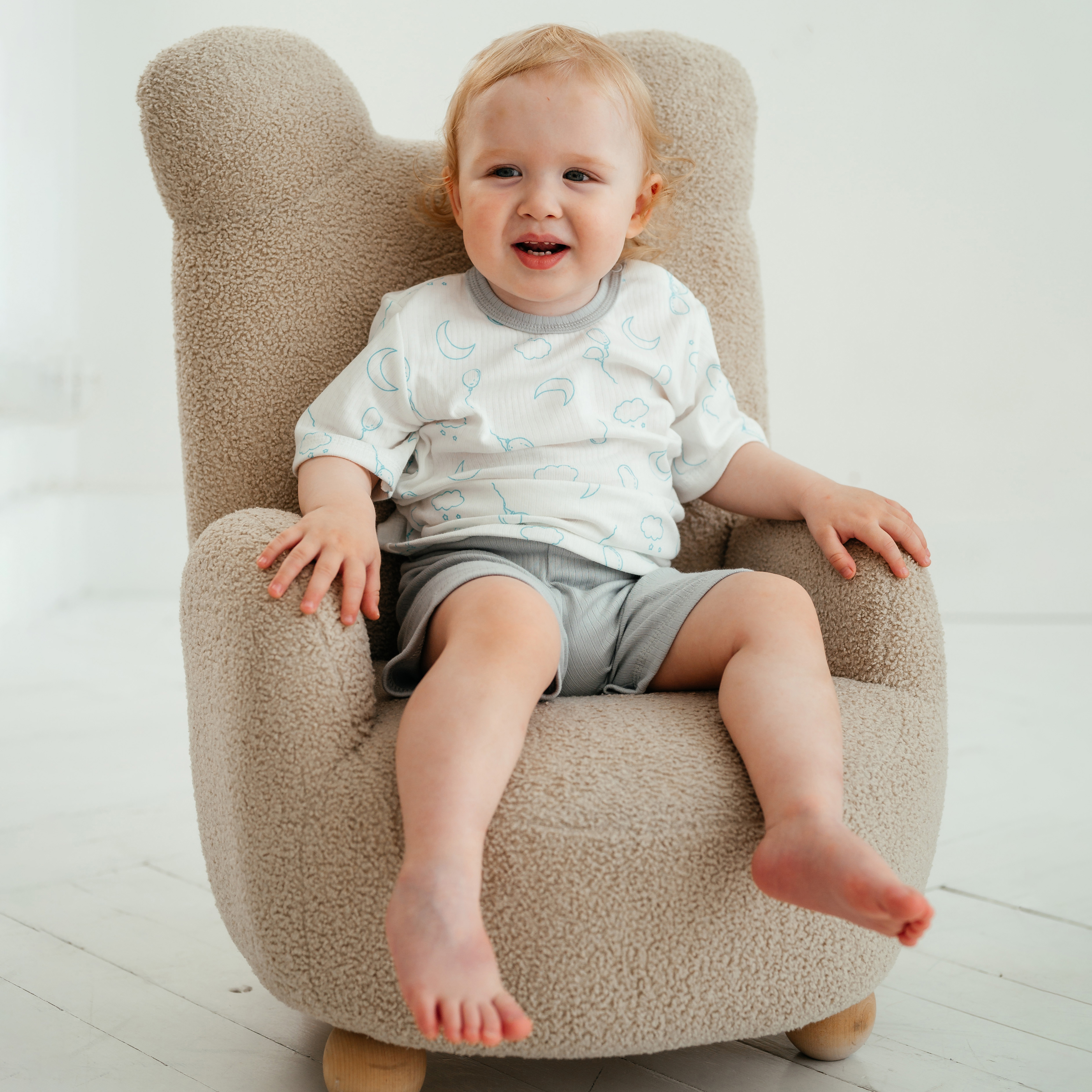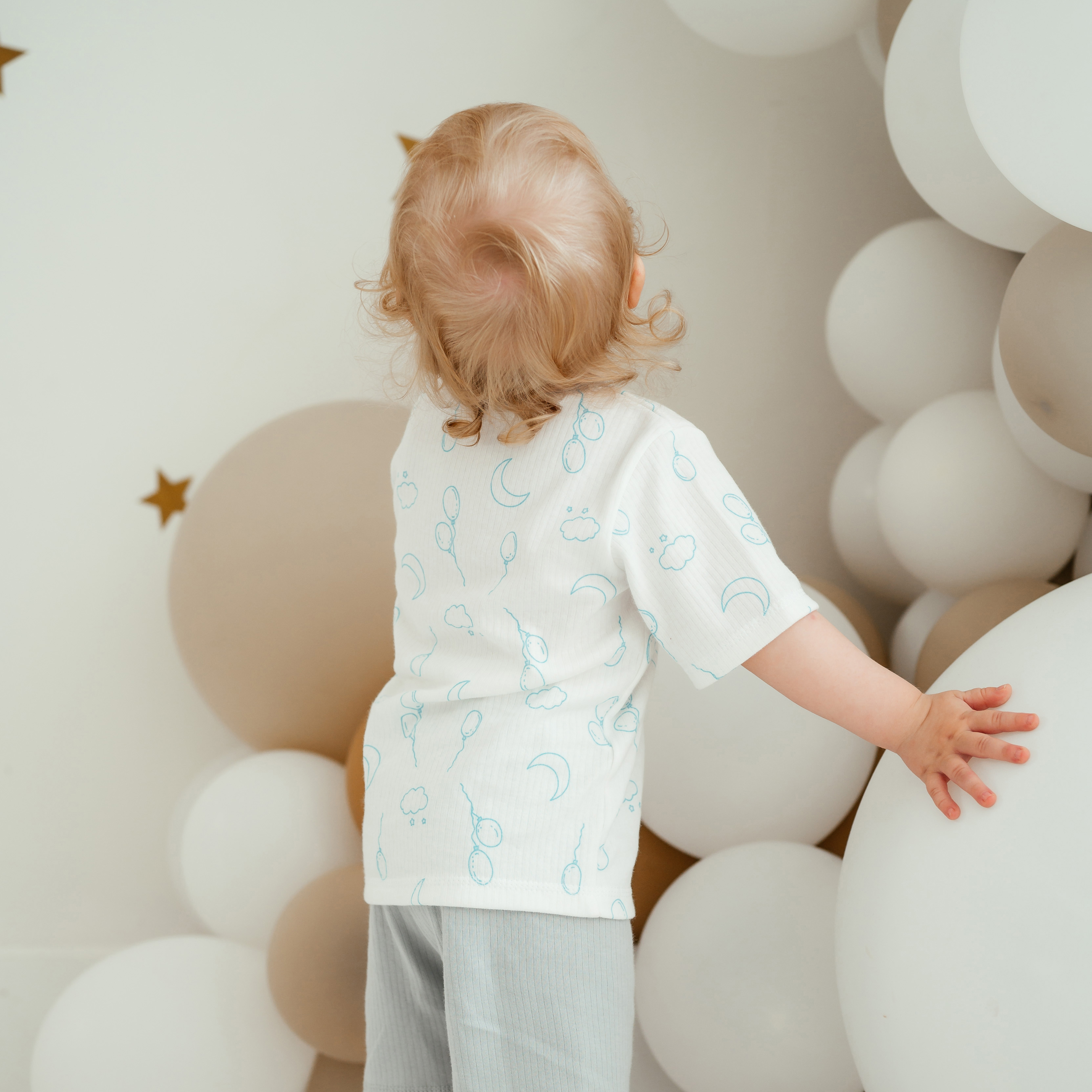 Футболка с двумя кнопочками на плече для удобства продевания головы ребёнка. Рукава короткие. Горловина окантована.
