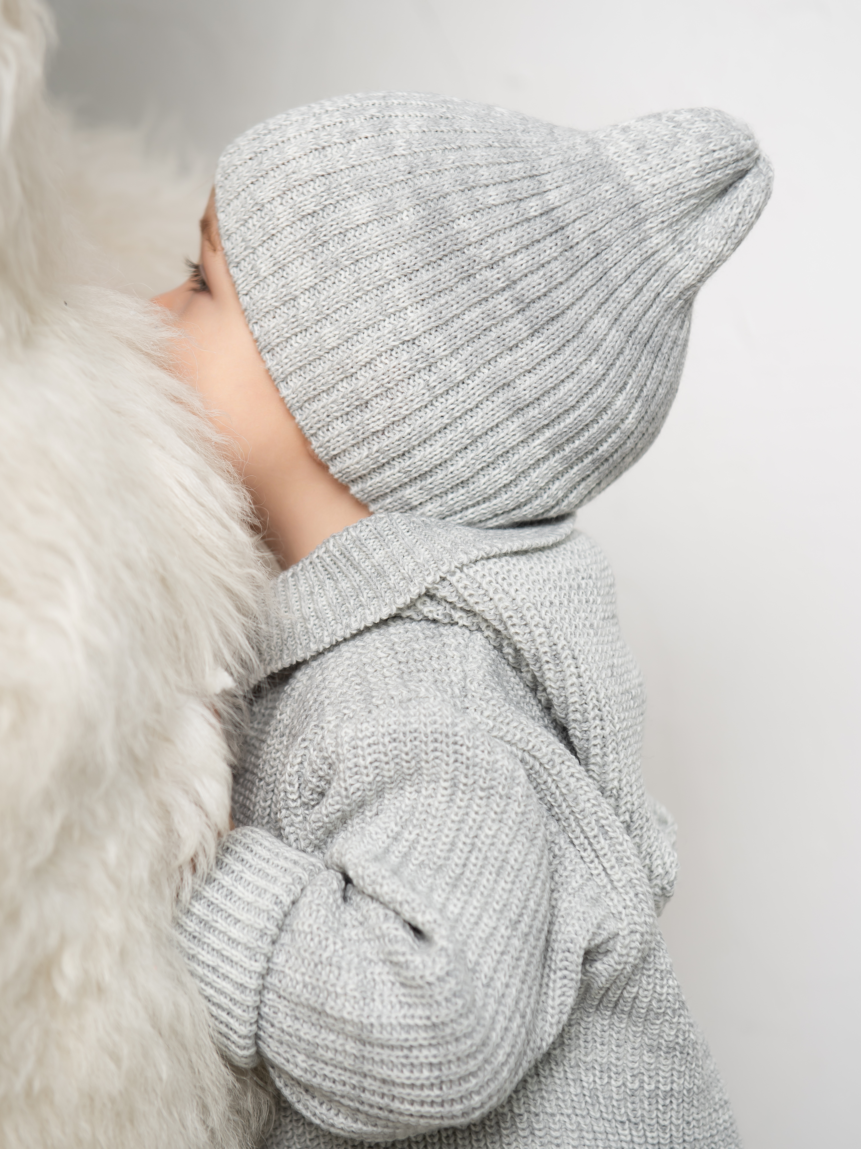 Вязаный комбинезон с капюшоном и шапочкой в комплекте.