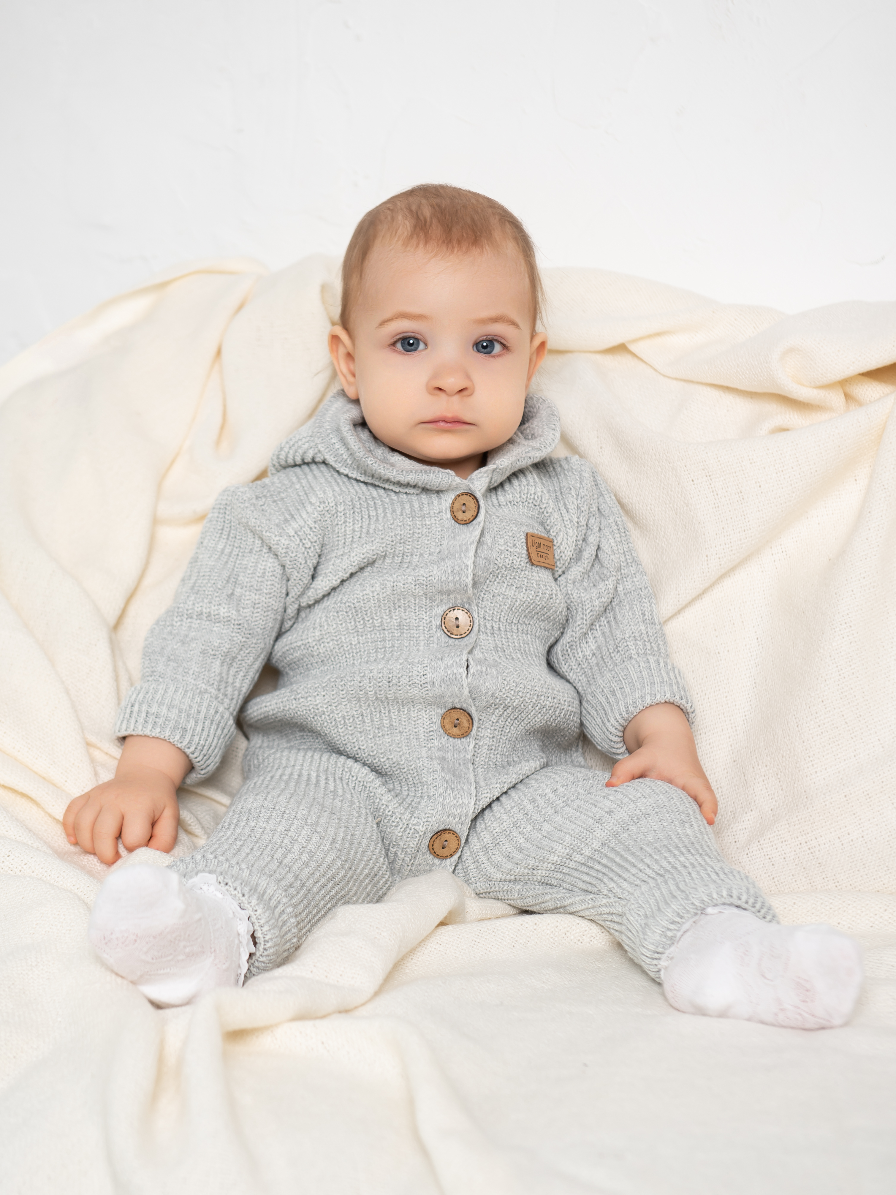 Вязанный комбинезон с глубоким капюшоном, на пуговицах.