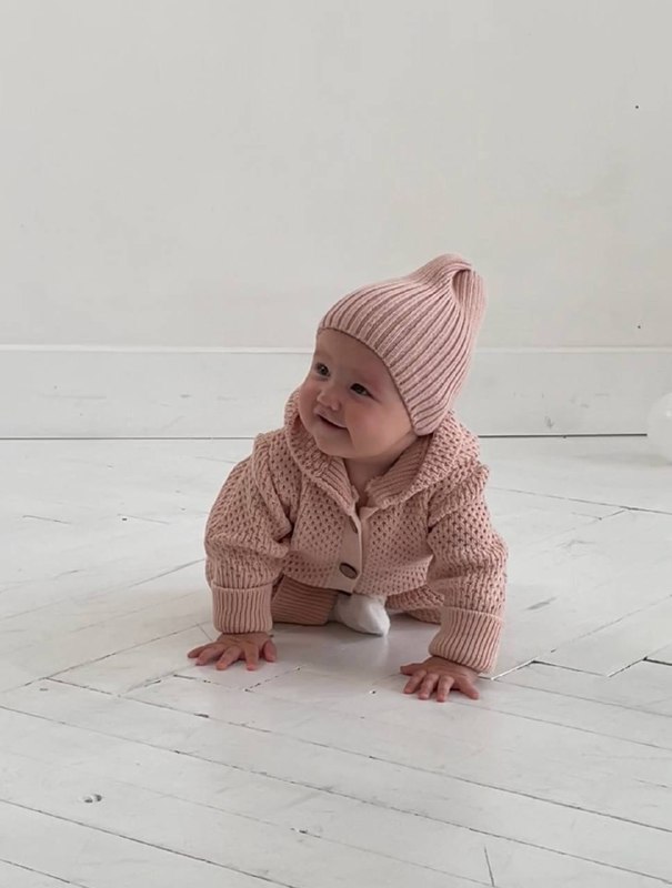 Теплая шапочка с полушерстяной нити. Удобно облегает голову малыша, модель создана в стиле "Бини".