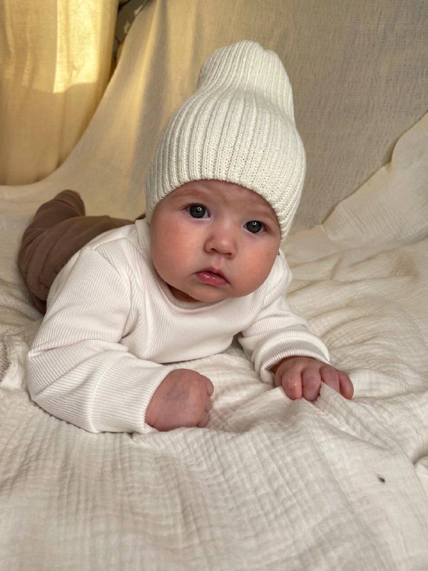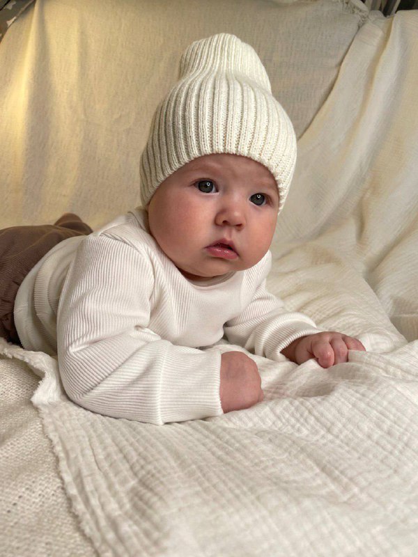 Теплая шапочка с полушерстяной нити. Удобно облегает голову малыша, модель создана в стиле "Бини".