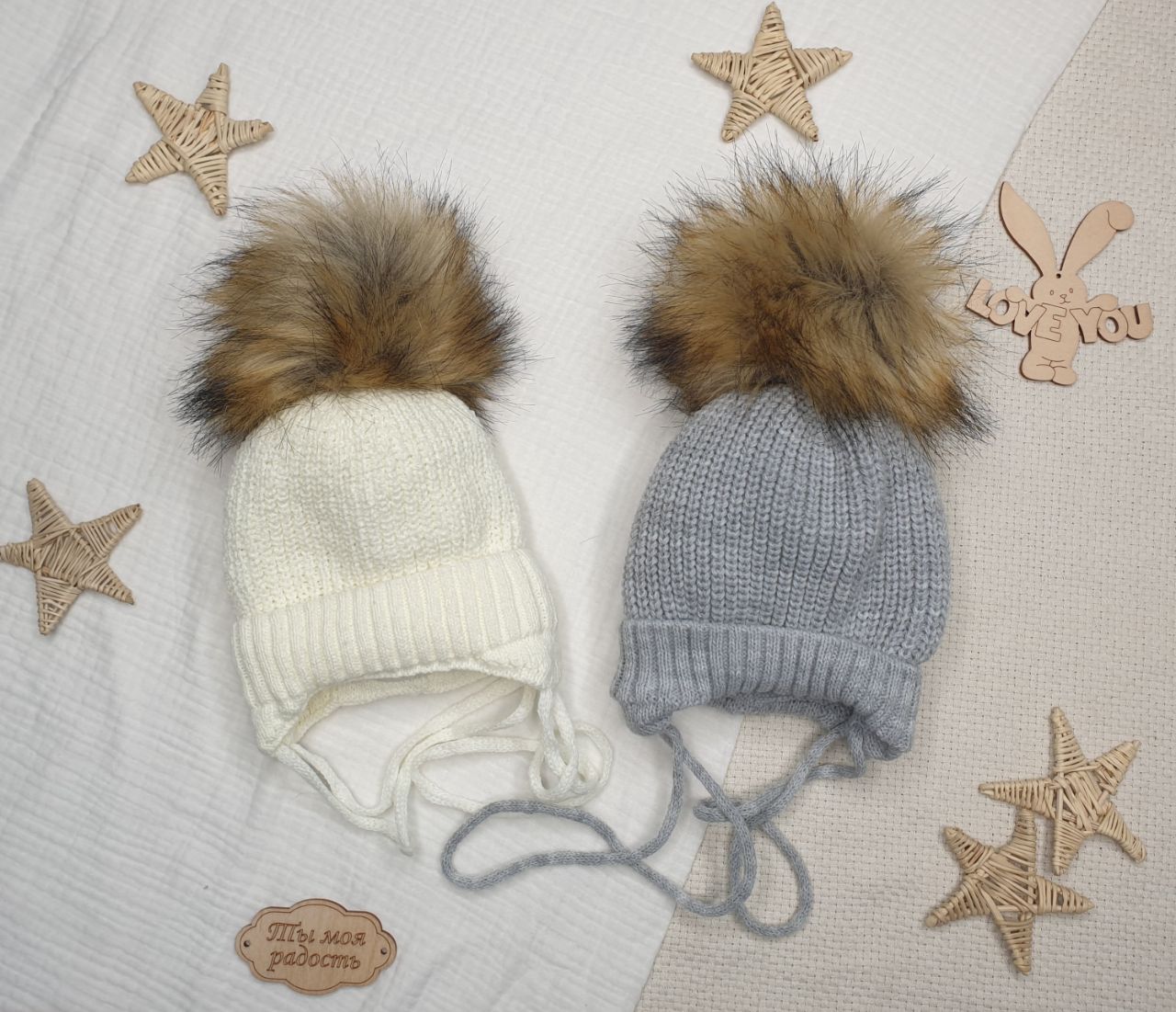 Зимняя шапочка на завязках, плотно сидит на голове малыша. Ушки хорошо закрыты.