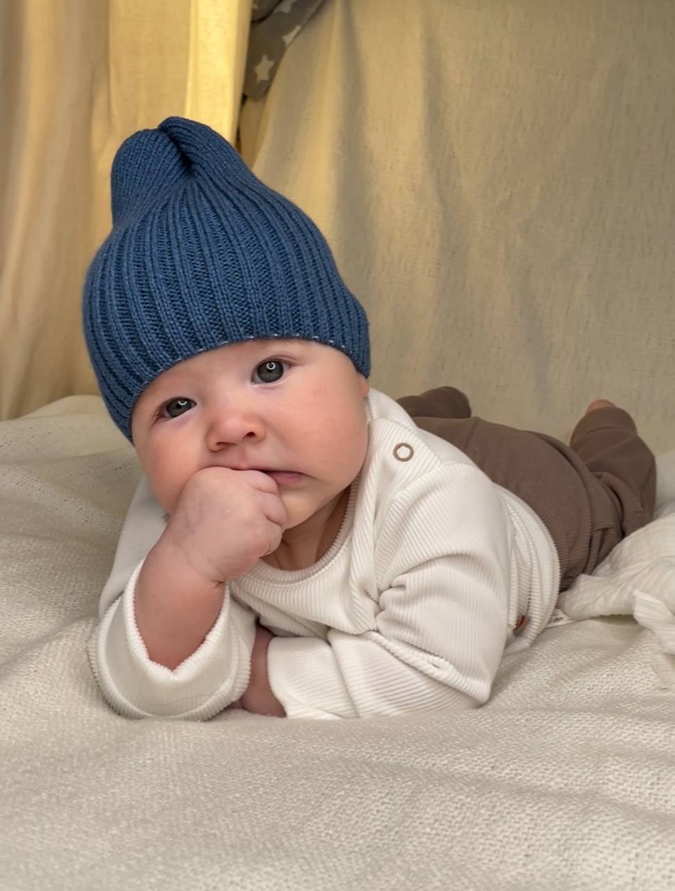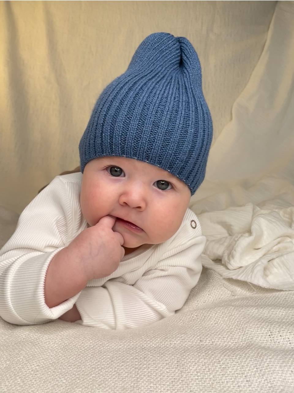 Теплая шапочка с полушерстяной нити. Удобно облегает голову малыша, модель создана в стиле "Бини".