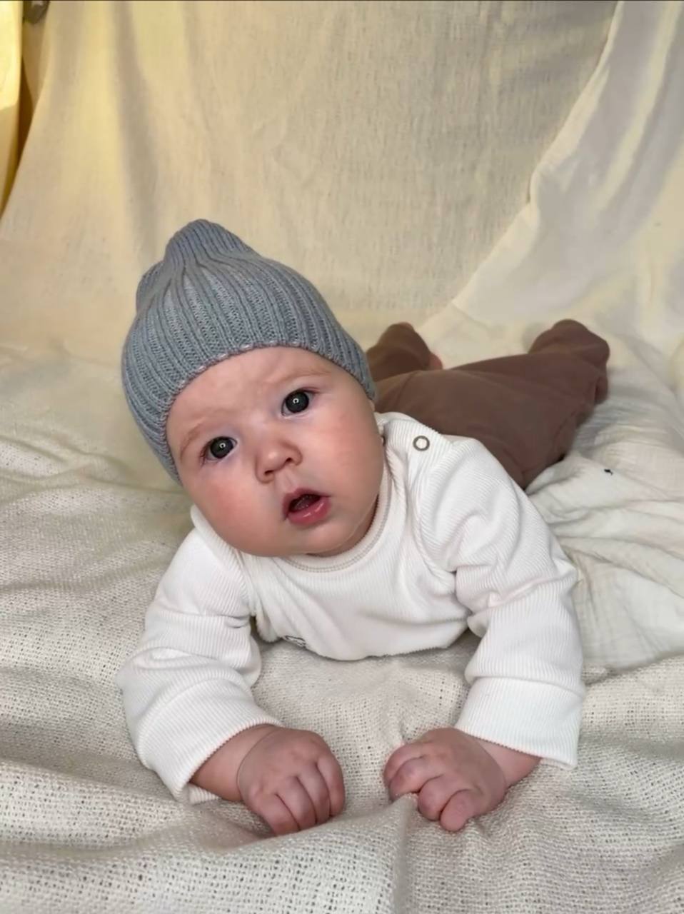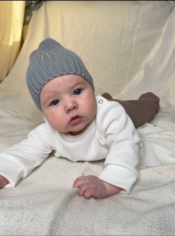 Теплая шапочка с полушерстяной нити. Удобно облегает голову малыша, модель создана в стиле "Бини".