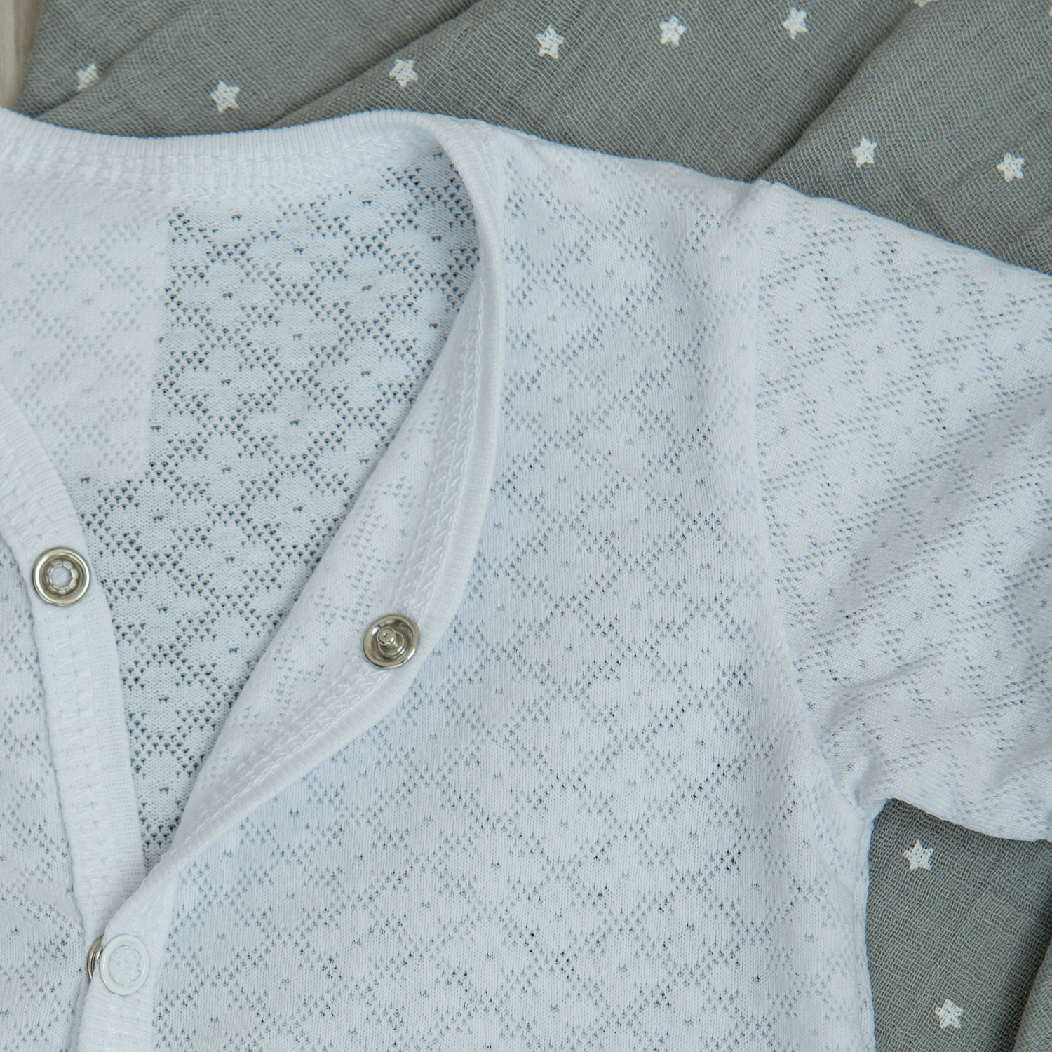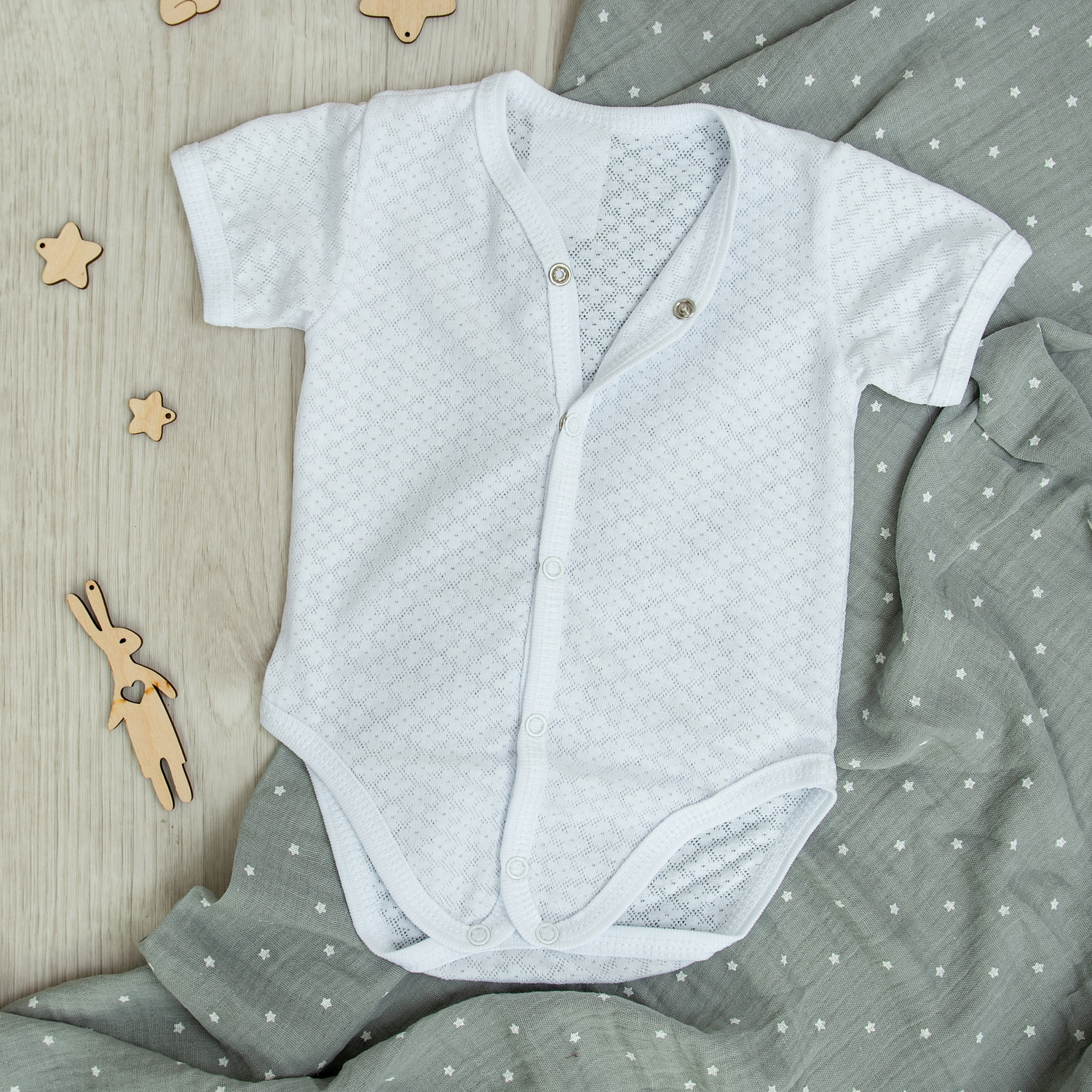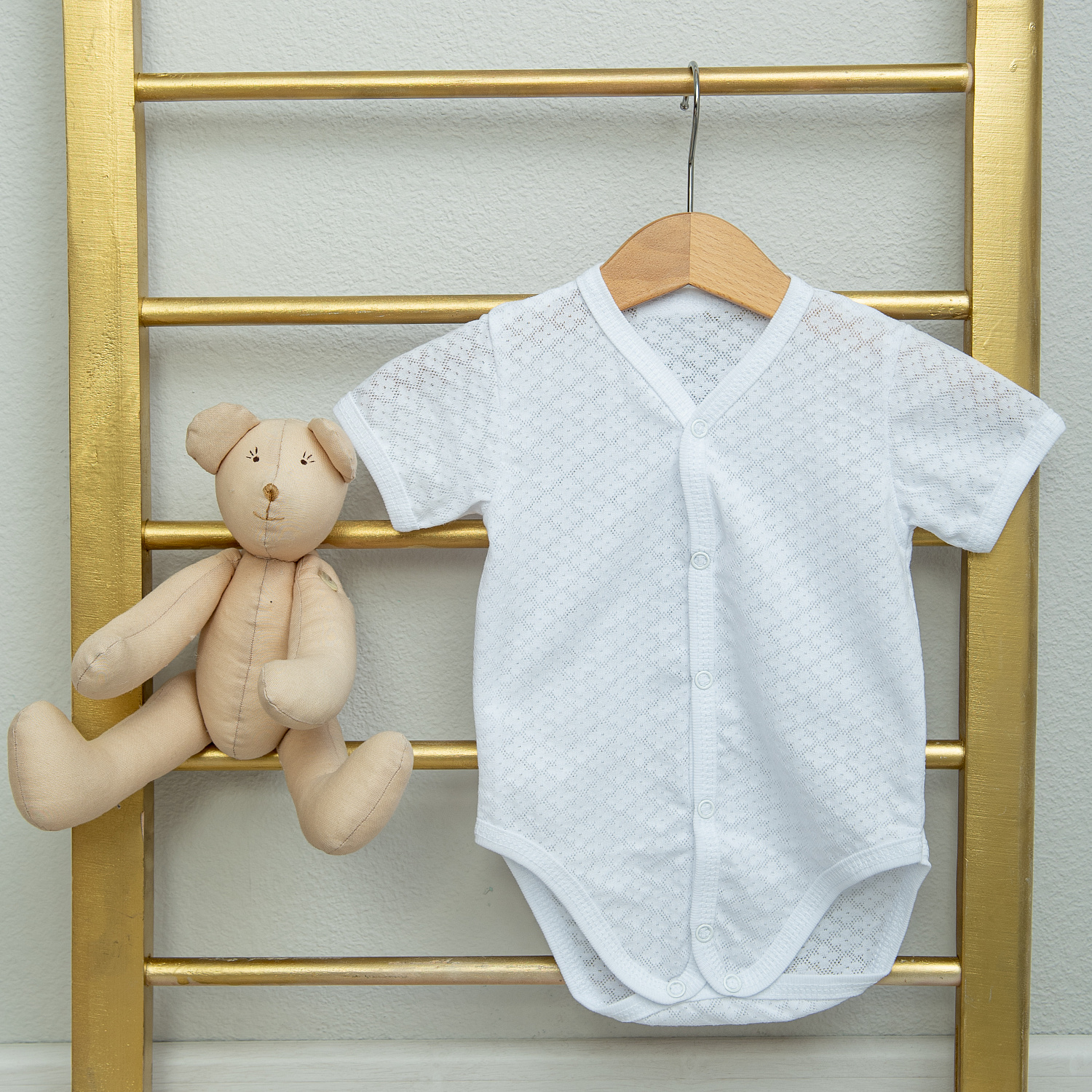 Боди (от англ. body – тело)– очень удобный современный вид одежды для малыша, с успехом заменивший собой неудобные распашонки. Самое важное преимущество боди – фиксация между ножек ребенка. Поэтому боди не задирается и не скомкивается, как распашонка, что удобно, когда ребенок маленький и много времени лежит, а так же удобно, когда малыш подрастает и начинает много двигаться, оставляя поясницу всегда закрытой. Еще одно преимущество данной модели это ткань ажур 100% хлопок.