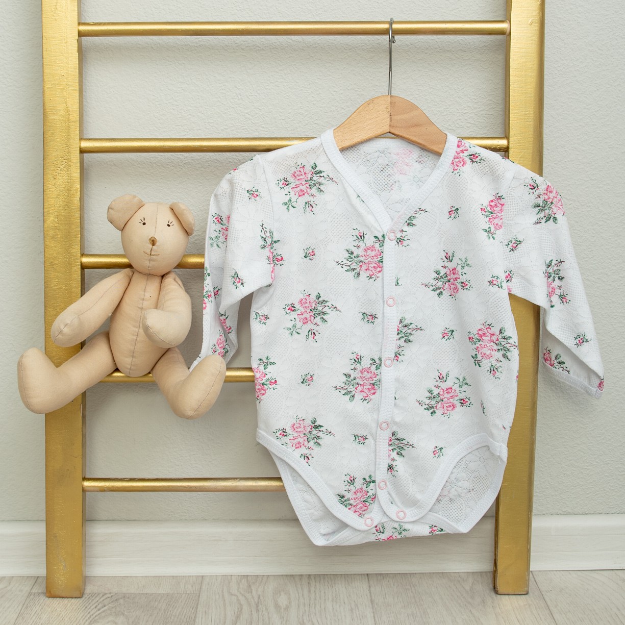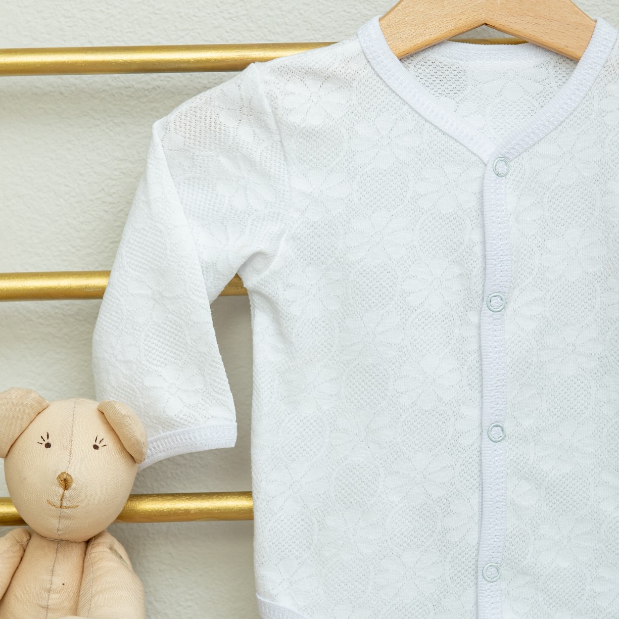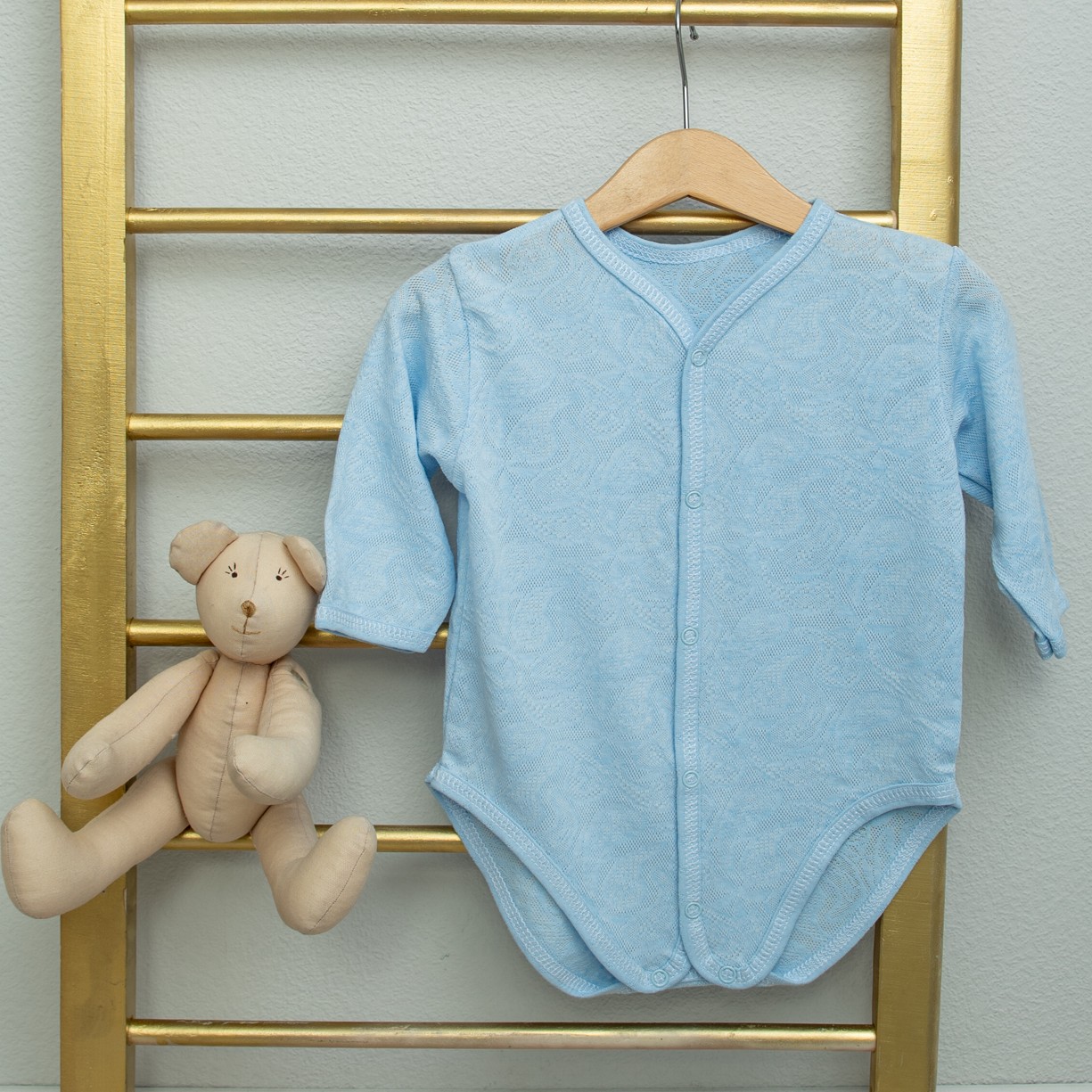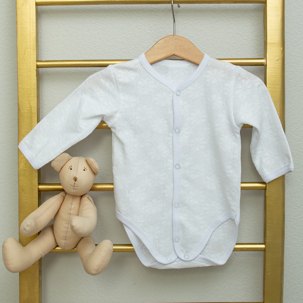 Нежные боди для малышей из ажурного хлопкового трикотажа. Боди с длинным рукавом. Застёжка на кнопочки по переду полностью открывает боди, позволяя удобно и быстро одевать малыша.