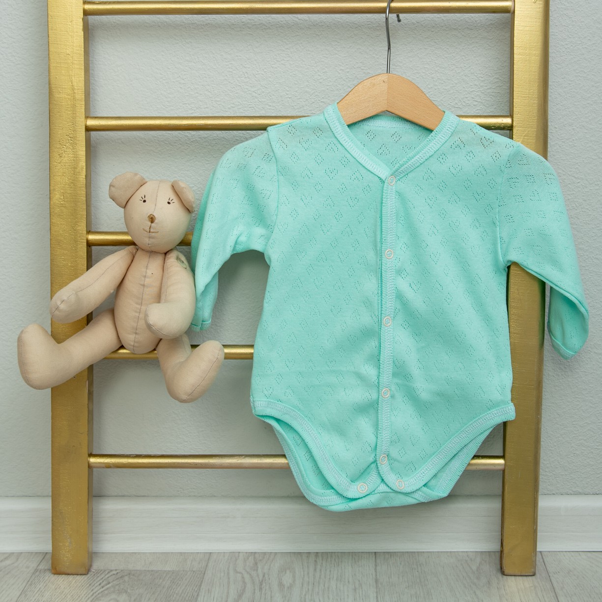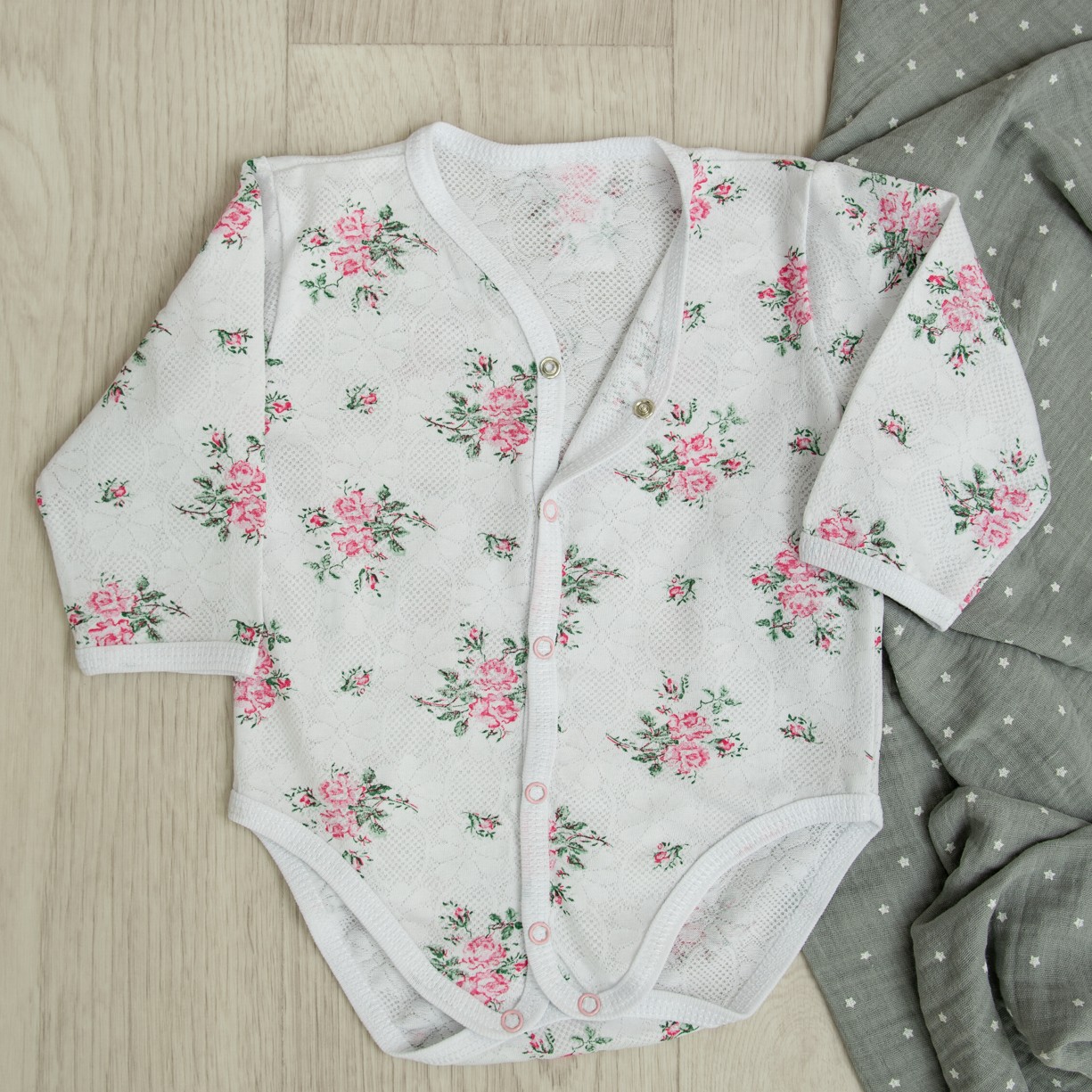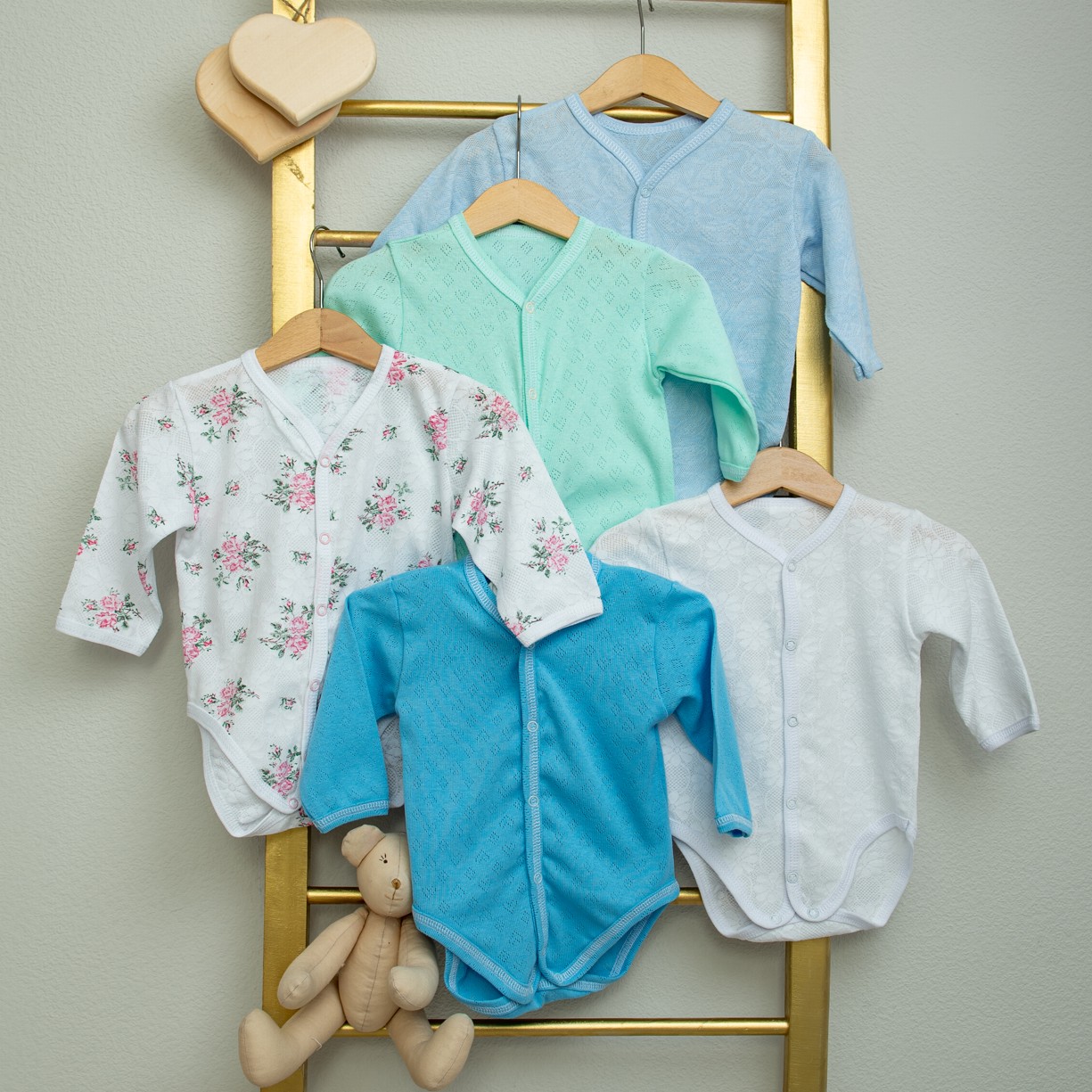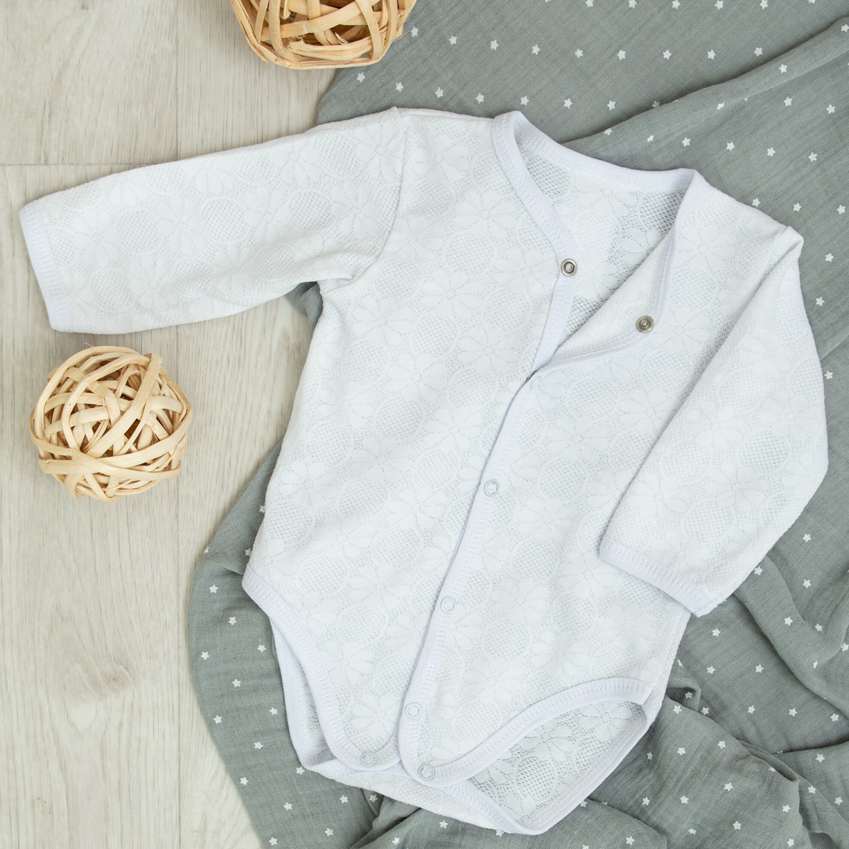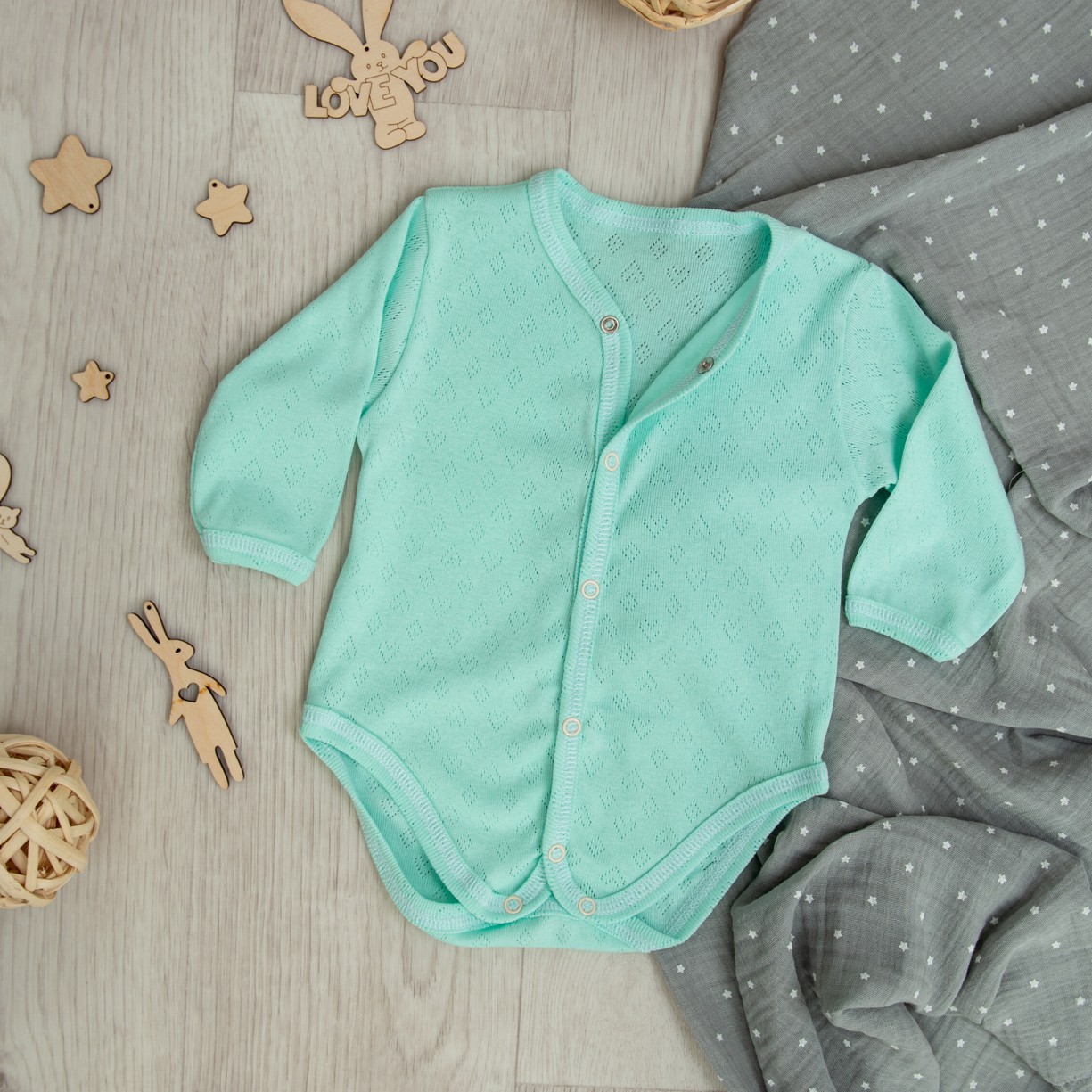 Нежные боди для малышей из ажурного хлопкового трикотажа. Боди с длинным рукавом. Застёжка на кнопочки по переду полностью открывает боди, позволяя удобно и быстро одевать малыша.