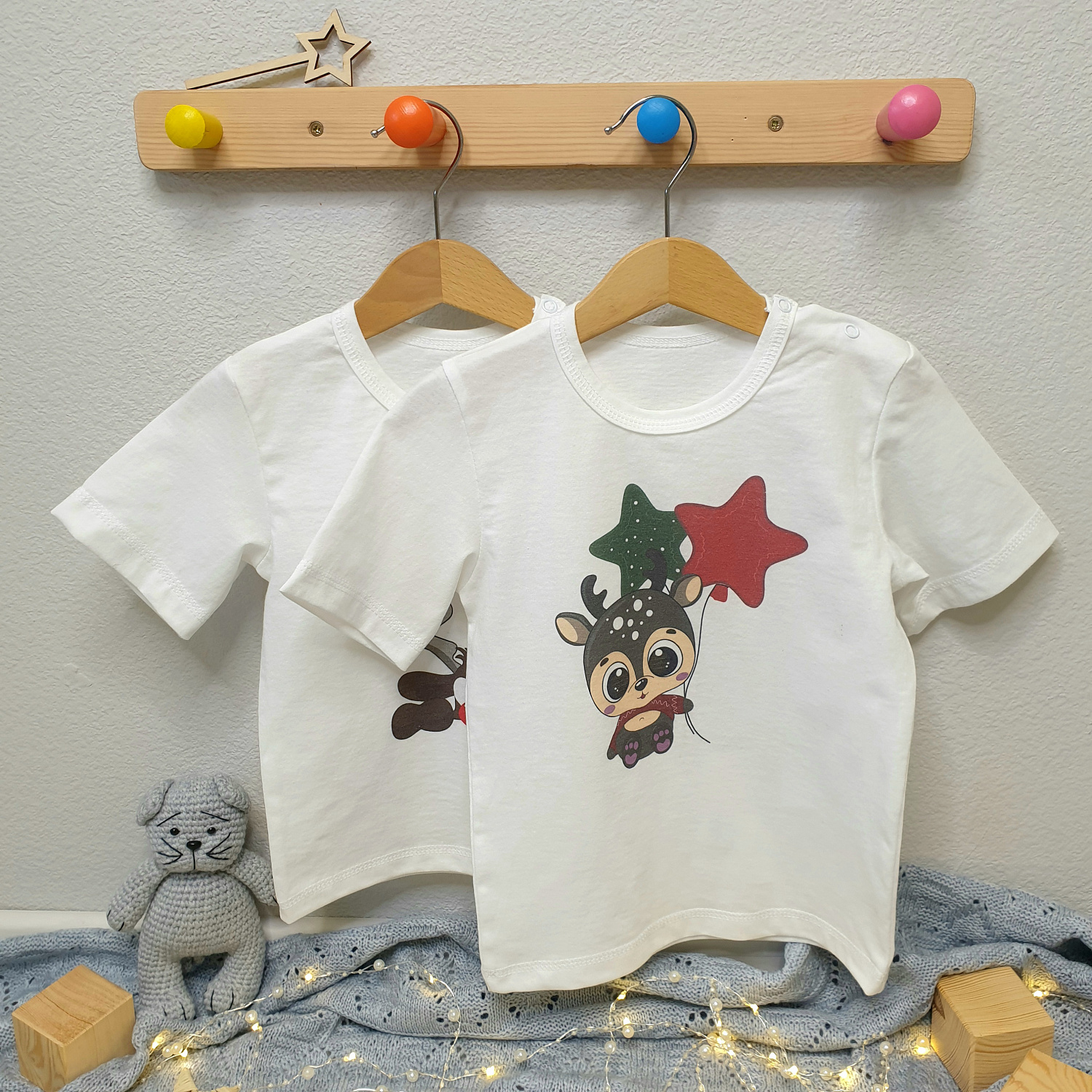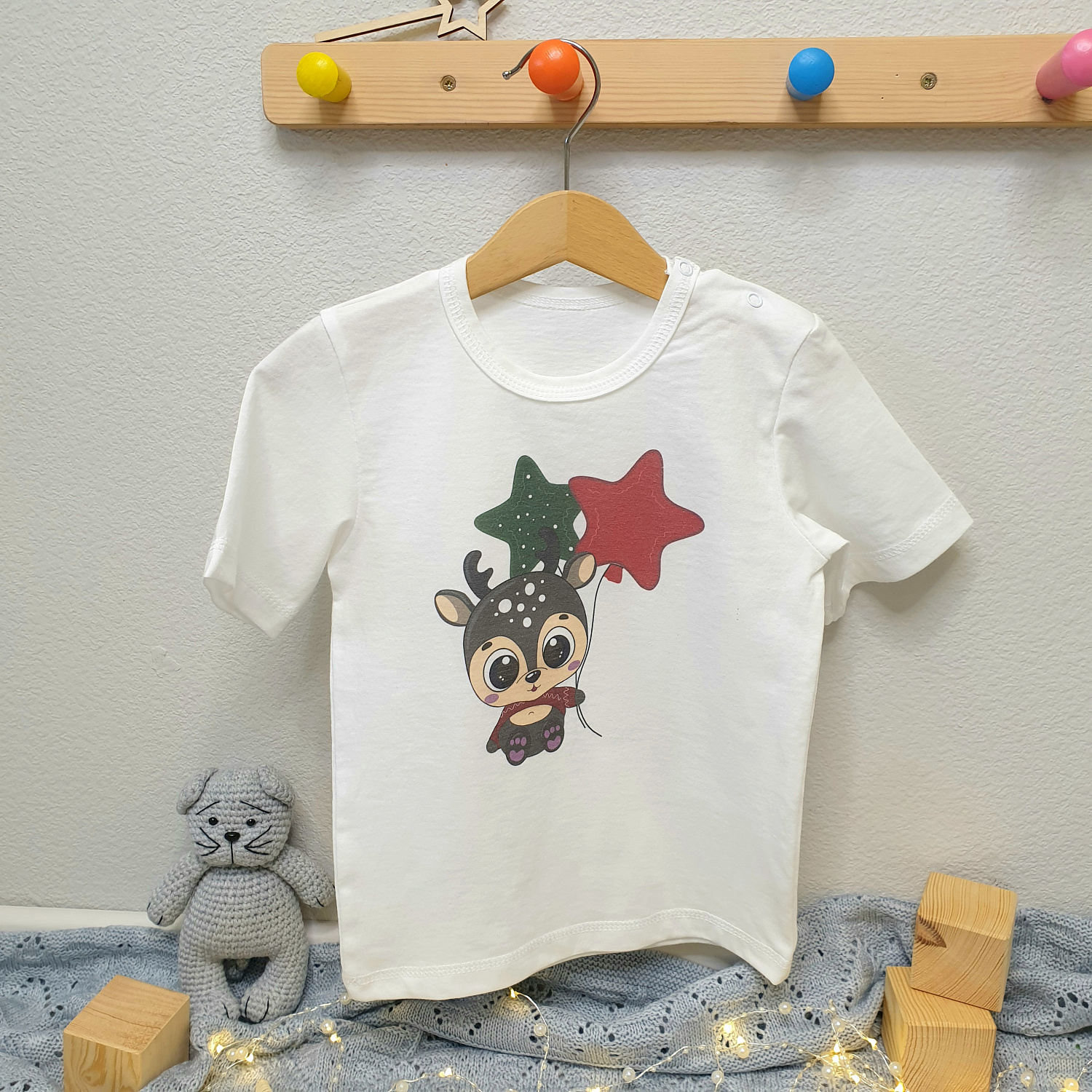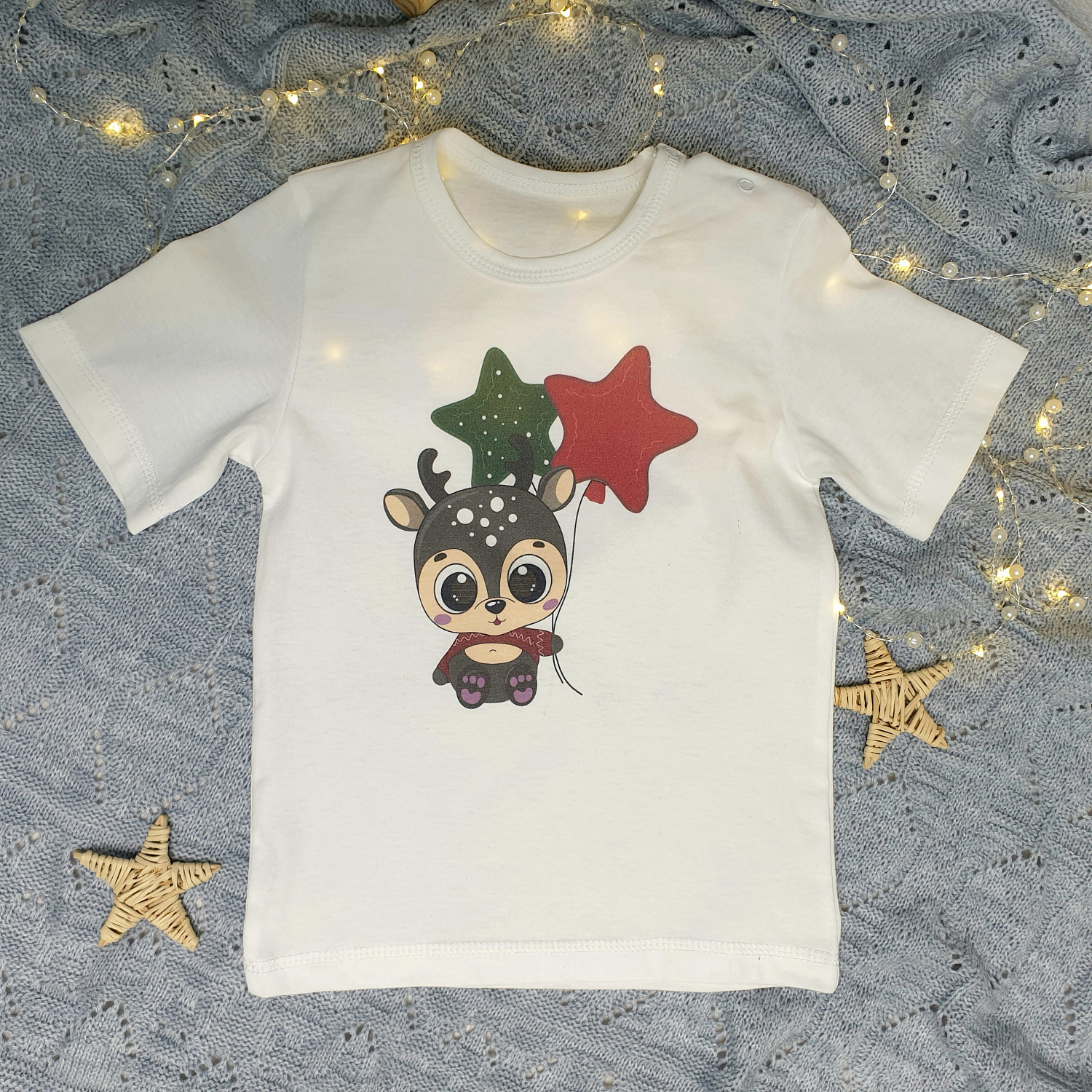 Футболка детская, короткий рукав, две кнопки на плече, с праздничным принтом "Олененок"