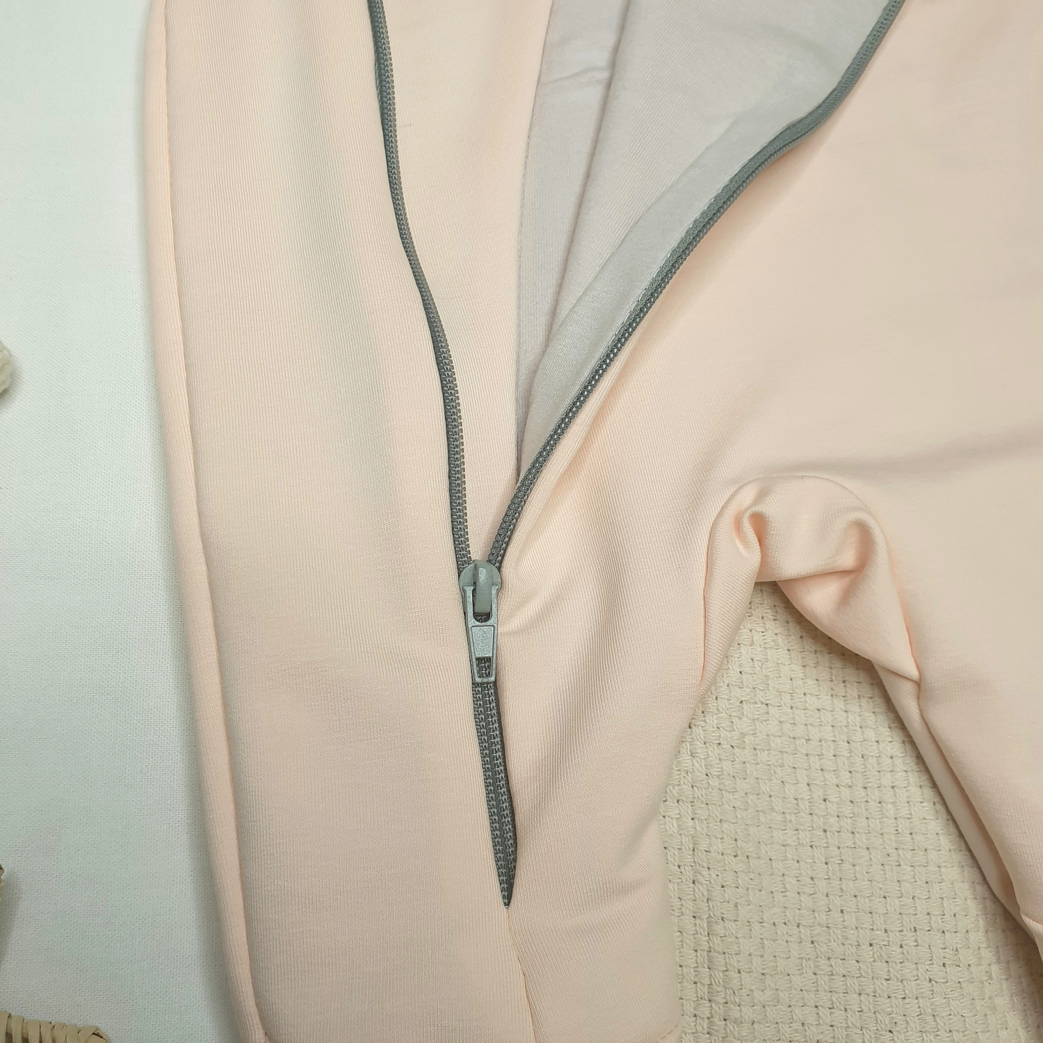Ножки с закрытыми стопами, рукава с трансформерами-отворотами, чтобы закрывать ручки в прохладную погоду.