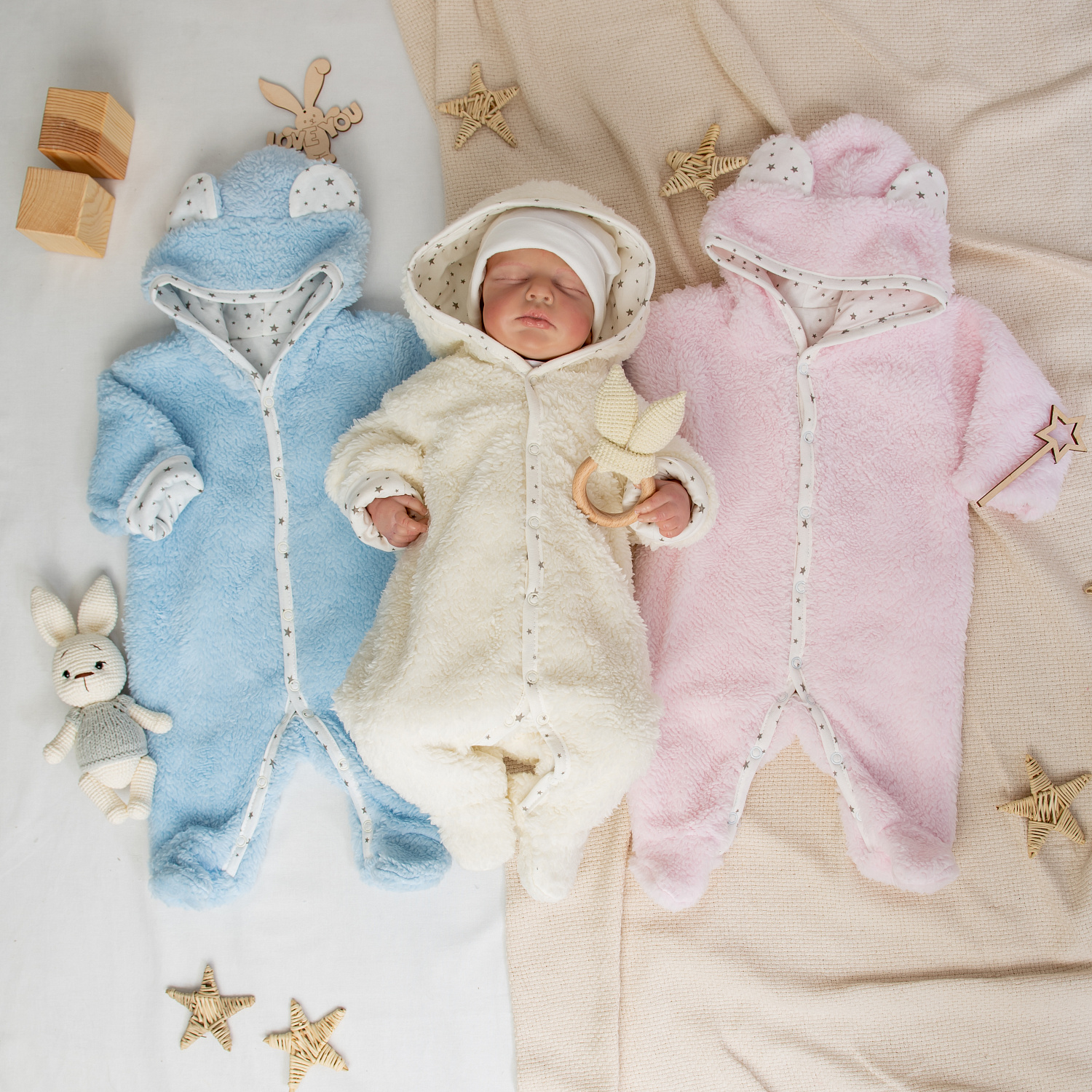Комбинезон сшит из очень мягкого пушистого ворсового трикотажа "мерлушка" с подкладкой из хлопкового кулирного трикотажа в мелкую звёздочку.