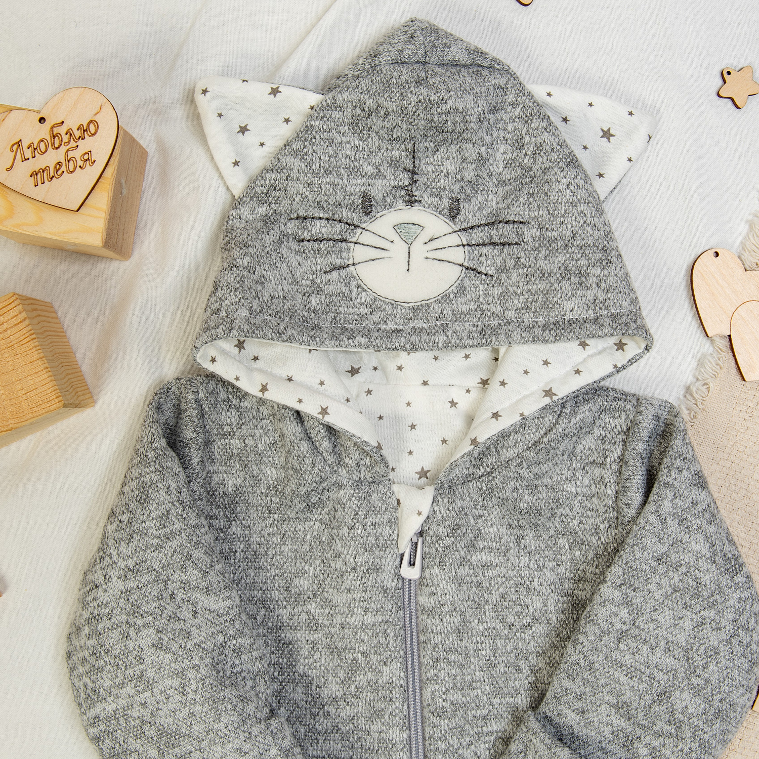 Капюшон украшен вышивкой и забавными ушками.