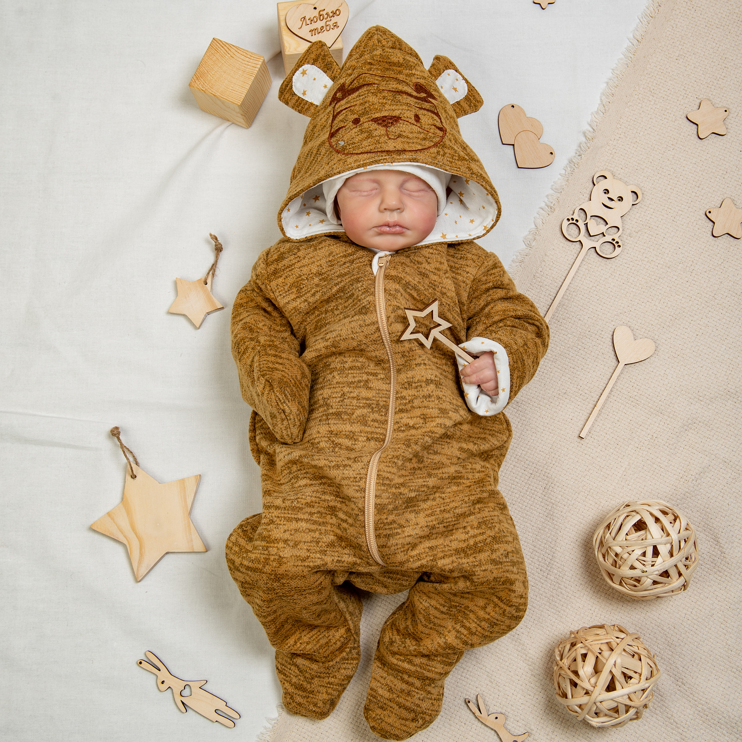 Комбинезон на подкладке из хлопкового кулирного трикотажа. Застёжка-молния длинная, до ножки. Капюшон украшен вышивкой. Ножки закрытые. На рукавах клапаны-трансформеры.