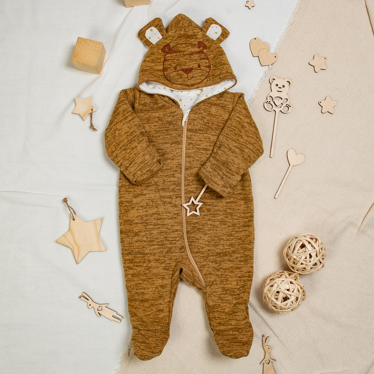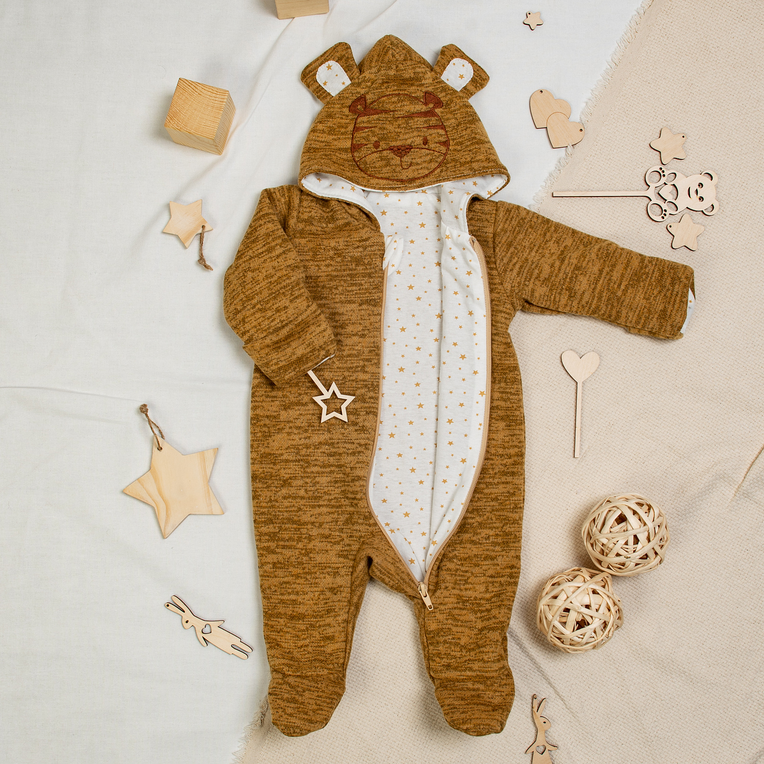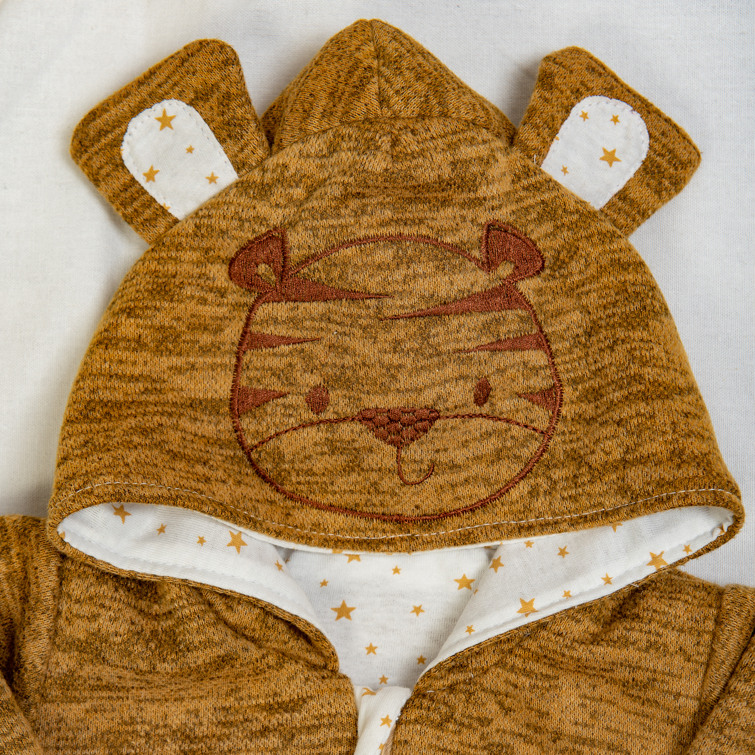 Мягкий и забавный тёпленький комбинезон с вышивкой-аппликацией "Тигр" на капюшоне.