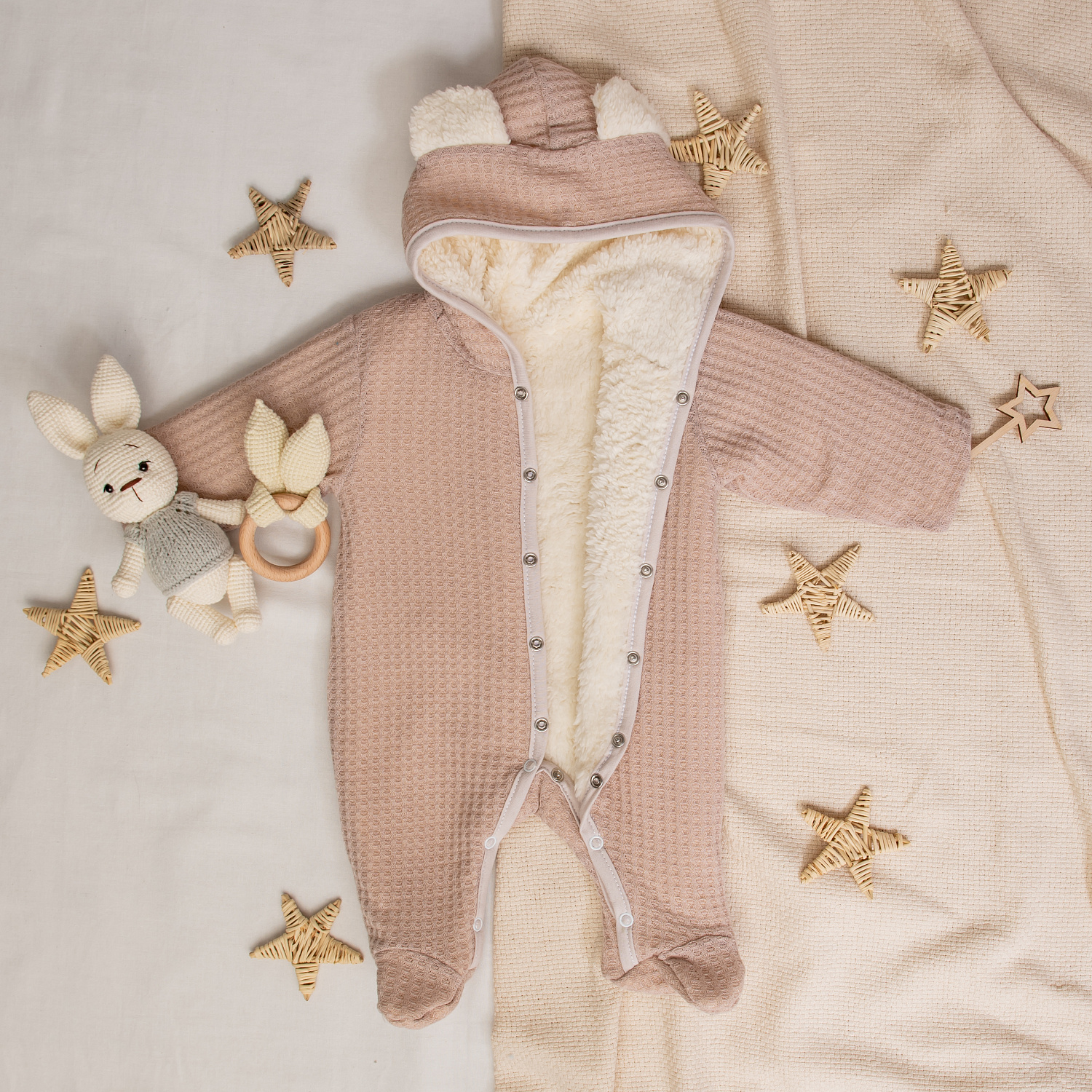 Ножки закрытые, ручки открытые. На капюшоне забавные милые ушки.