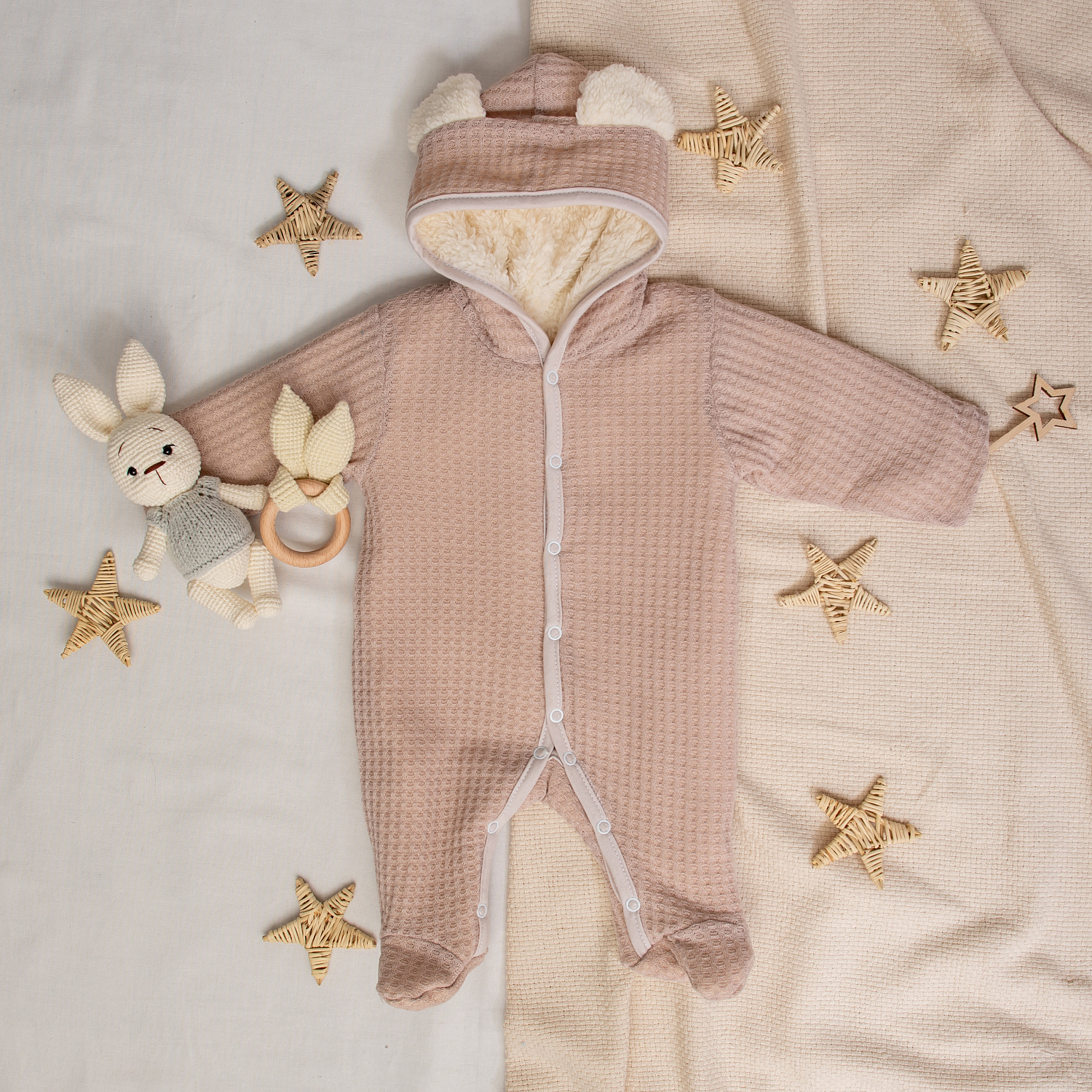 Комбинезон на кнопках, с капюшоном. На капюшоне небольшие круглые ушки.