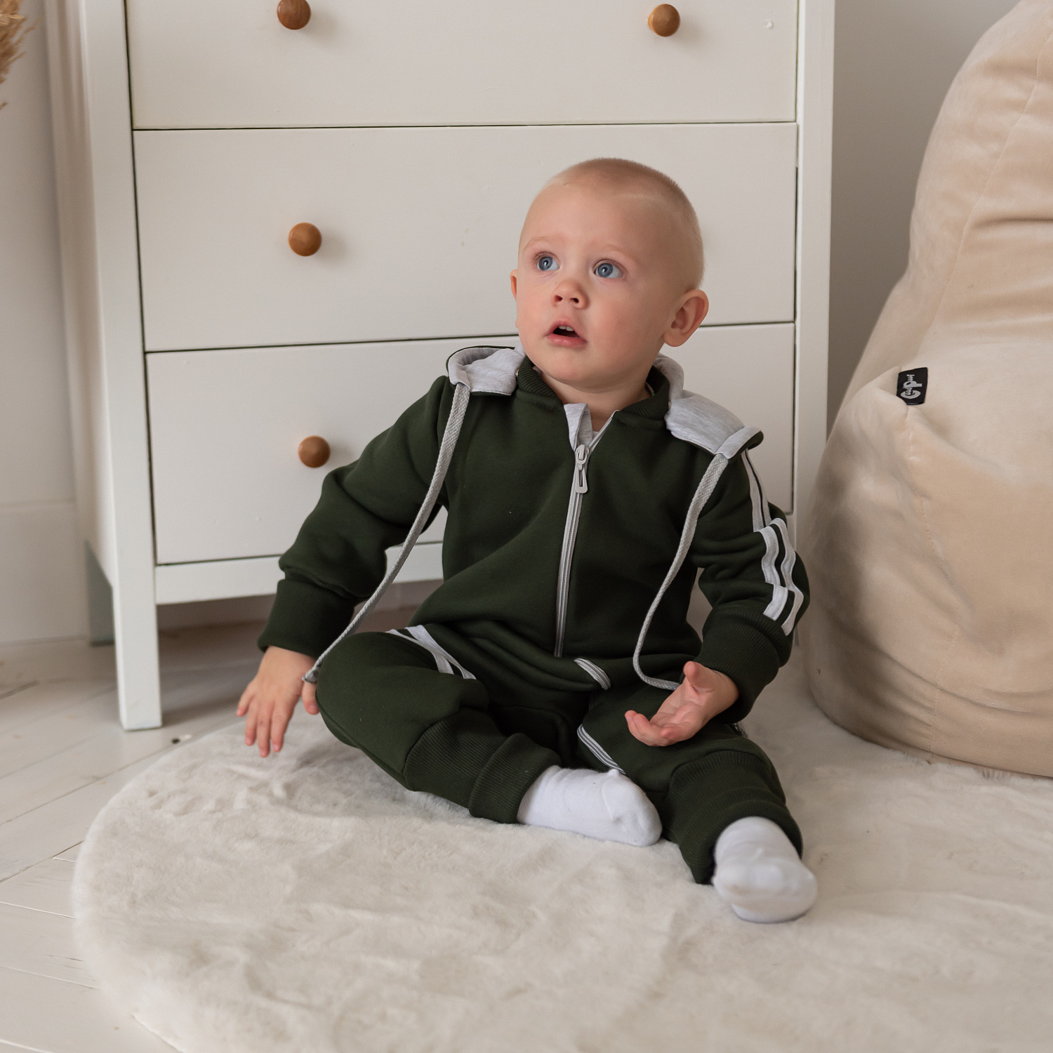 Материал: футер с начёсом; кашкорсе; подкладка капюшона и лампасы - хлопковый кулирный трикотаж серого цвета.