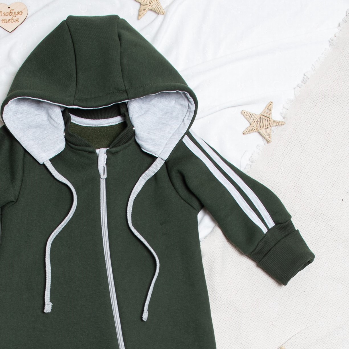 Комбинезон на длинной молнии, капюшон отстёгивается. Высокие эластичные манжеты с отворотами позволяют регулировать длину на рост ребёнка.
