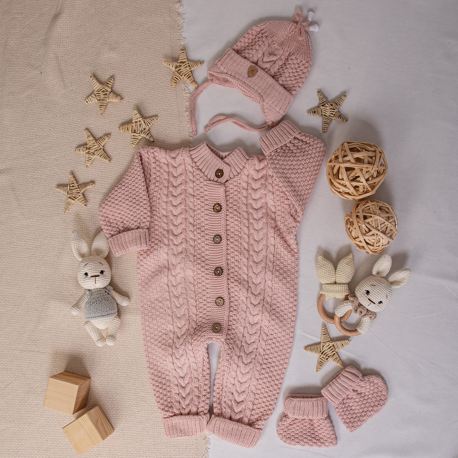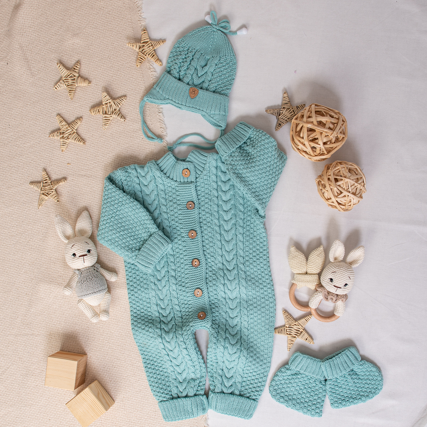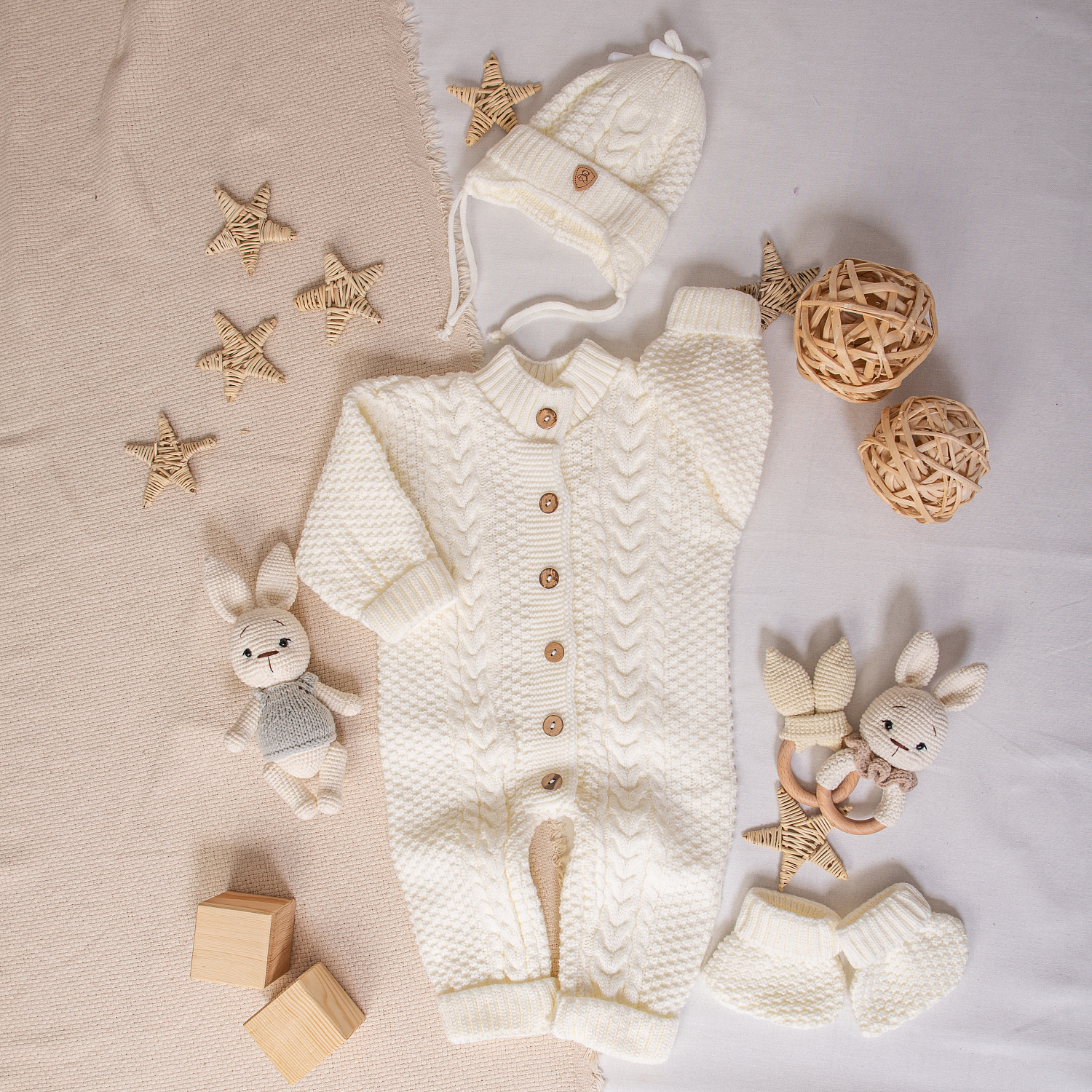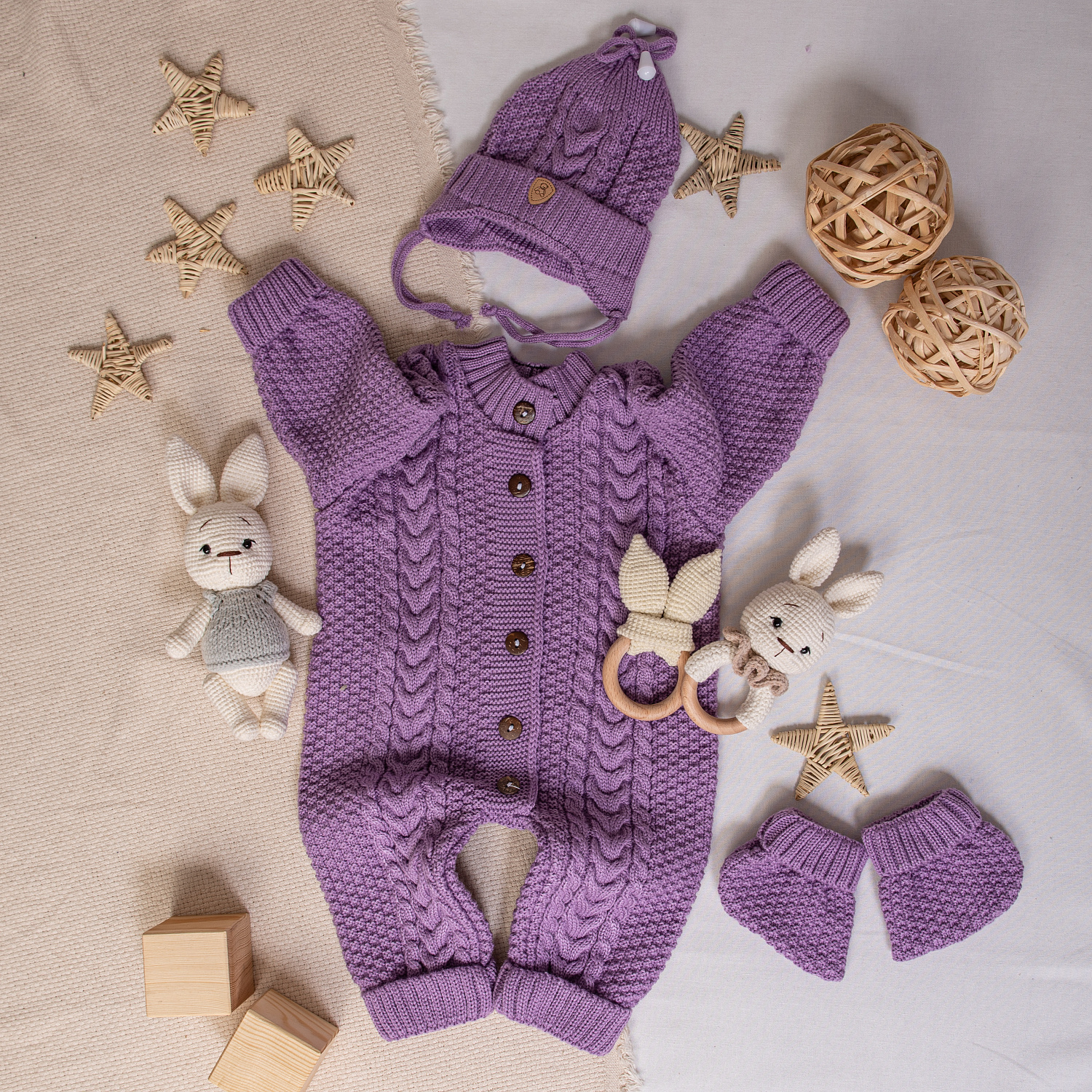 В комплекте комбинезон на пуговицах, шапочка с отворотом и носочки-пинетки.