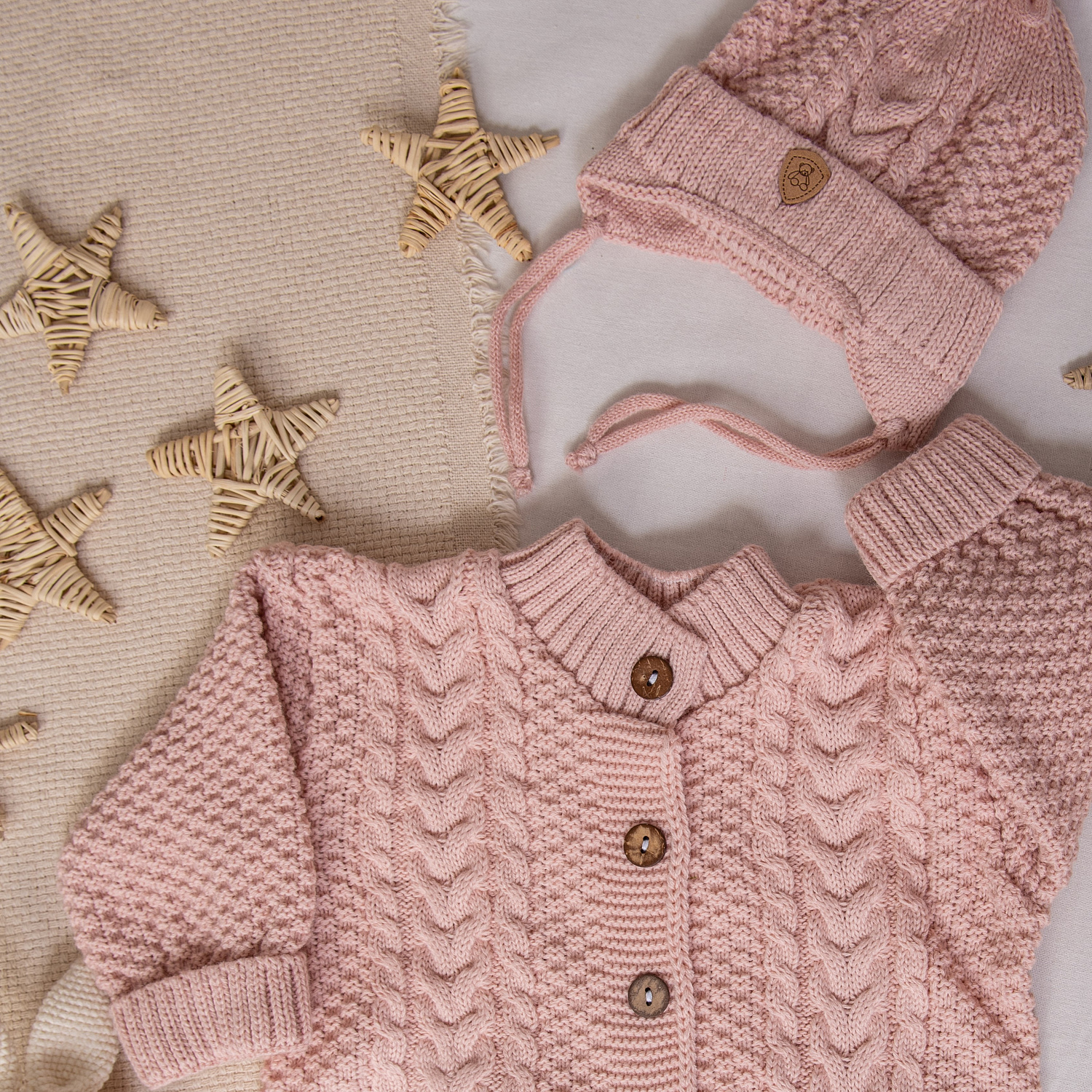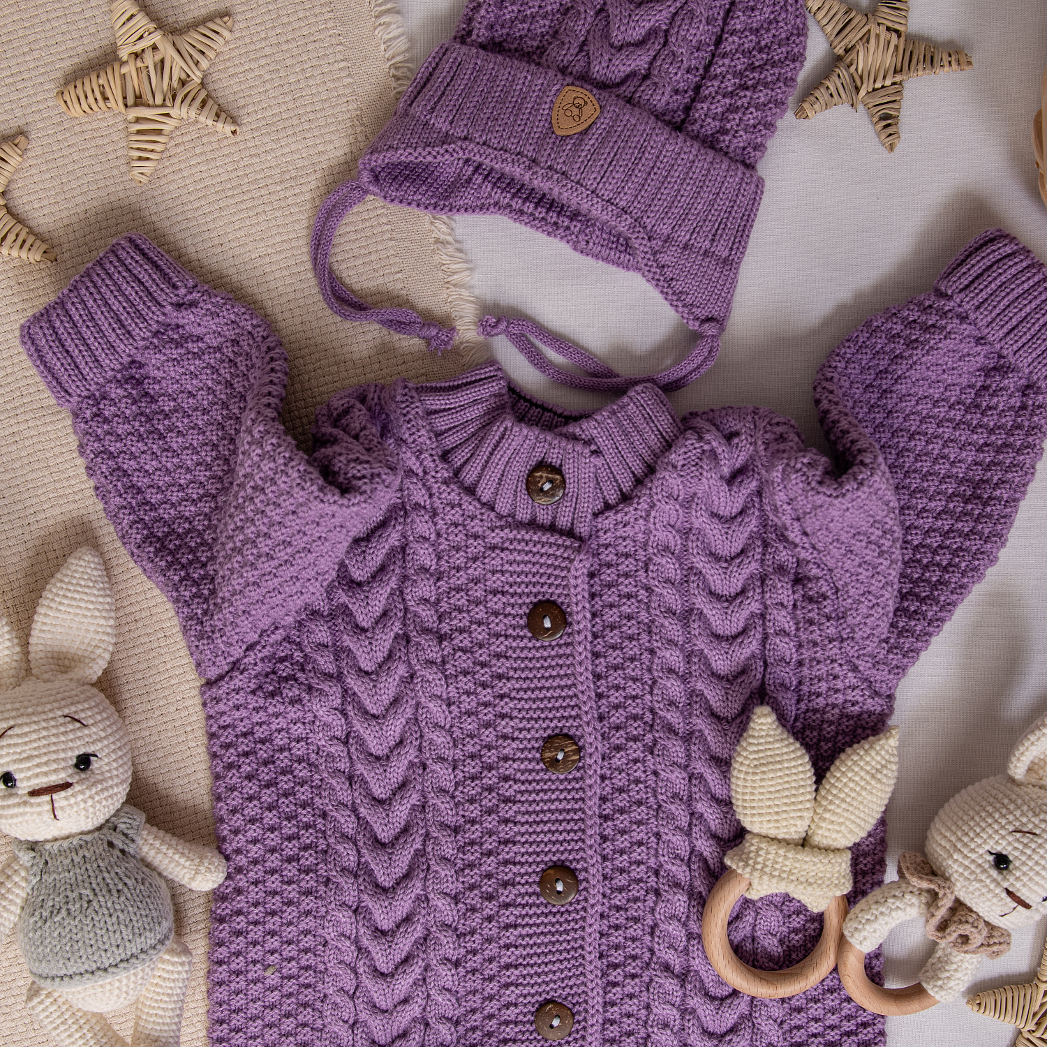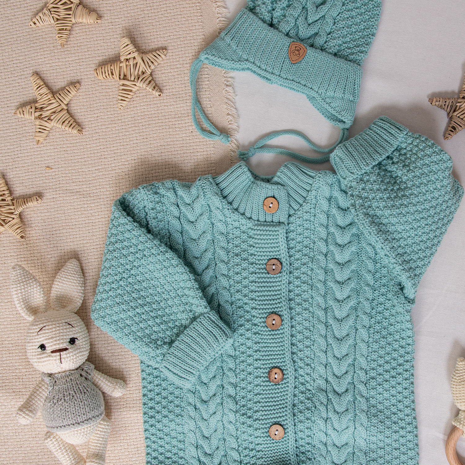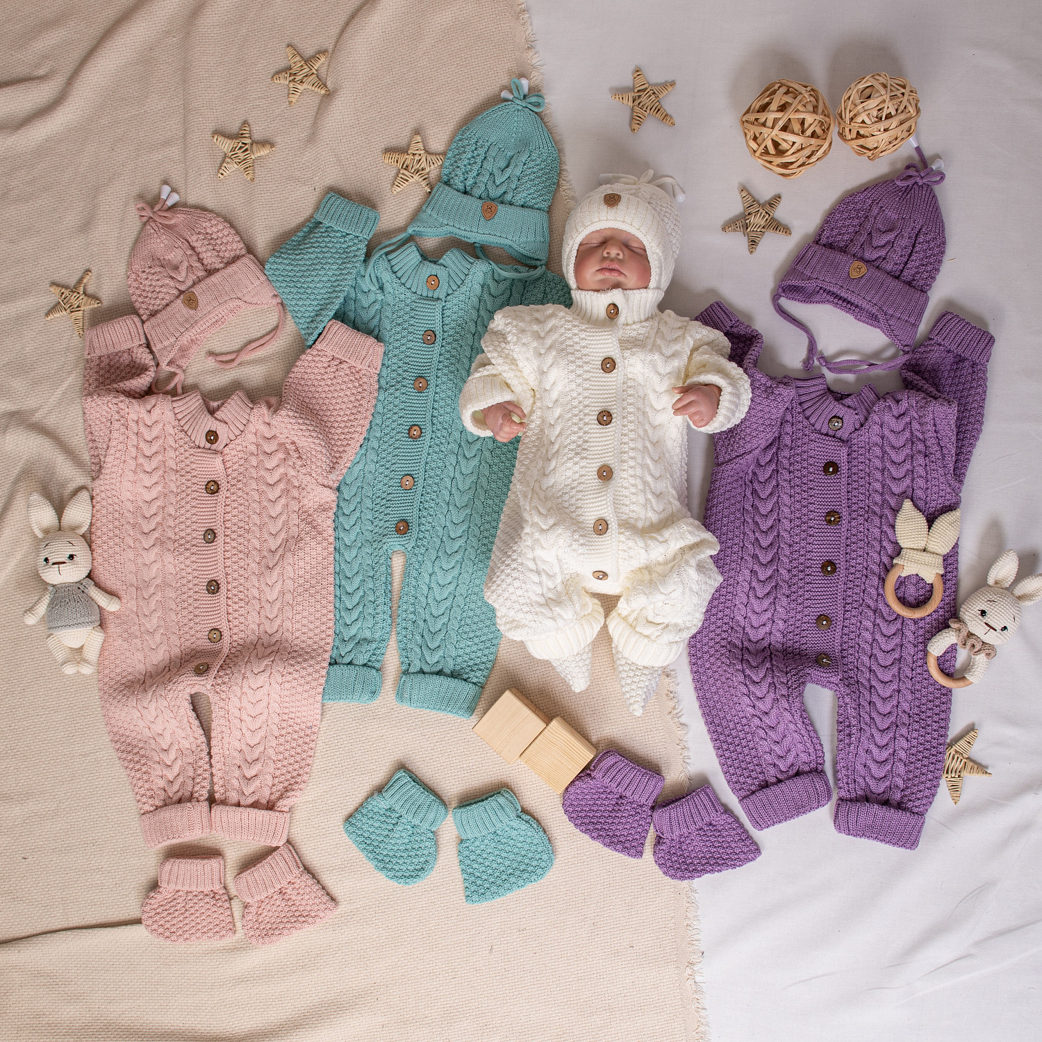 В комплекте комбинезон на пуговицах, шапочка с отворотом и носочки-пинетки.