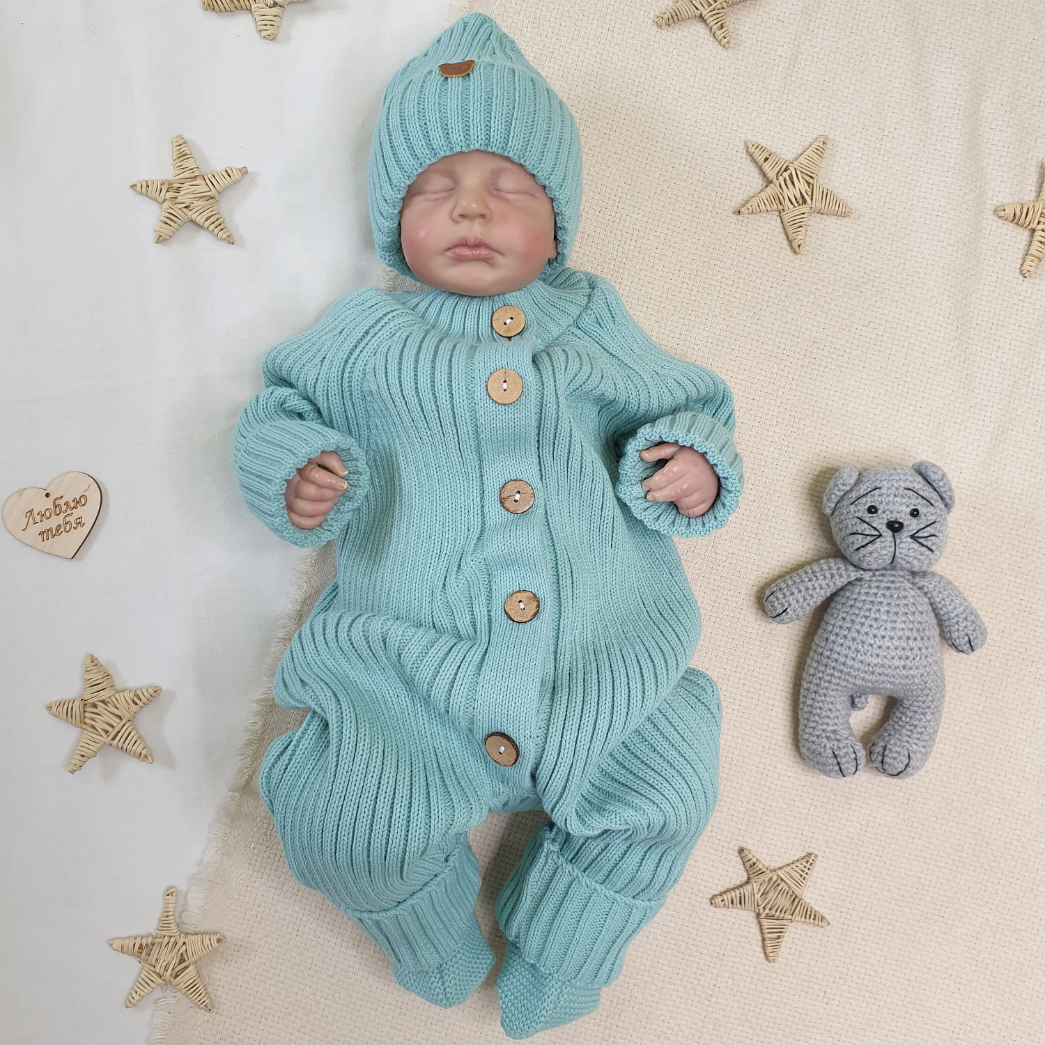 Комбинезон с открытыми ручками и ножками. Отвороты манжет позволяют регулировать длину в зависимости от роста малыша. Кроме того, вязаное полотно в этом комплекте очень хорошо тянется, по размеру подойдёт для малыша ростом от 56 до 70см (от 0 до 6-7 мес). В комплекте шапочка с отворотом.