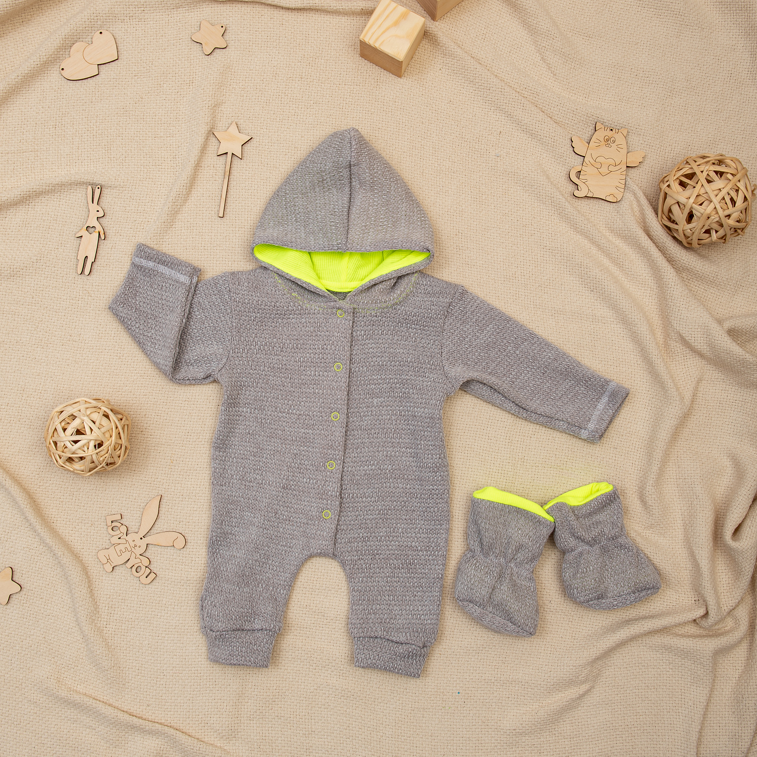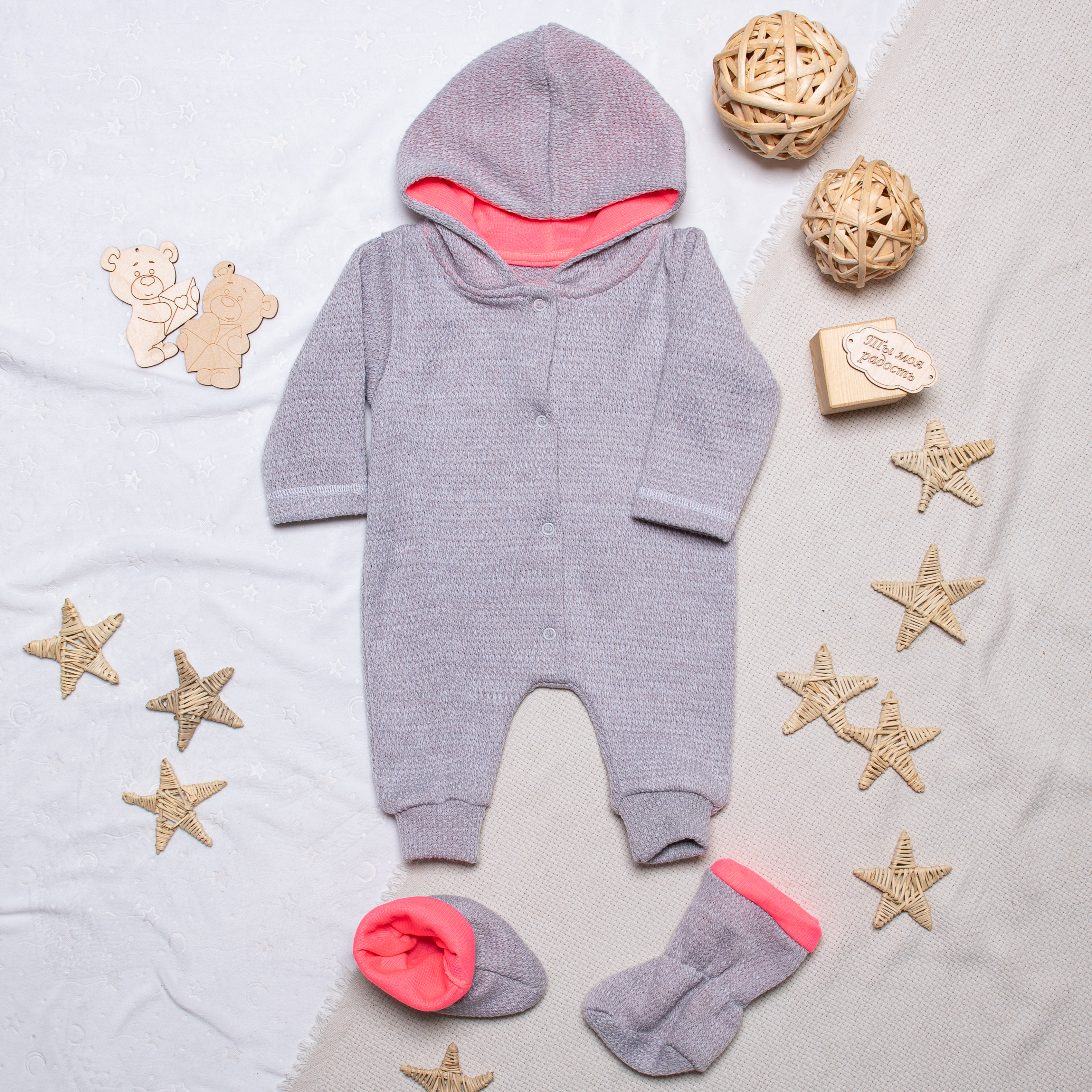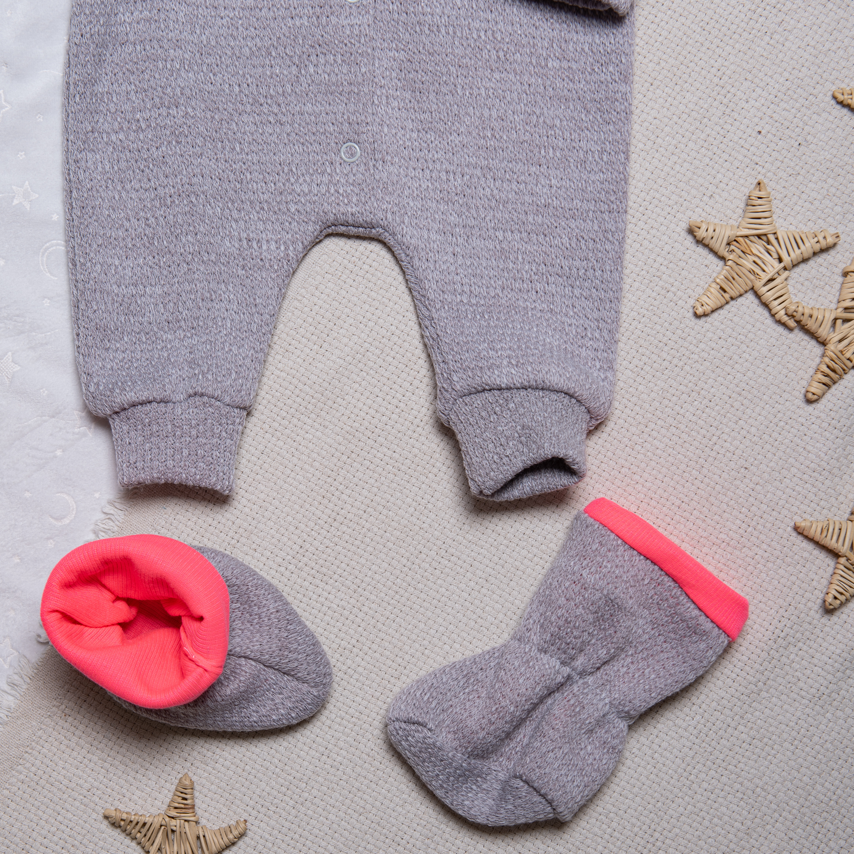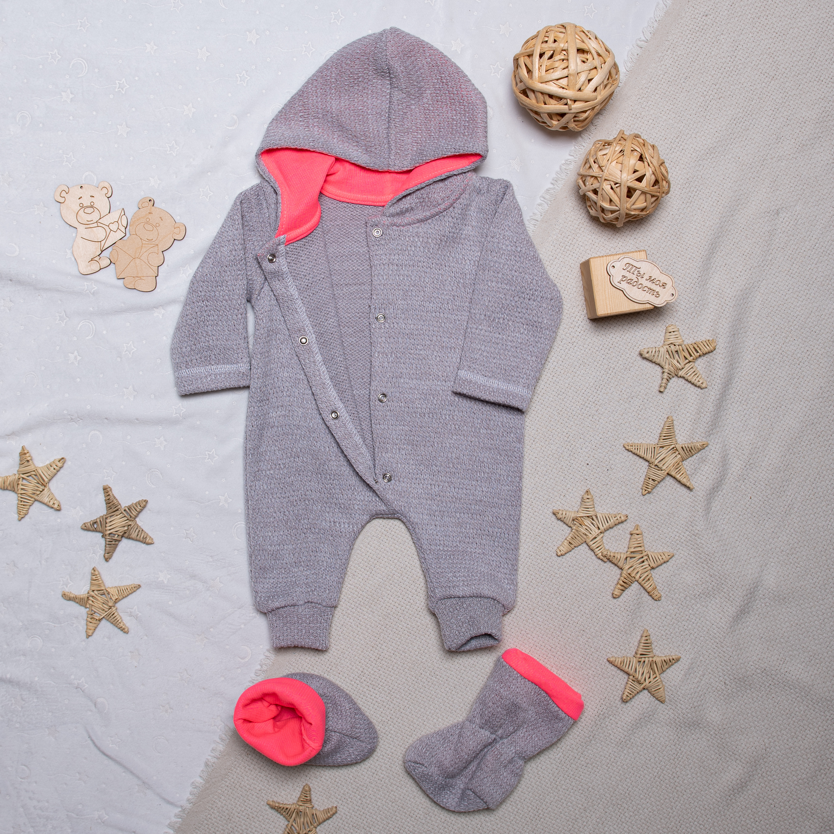 К комбинезону прилагаются пинетки-сапожки на подкладке из яркого кашкорсе.