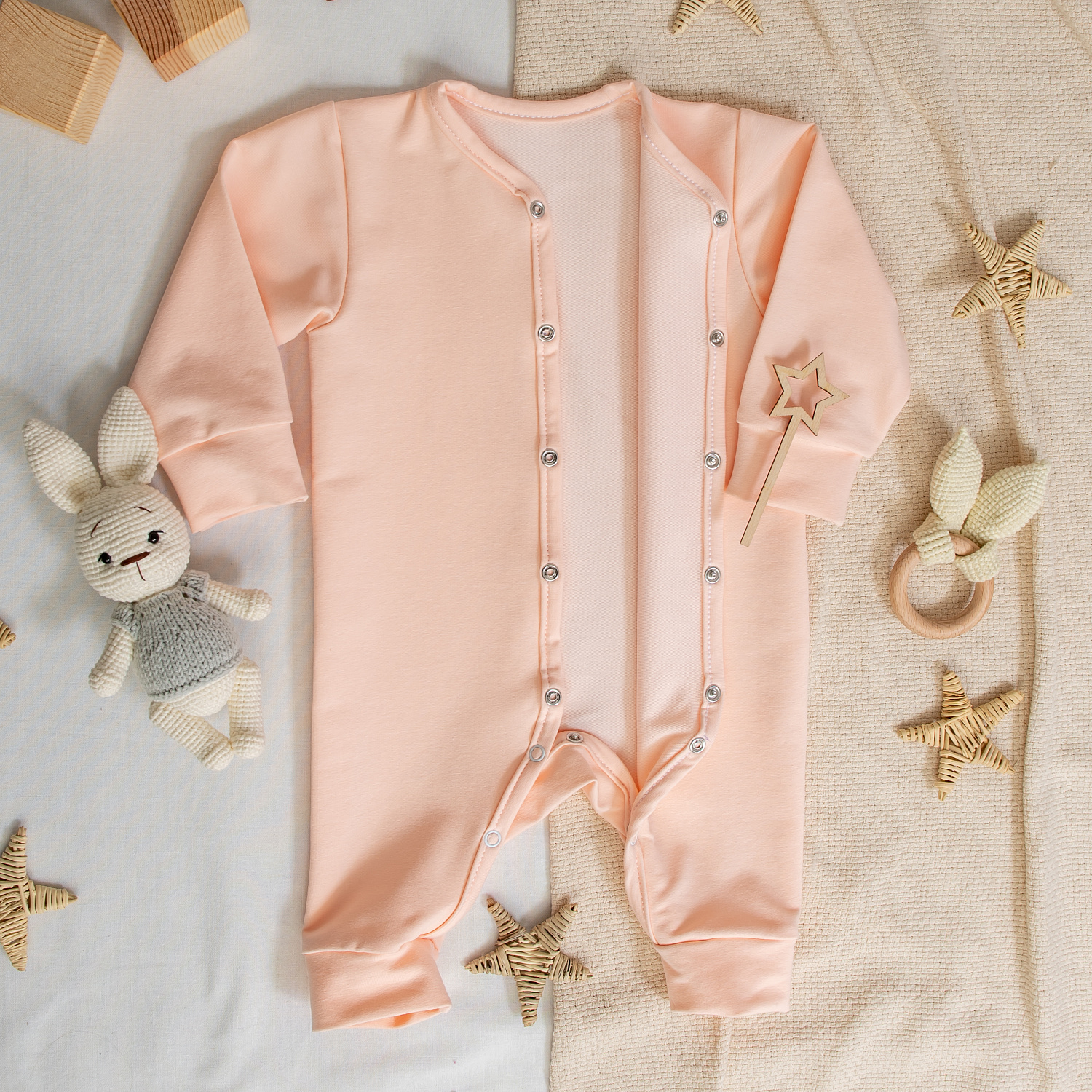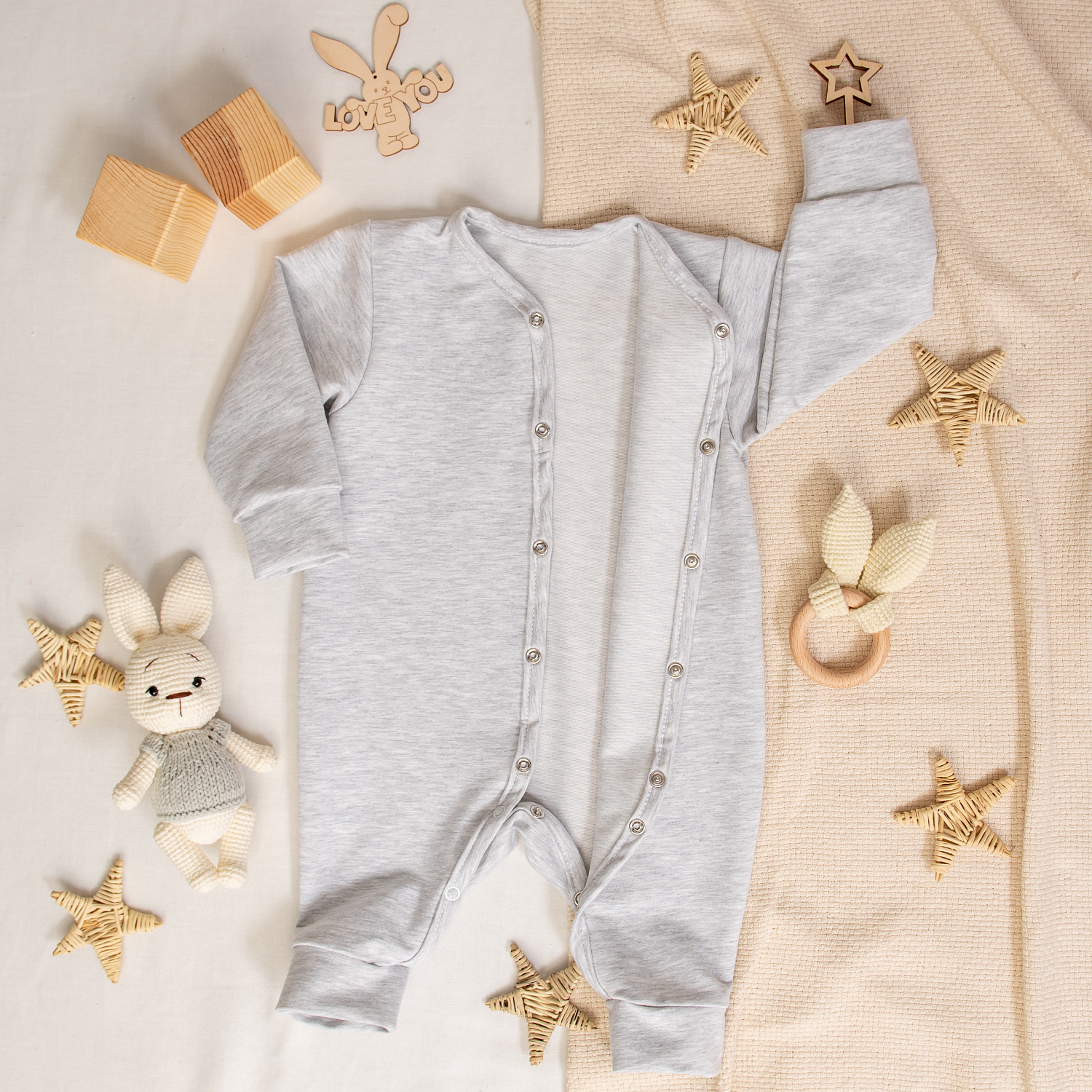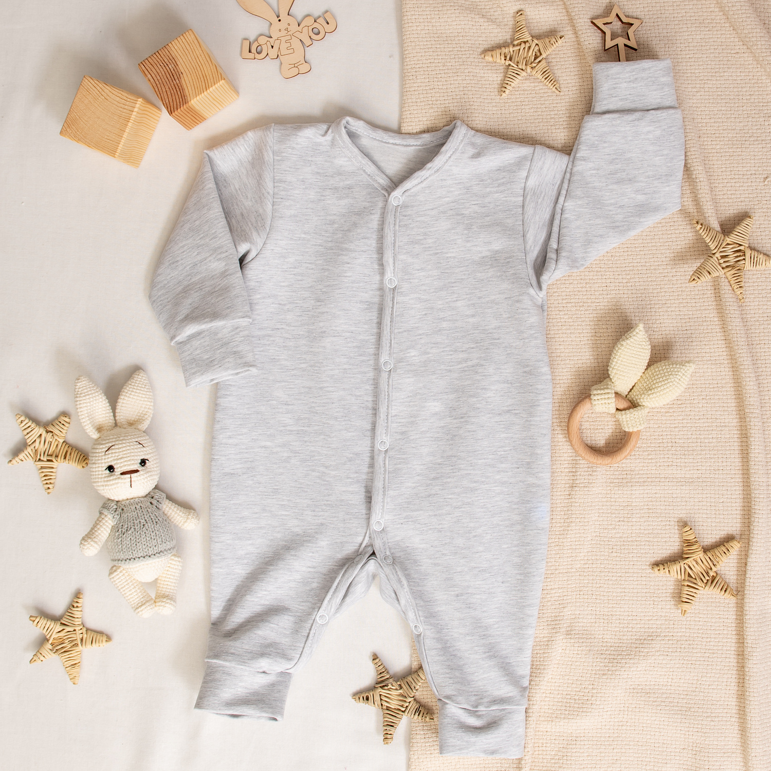 Удобная застёжка на кнопки широко открывает комбинезон, позволяя быстро переодеть малыша.