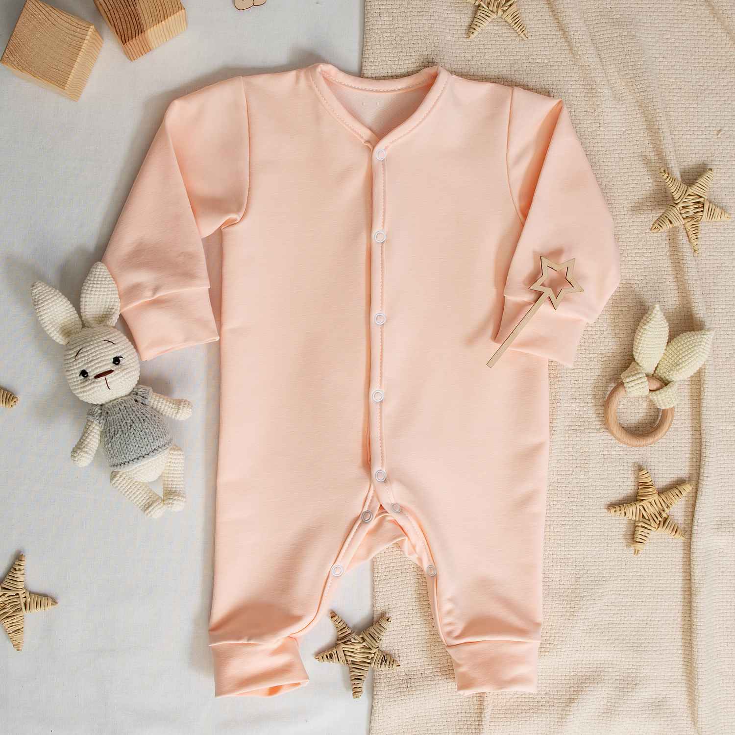 Модель прекрасно подходит малышам, которые уже начинают ползать. Ножки и ручки открытые. Низ рукавов и штанишек с манжетами.