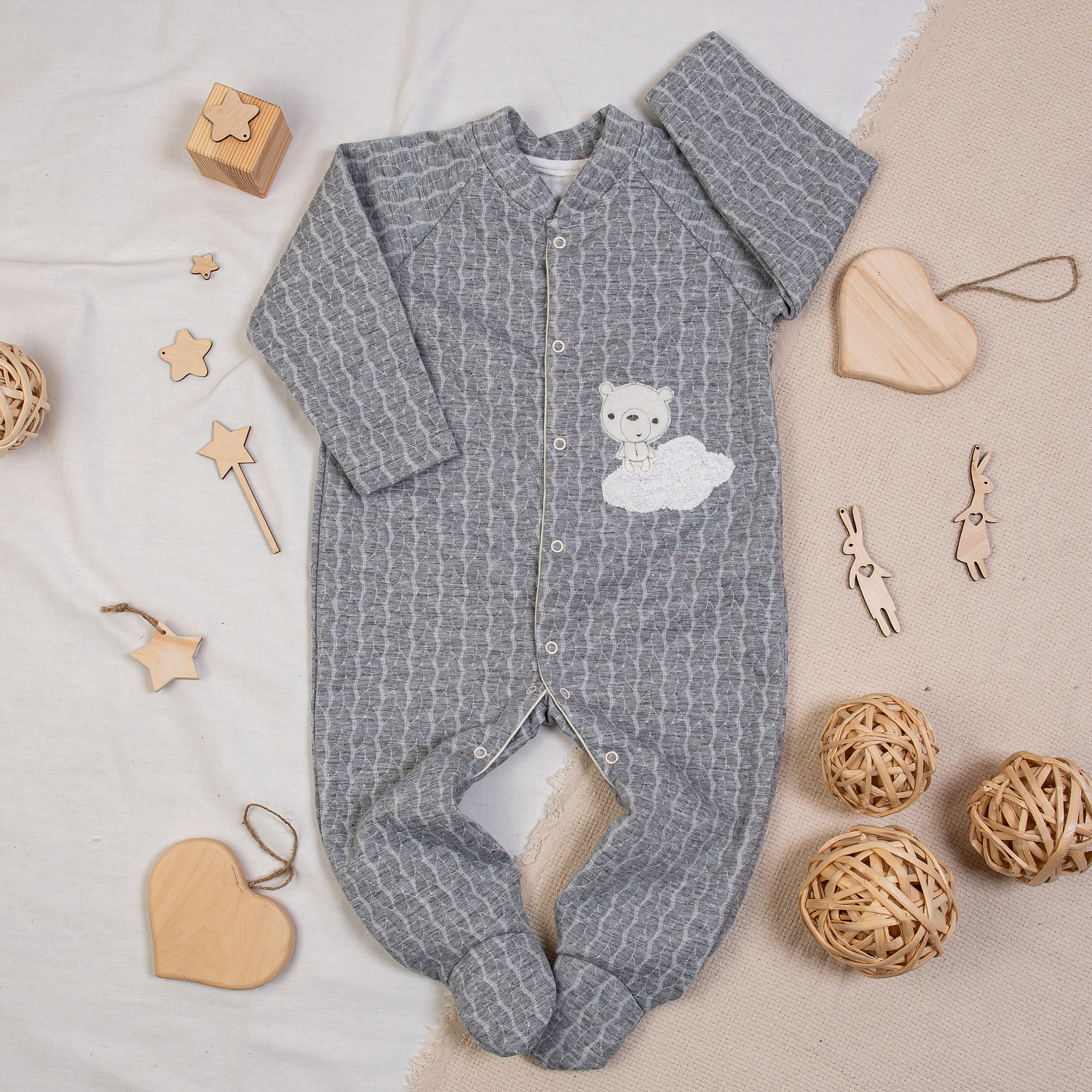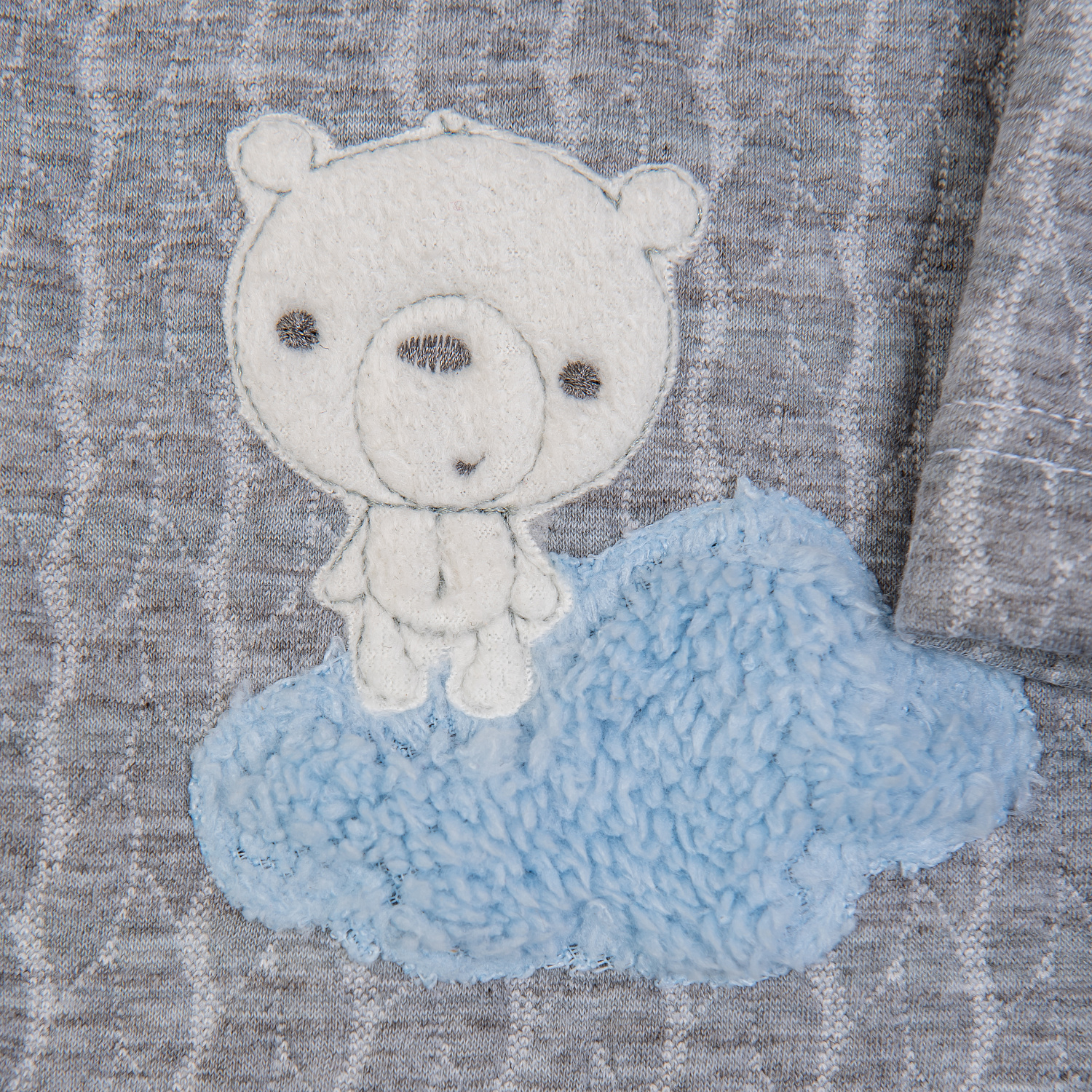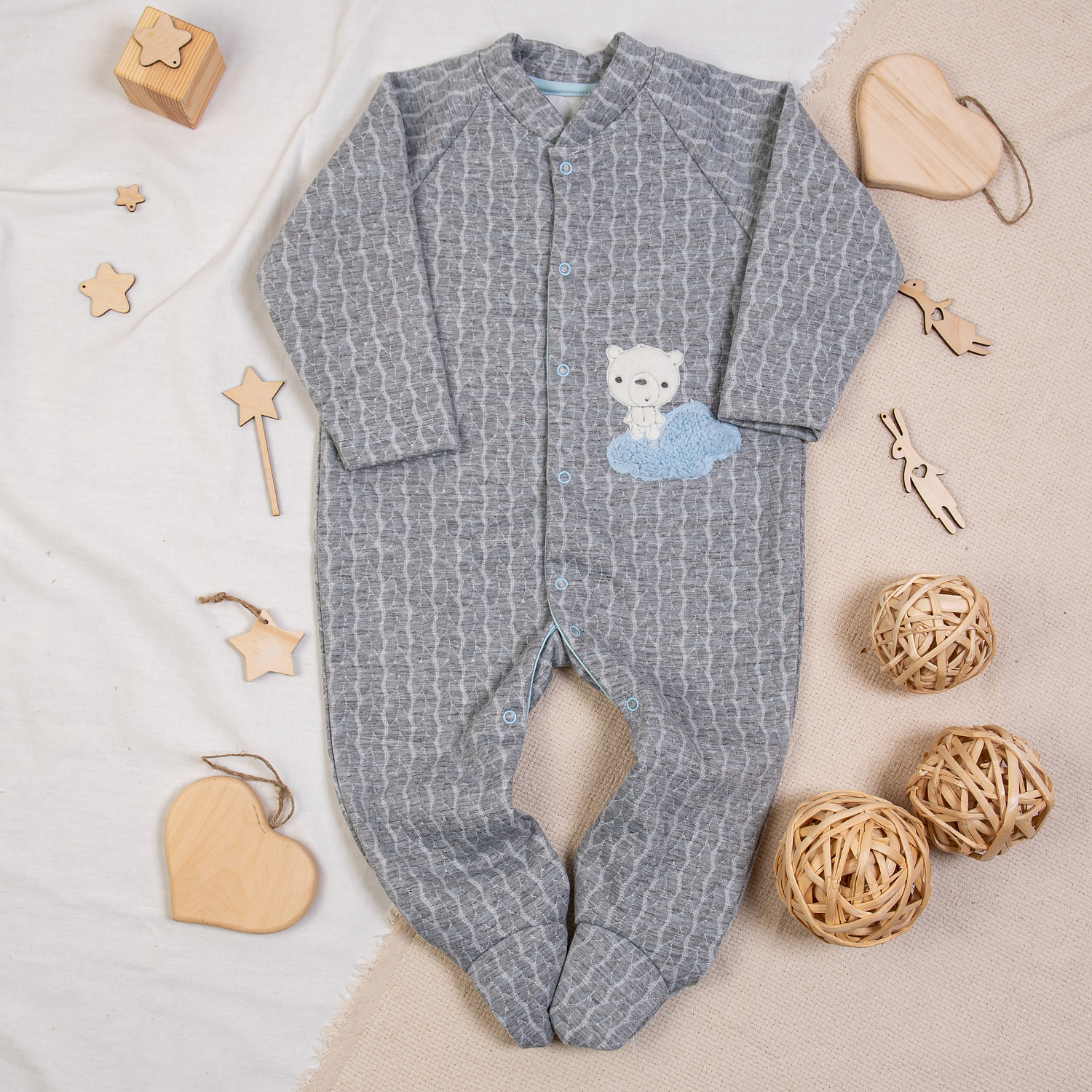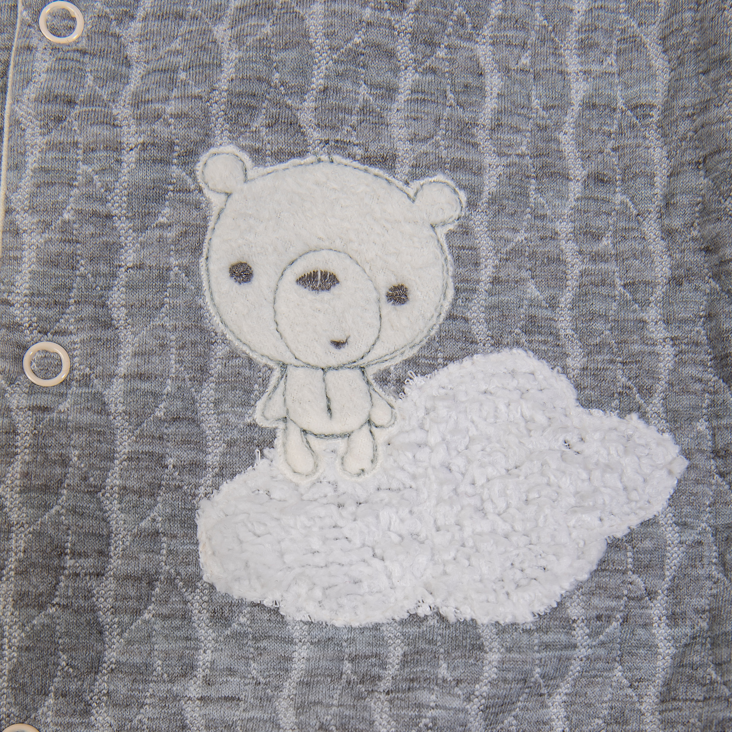 Графичный серый цвет подойдет и мальчику и девочке. Вышивка "мишка на облаке" выполнена в голубом, розовом или молочном цвете.