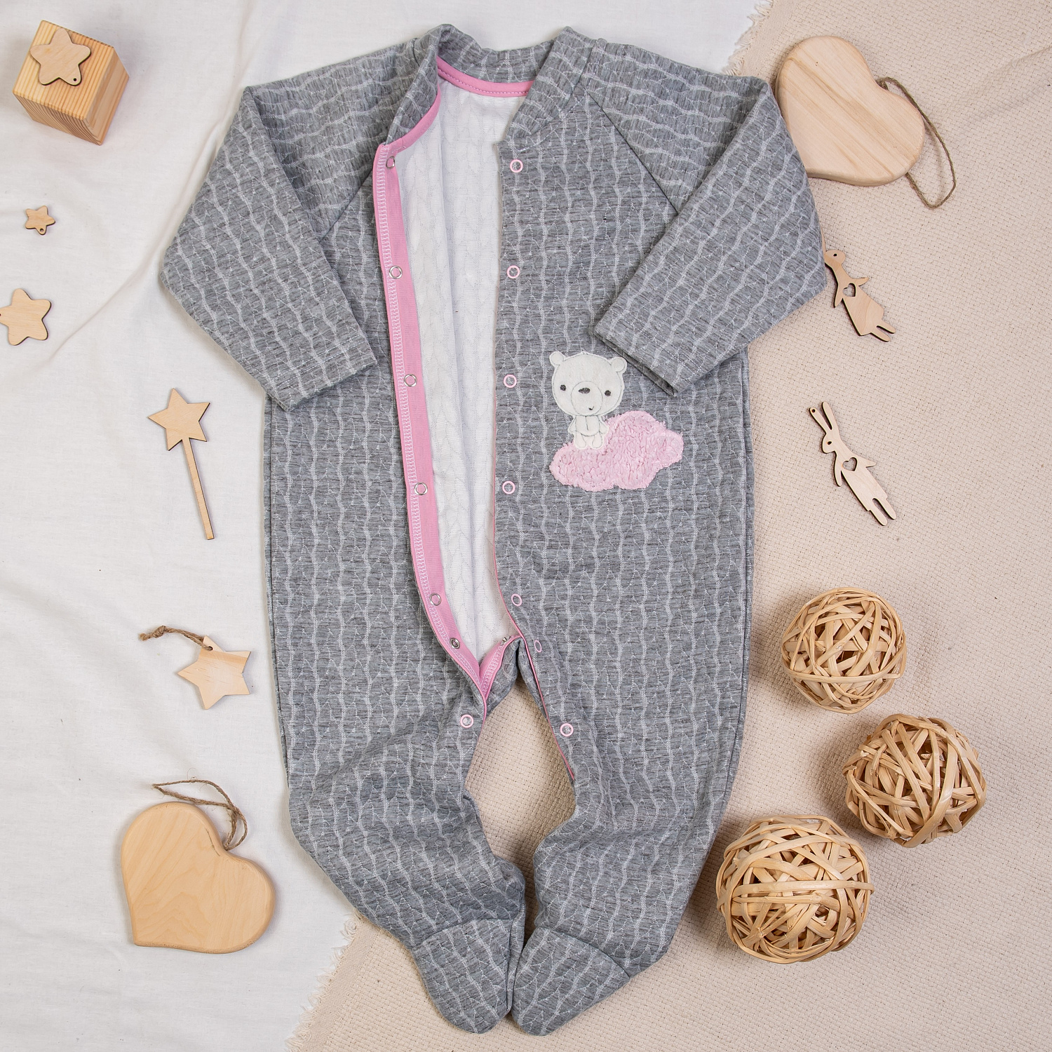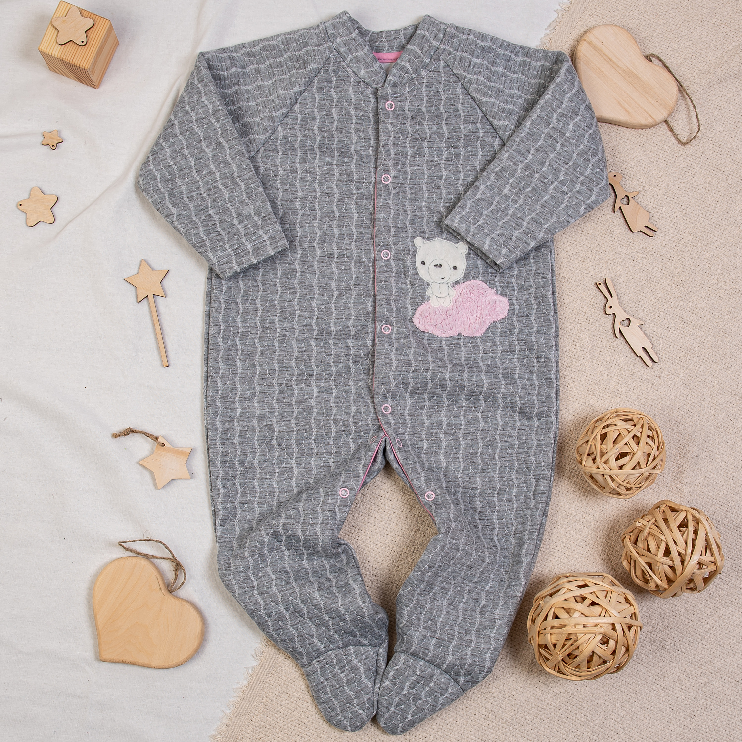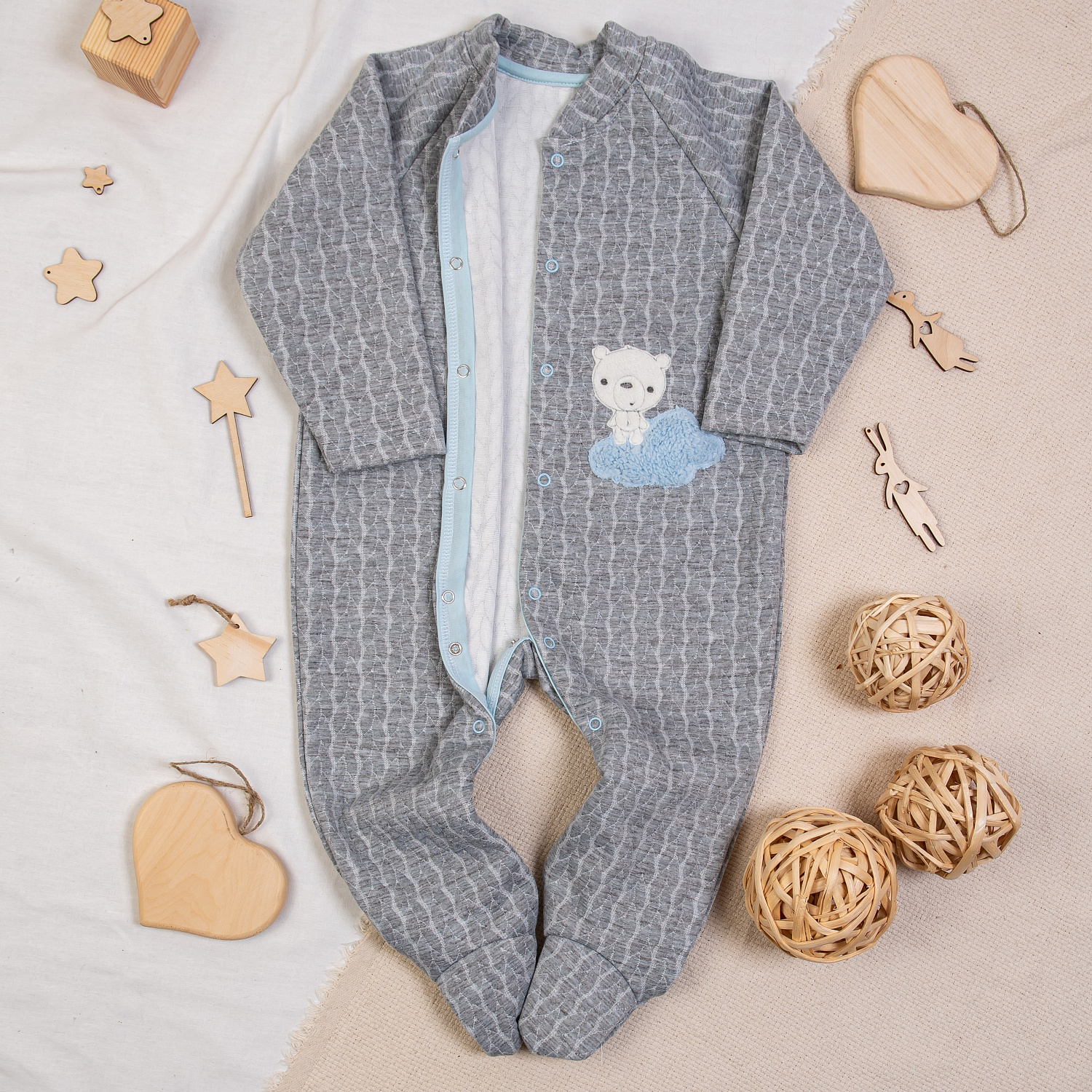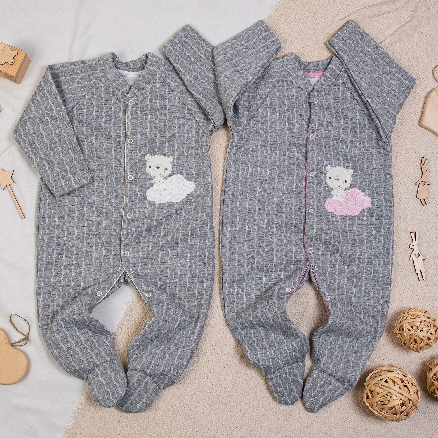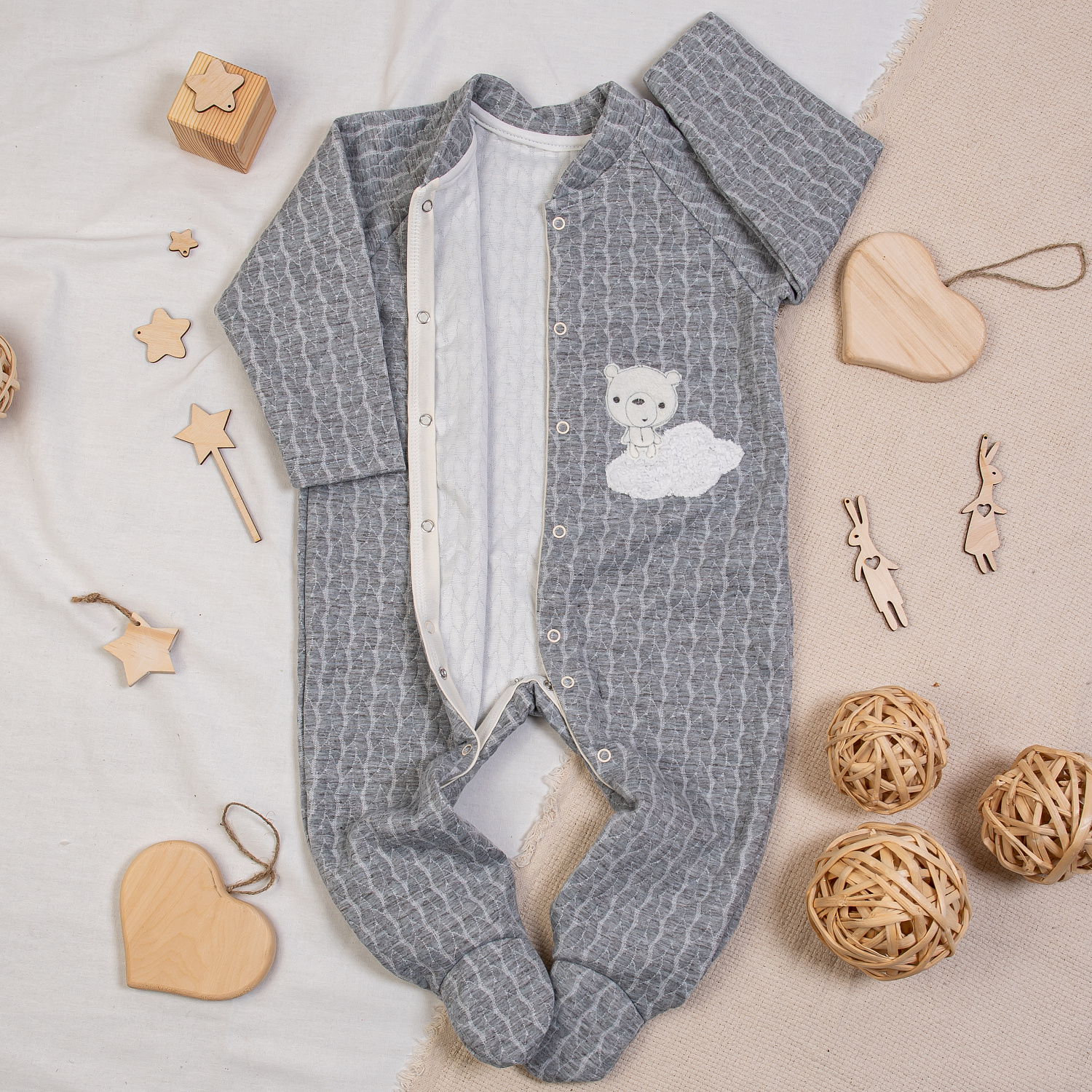 Графичный серый цвет подойдет и мальчику и девочке. Вышивка "мишка на облаке" выполнена в голубом, розовом или молочном цвете.