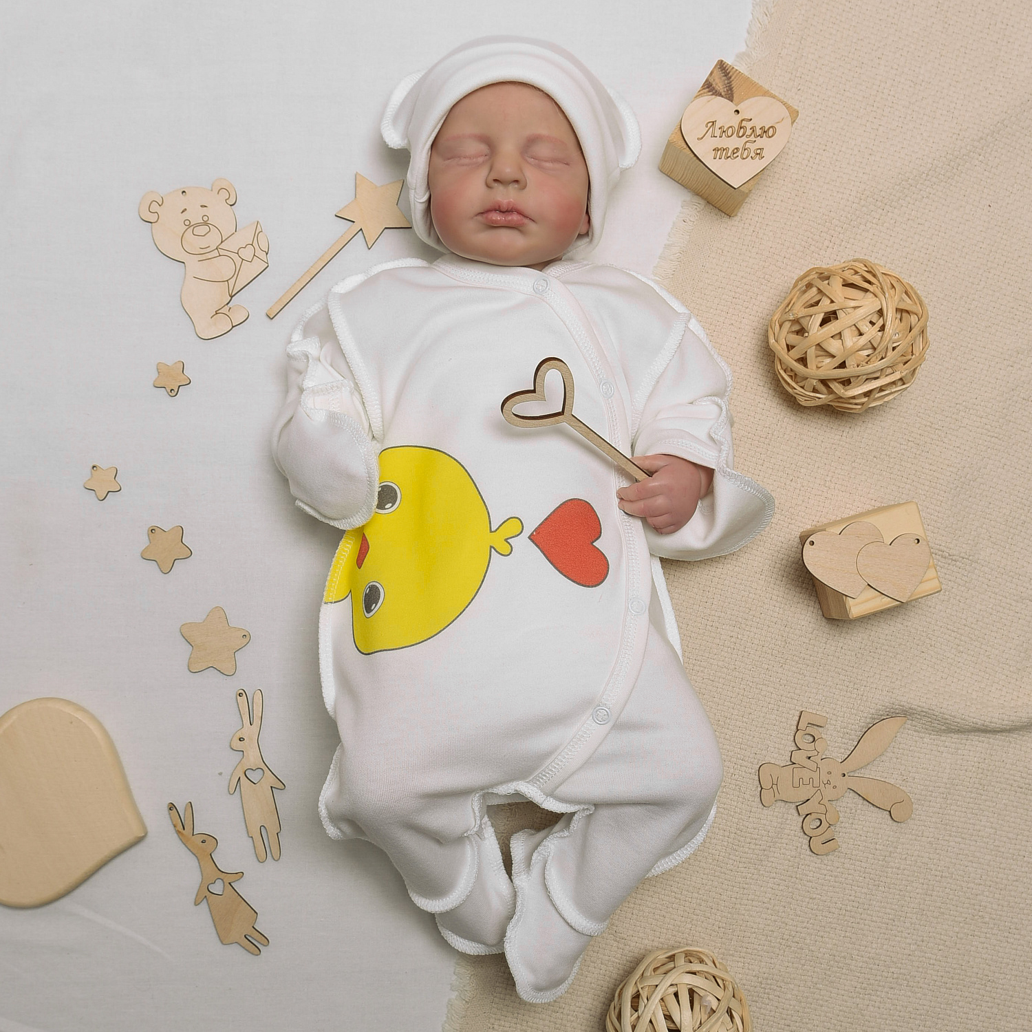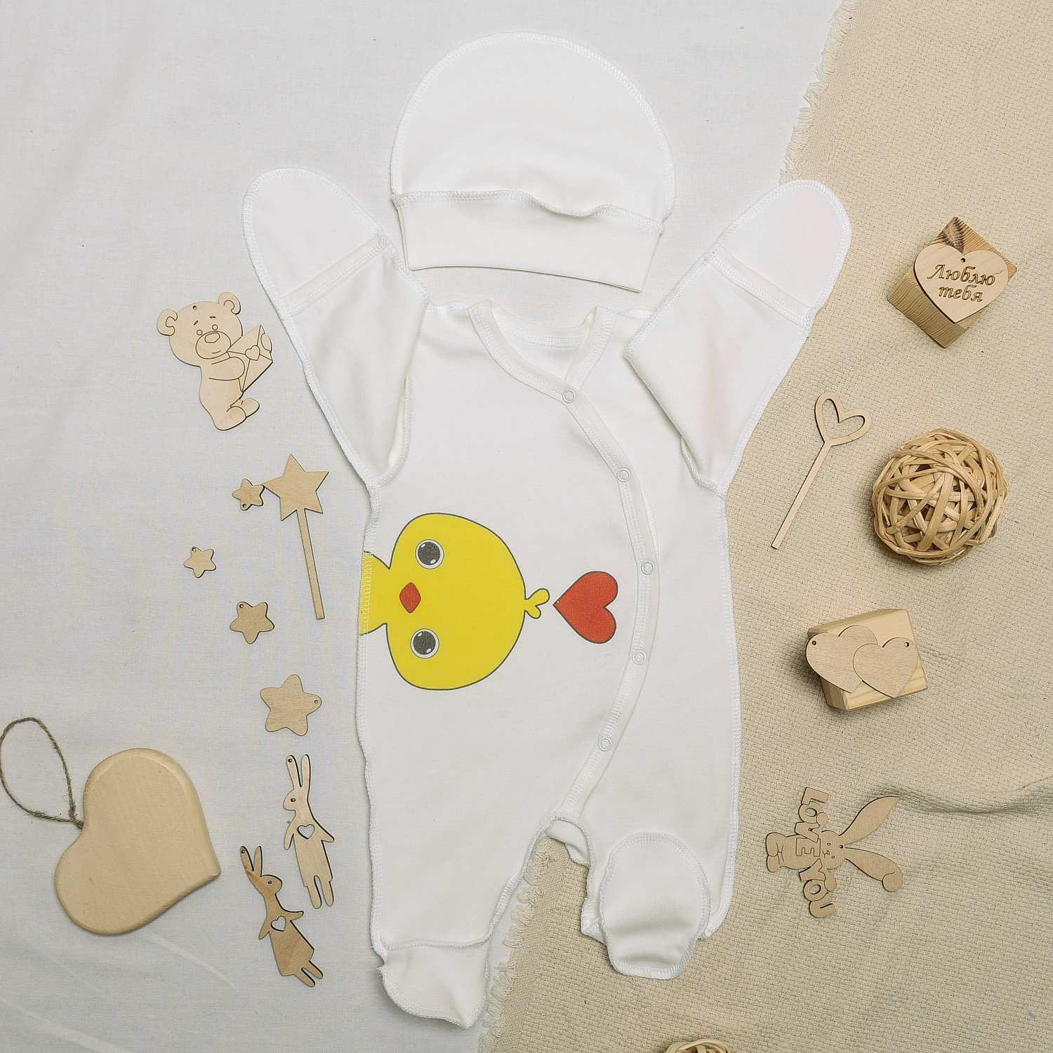 №М-497 Комбинезон с шапочкой на кнопках с принтом цыпленок