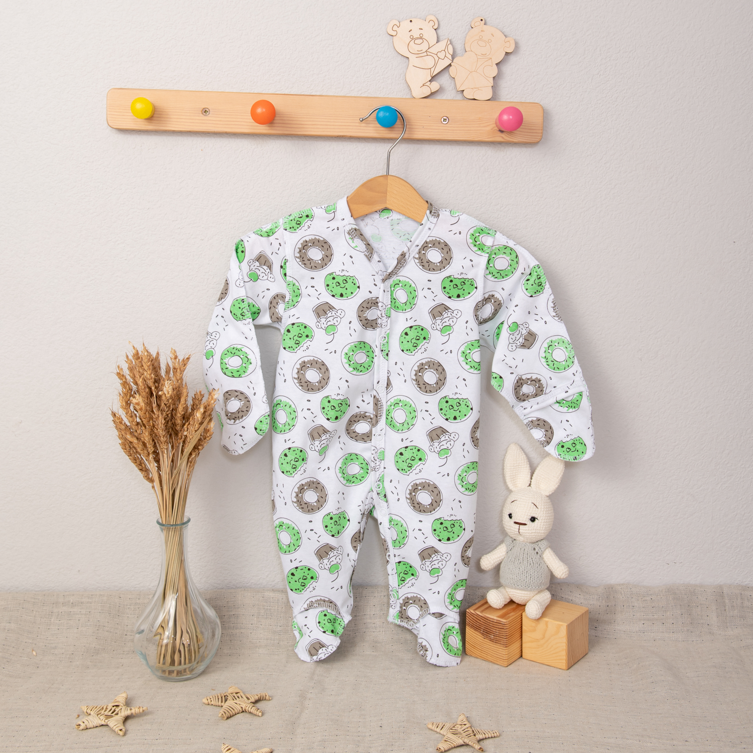 М-519 Комбинезон-слип "Зайчик" выполнен из кулирки набивки, снабжен рукавичками-антицарапками и закрытой ножкой, вид застежки - кнопки,