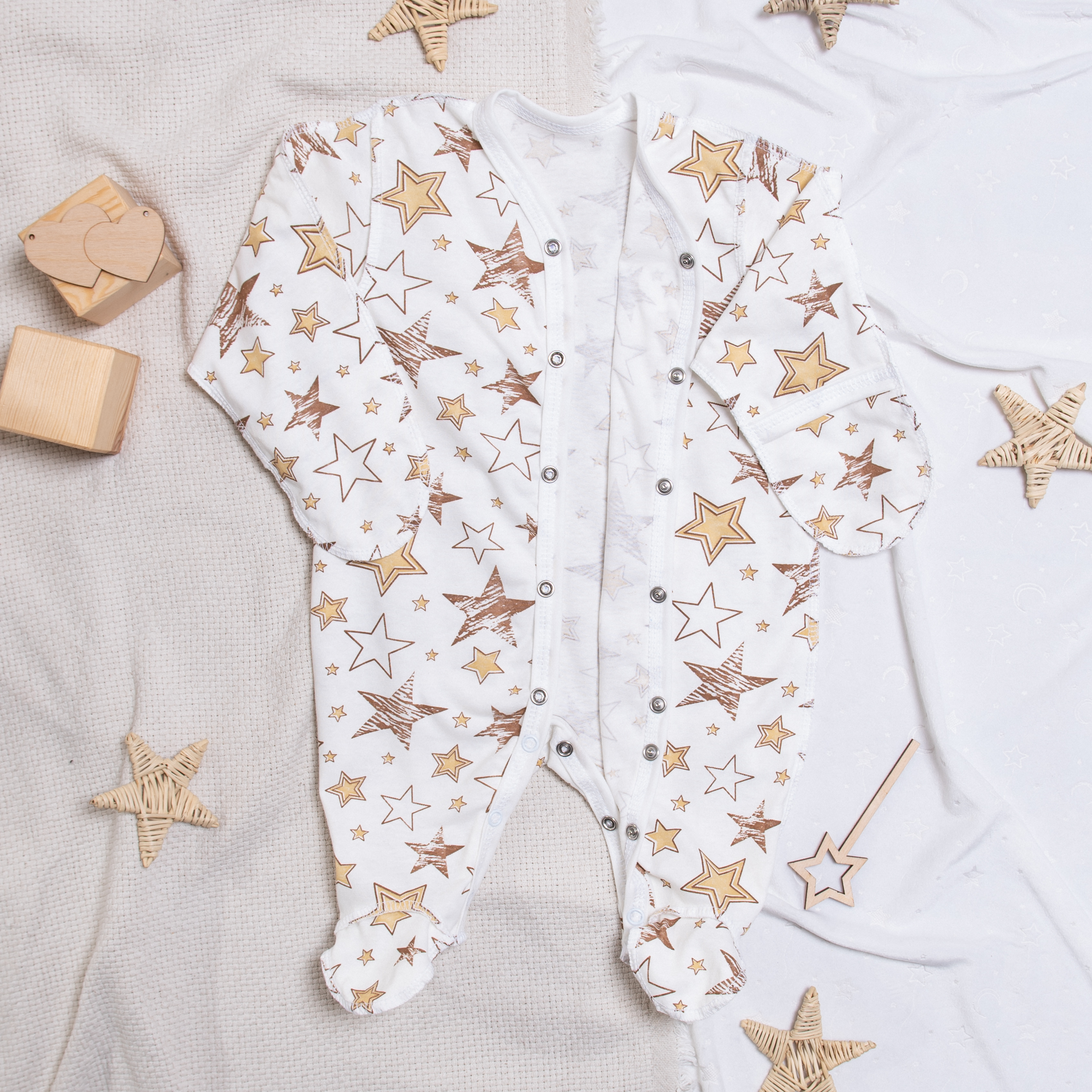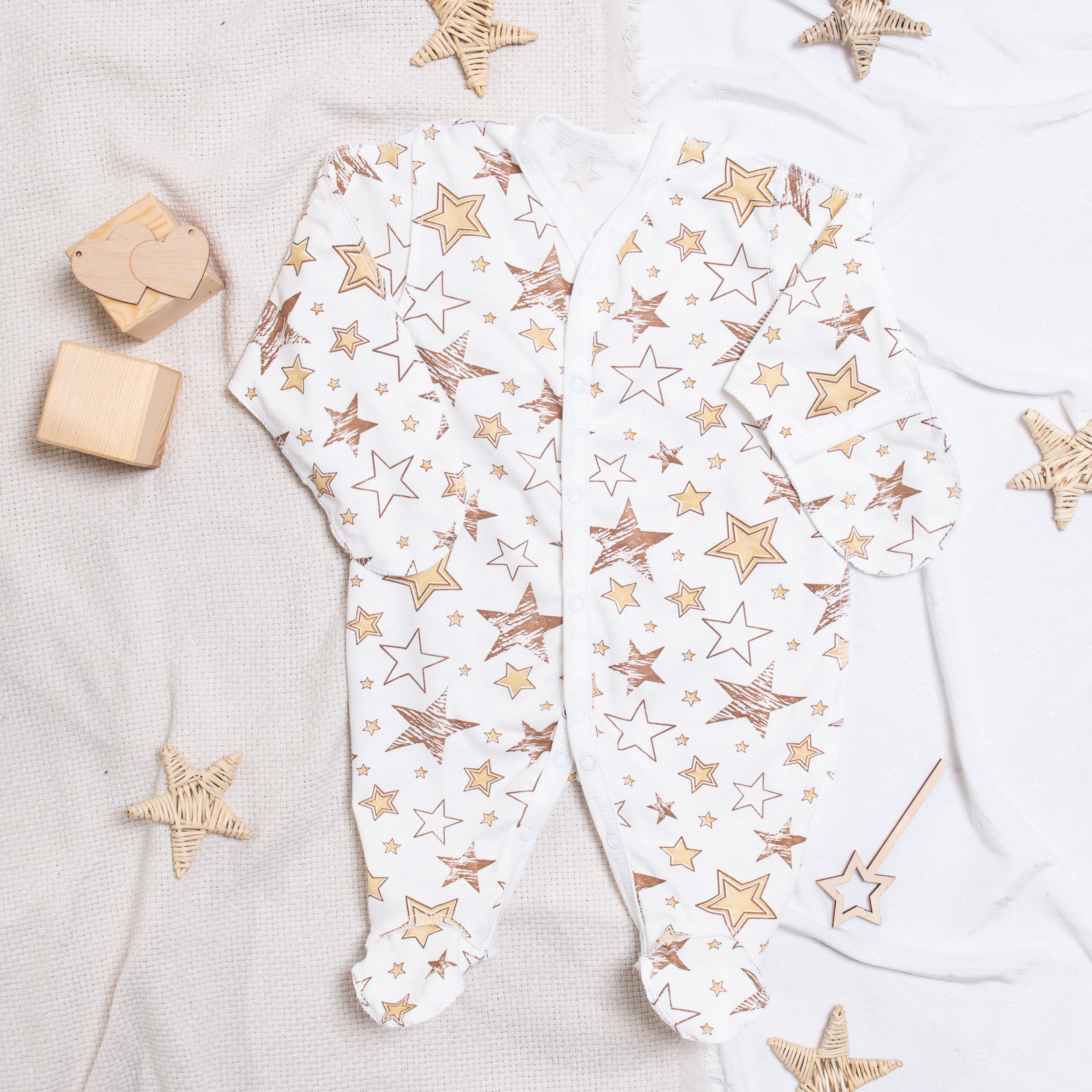 М-519 Комбинезон-слип "Звезды" выполнен из кулирки набивки, снабжен рукавичками-антицарапками и закрытой ножкой, вид застежки - кнопки,