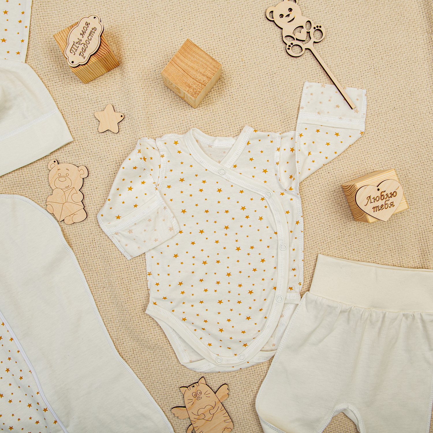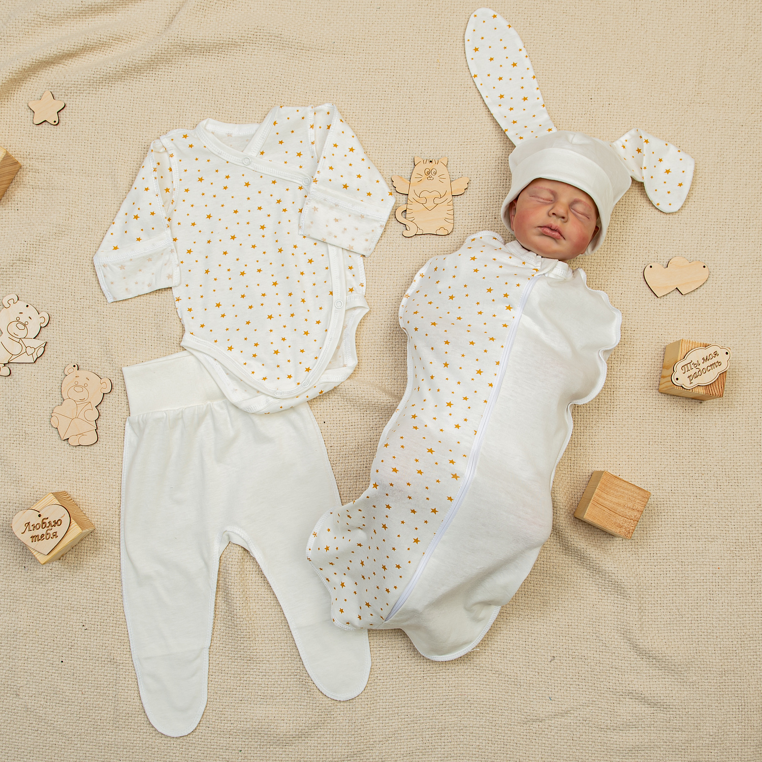 Комплект выполнен из 100% хлопка, подходит для выписку, прогулки или просто для ежедневной носки, так же и в качестве подарка.