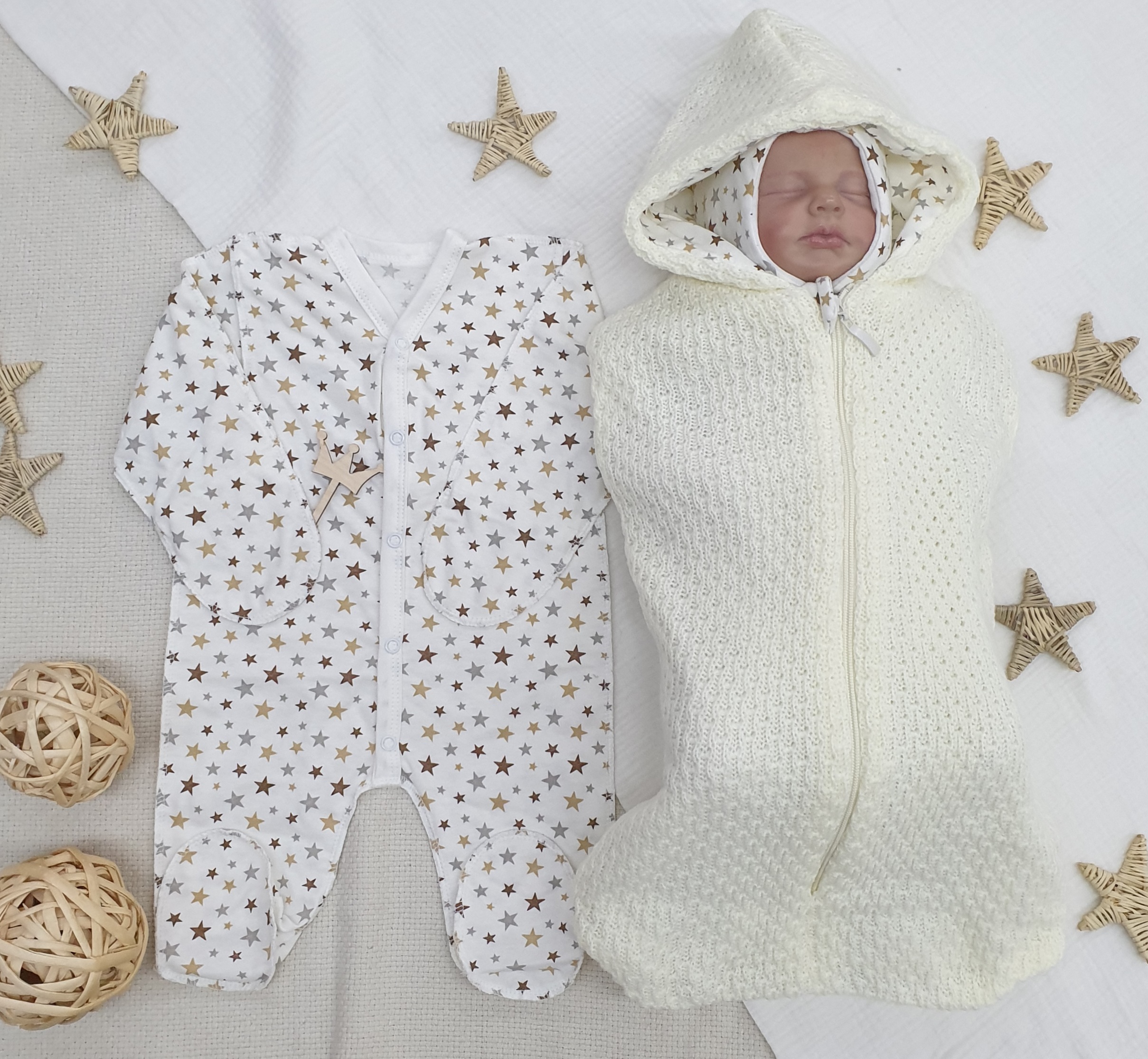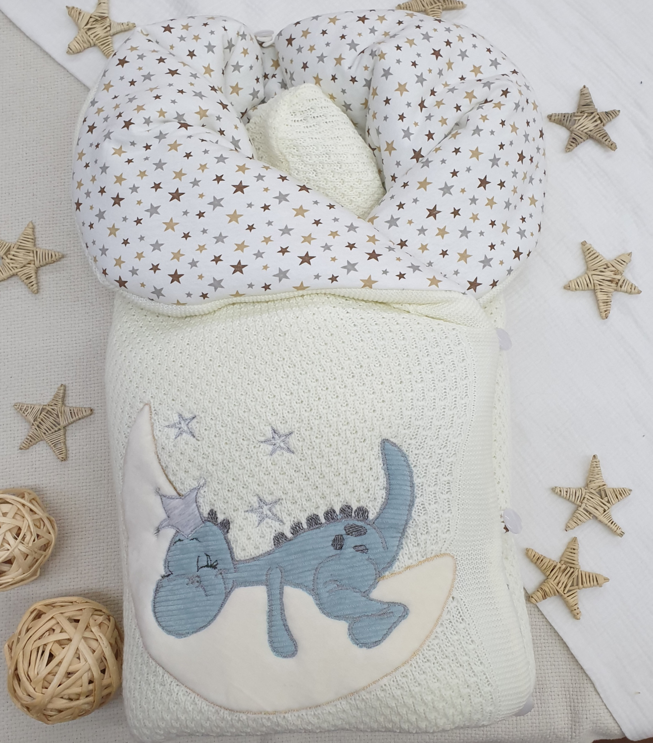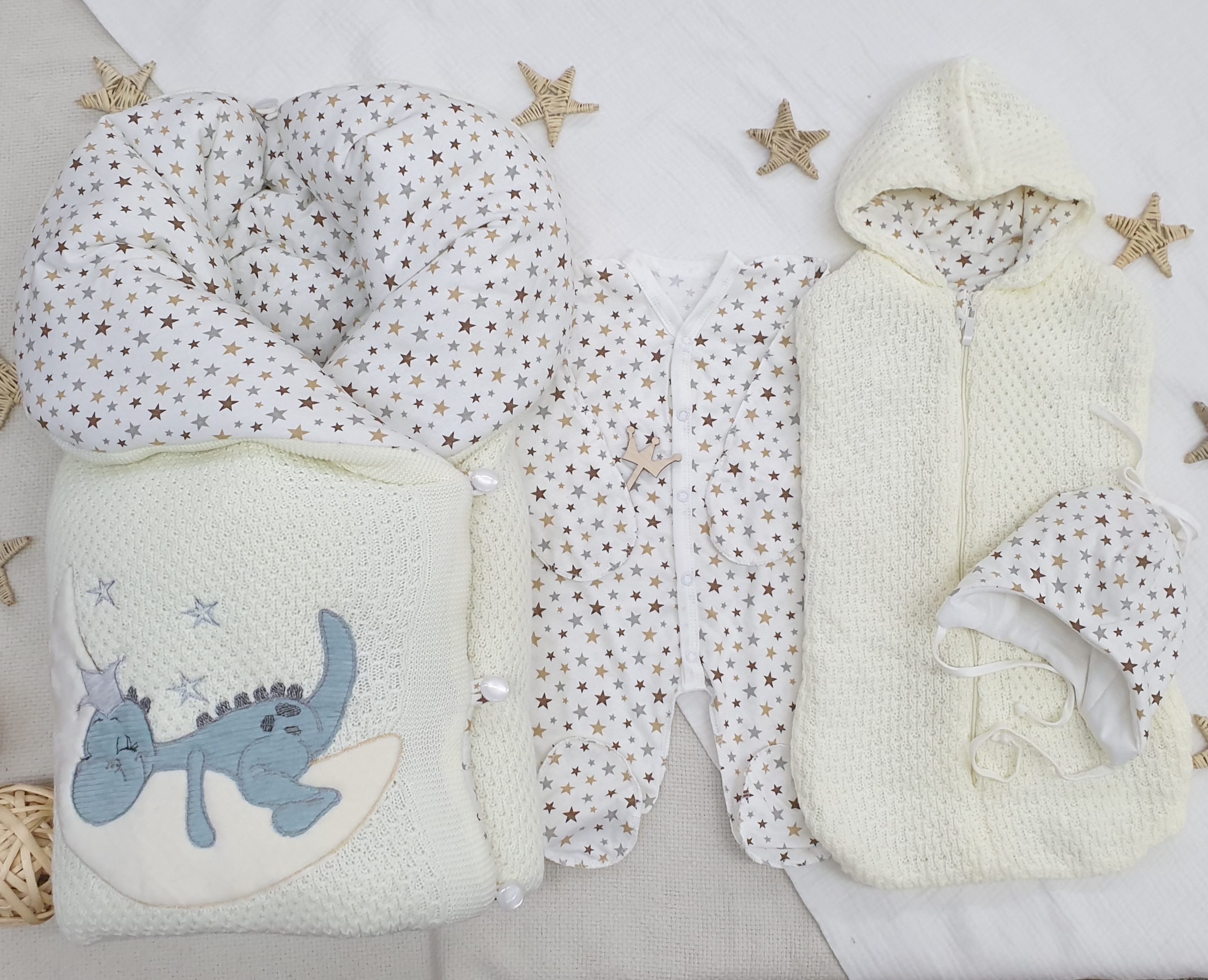 Арт 457 Комплект на выписку "Дино на луне". Его нежный молочный оттенок и милое изображение Дино-символа нового года делают его идеальным для вашего выбора ! Этот комплект выполнен из качественной вязки и внутренней ткани кулирного трикотажа 100% хлопка, размером одеялко 90х90 см +-5см, что обеспечивает комфорт и мягкость, можно в дальнейшем использовать как полноценное одеяло. В качестве утеплителя использован современный и гипоаллергенный материал холстон, плотностью 200 гр/ кв.м. в 2 слоя. Комплектация включает в себя все самое необходимое: На первый слой хлопковый слип "звездочки" на кнопках. Ручки-трансформер, ножки закрытые. Вязаная пеленка-кокон на молнии с капюшоном и теплая шапочка на завязках.