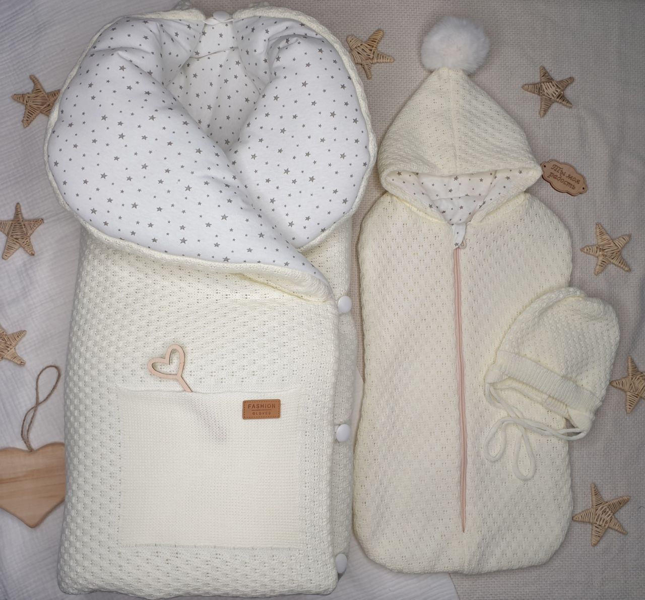 1. Одеяло вязанное на 4 пуговицах, р-р 90*90 (+-5 см), подклад кулирка набивка + холстон 200 гр/м, наличие кармана с нашивкой;