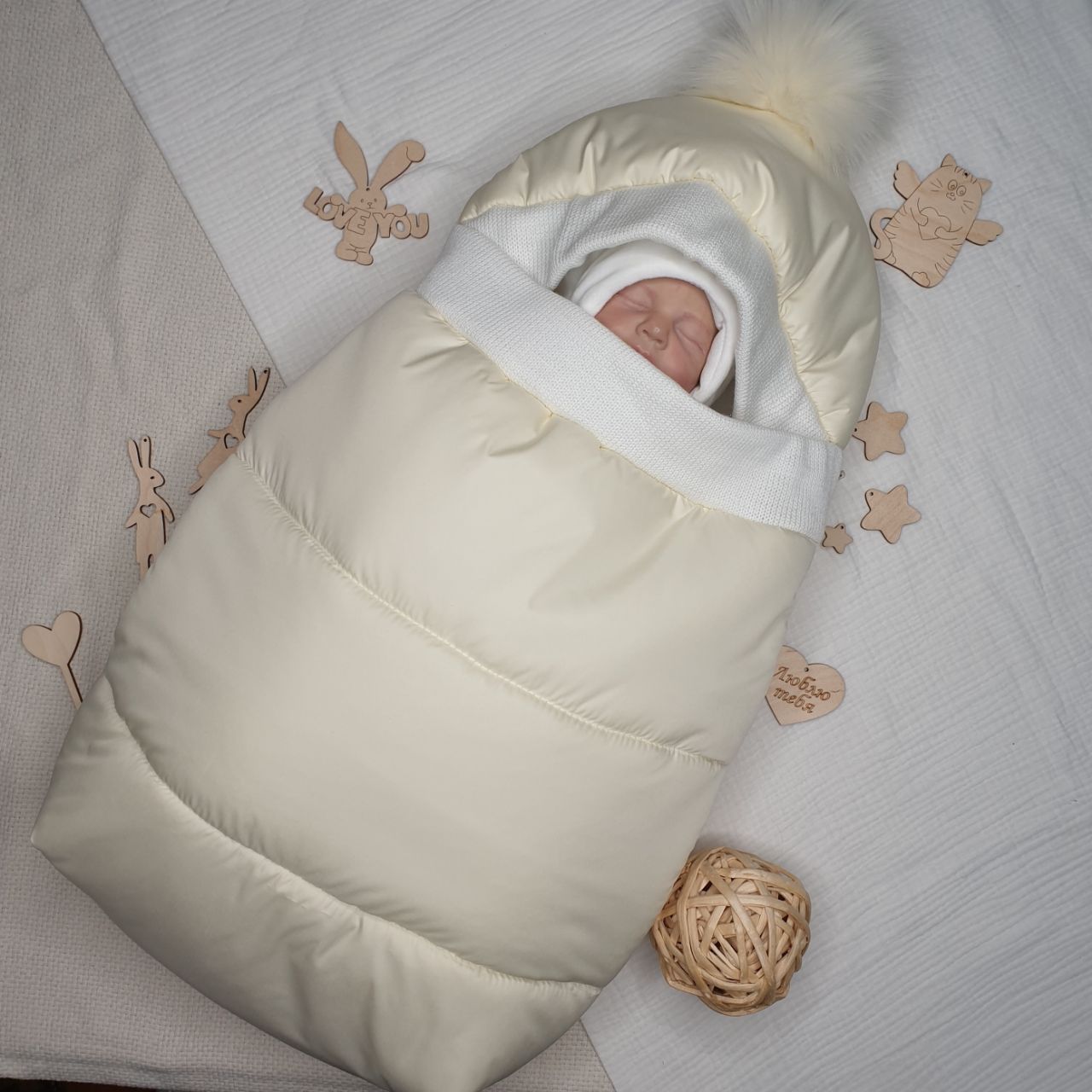 Конверт-кокон на молнии, утеплённый, с капюшоном. Молния широко открывает конверт, позволяя легко и быстро собирать малыша на прогулку. Глубокий капюшон защищает ребенка от ветра и шума улицы. Ткань верха дюспо - очень практичный не продуваемый материал. Внутри - мягкий тёплый флис. В качестве утеплителя мы используем современный гипоаллергенный холстон. Ещё более притягательной эту модель делает отделка из вязаного полотна и забавный помпон на капюшоне.
