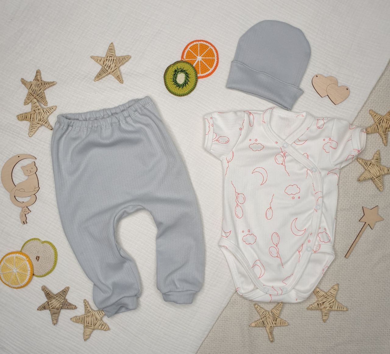 Костюм "Шарик" боди (розовый, голубой ) + штаны на манжетиках (серые) + шапочка (серая),