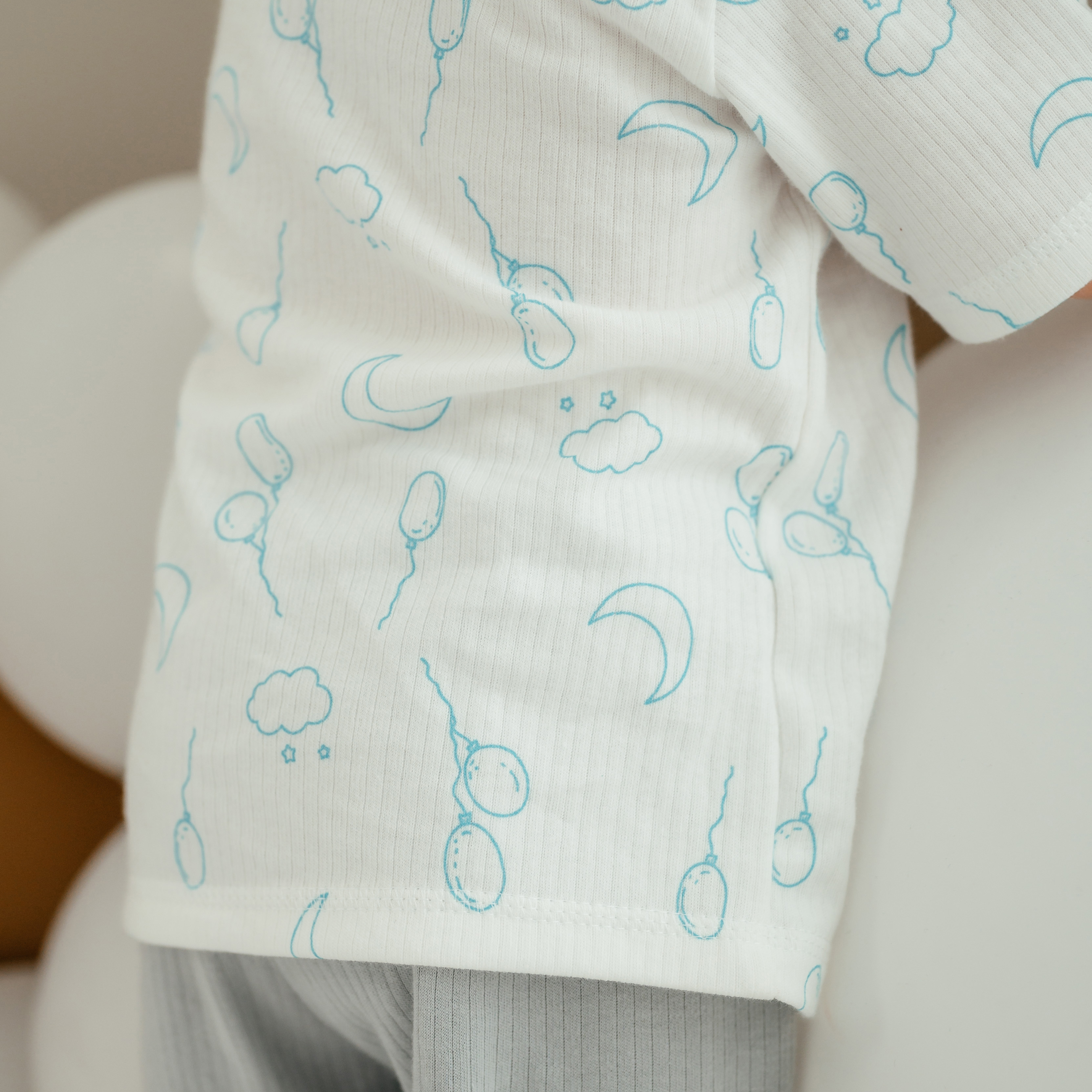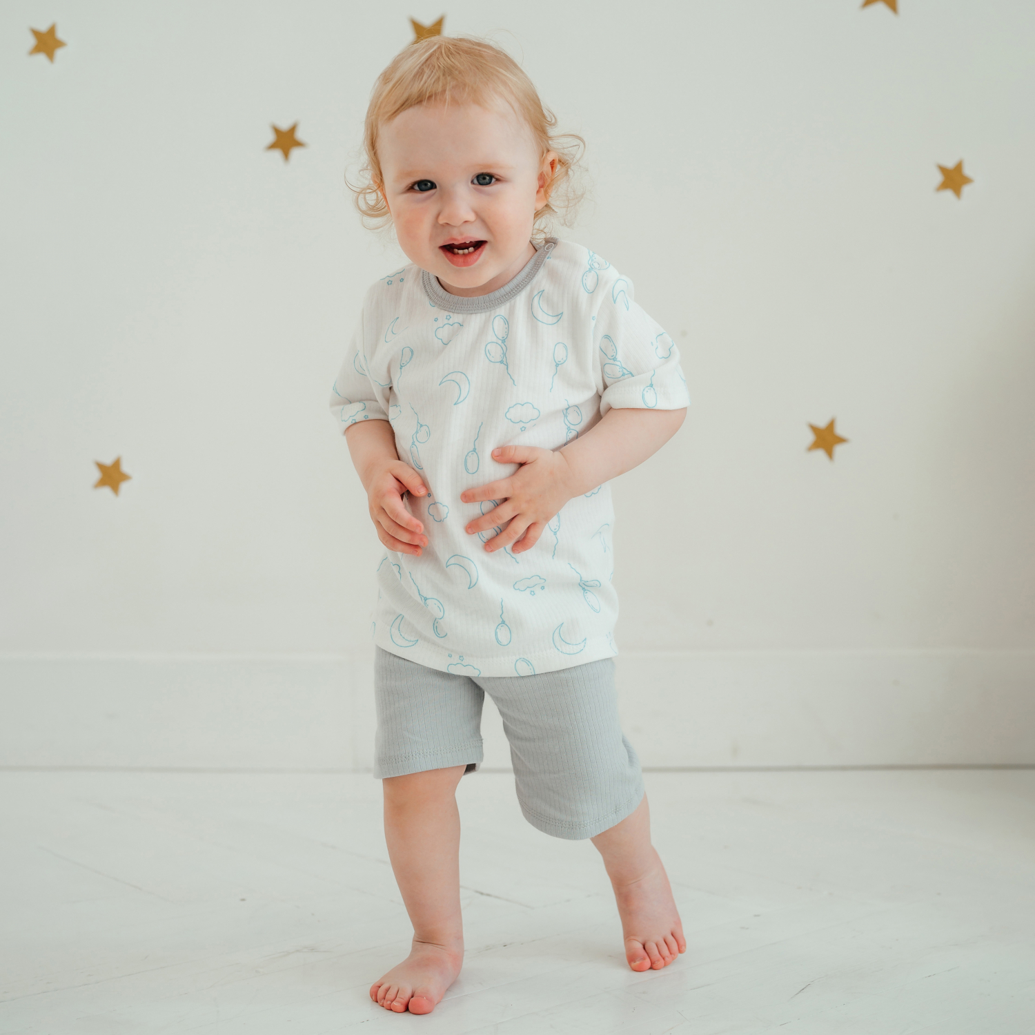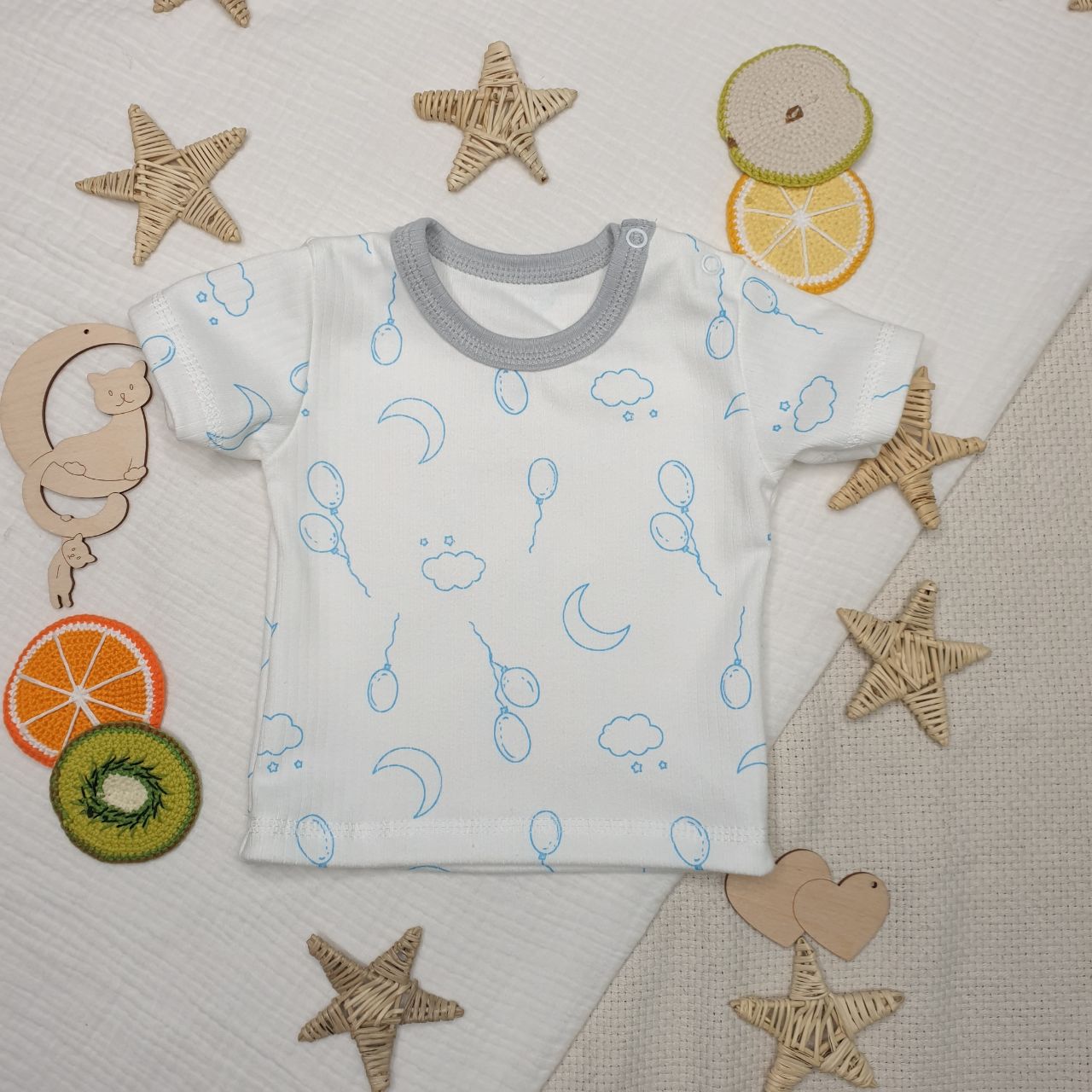 Футболка с двумя кнопочками на плече для удобства продевания головы ребёнка. Рукава короткие. Горловина окантована.