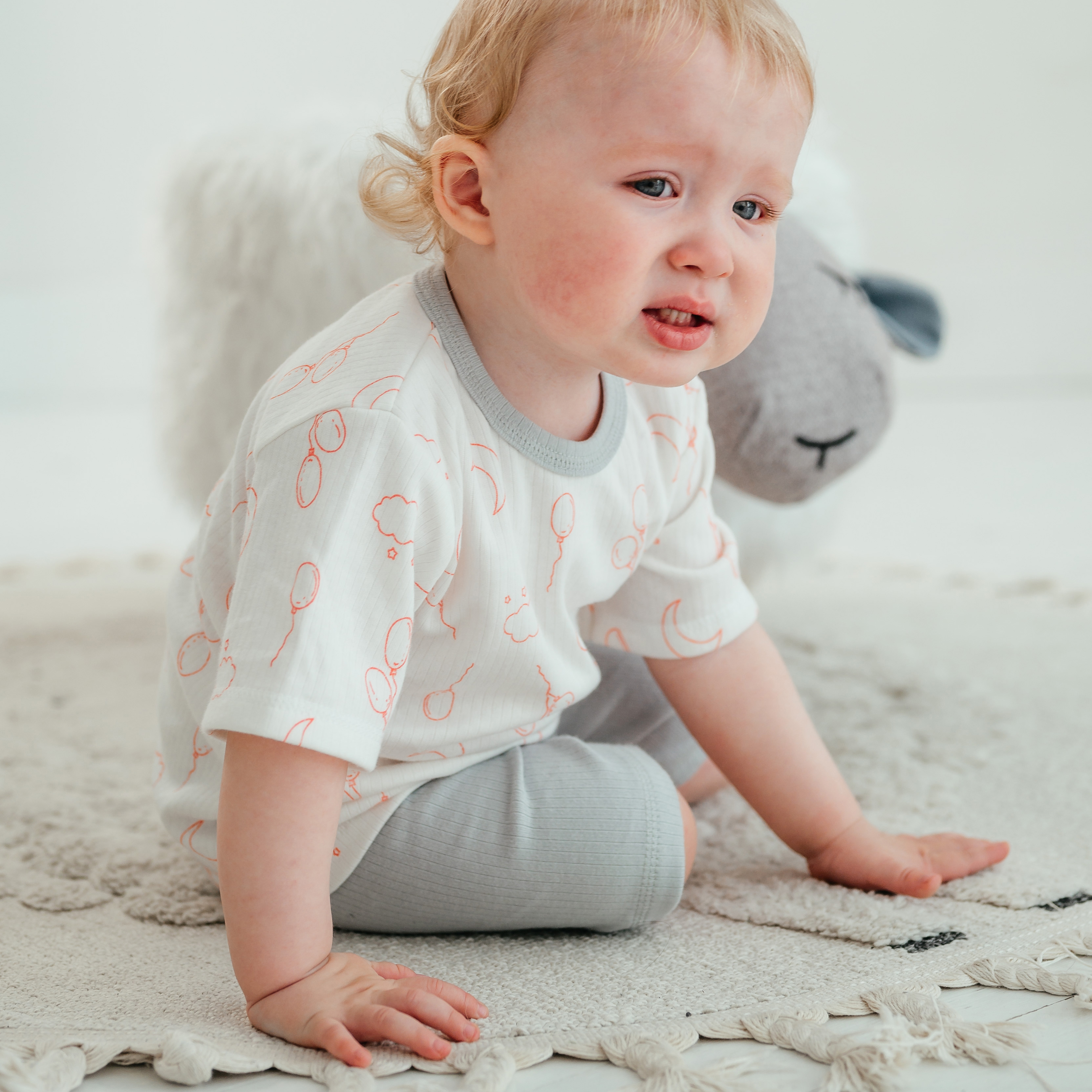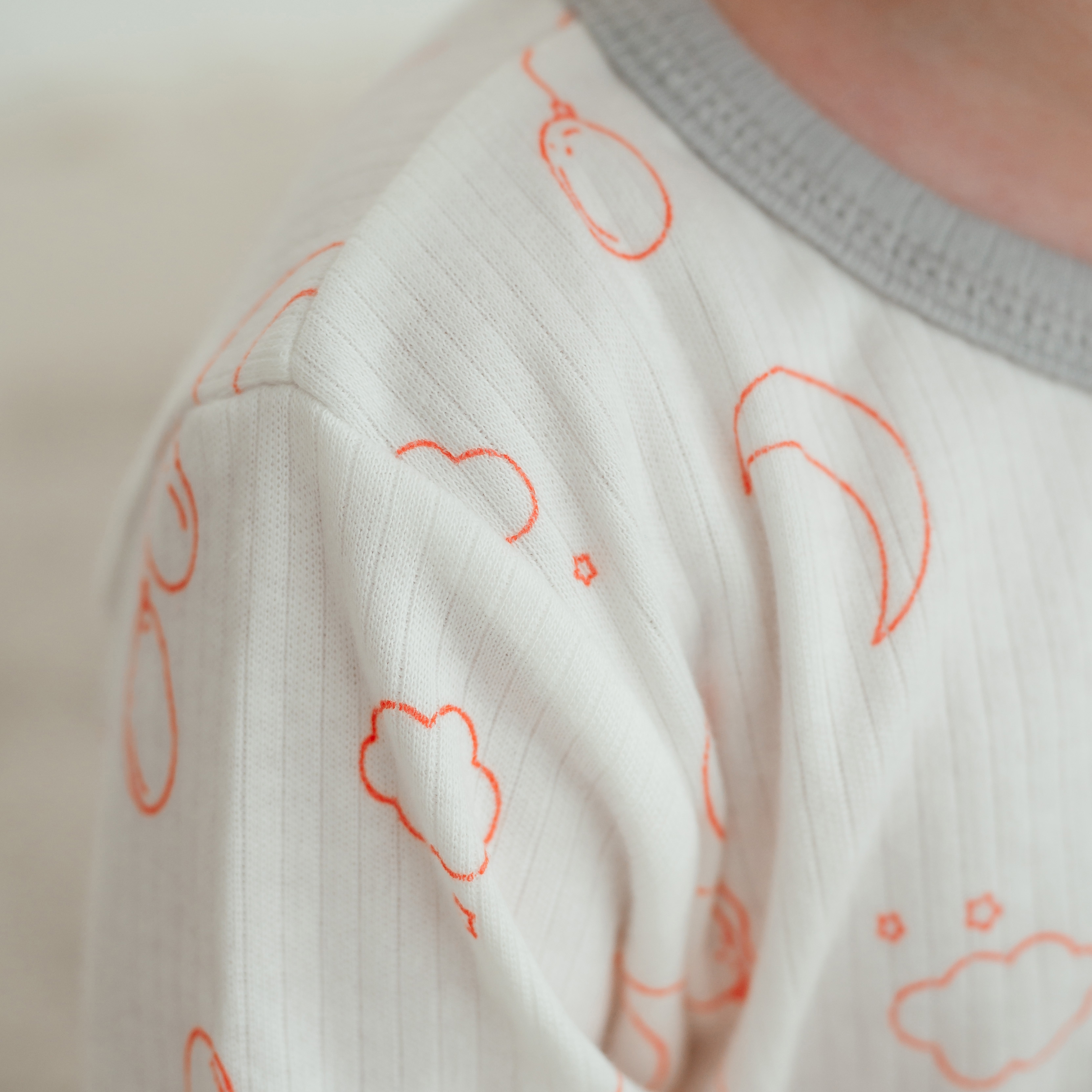 Футболка с двумя кнопочками на плече для удобства продевания головы ребёнка. Рукава короткие. Горловина окантована.