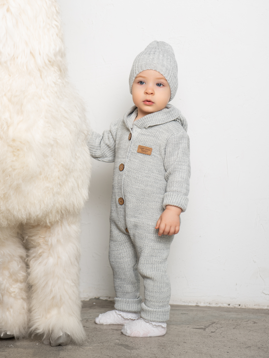 Вязаный комбинезон с капюшоном и шапочкой в комплекте.