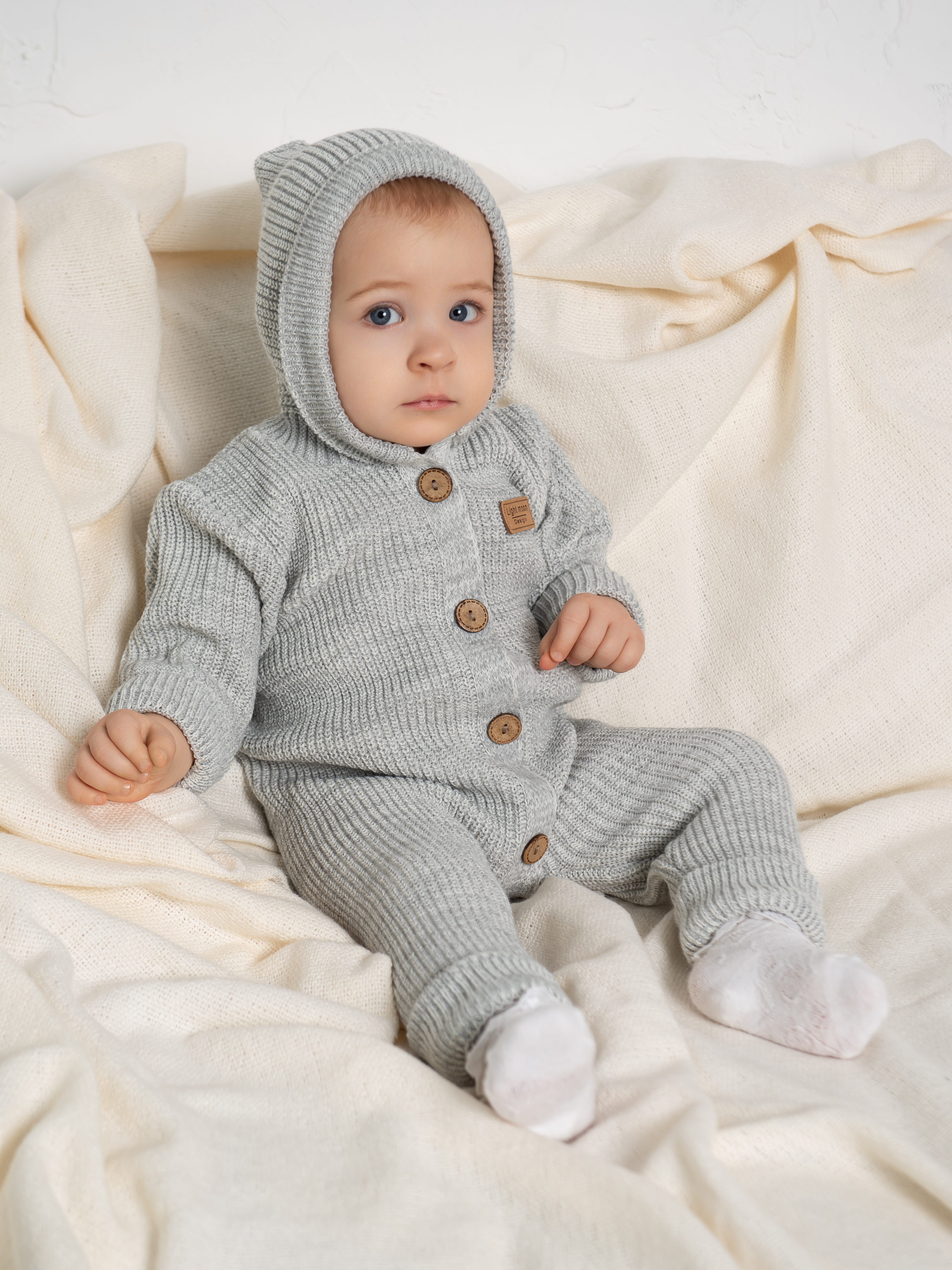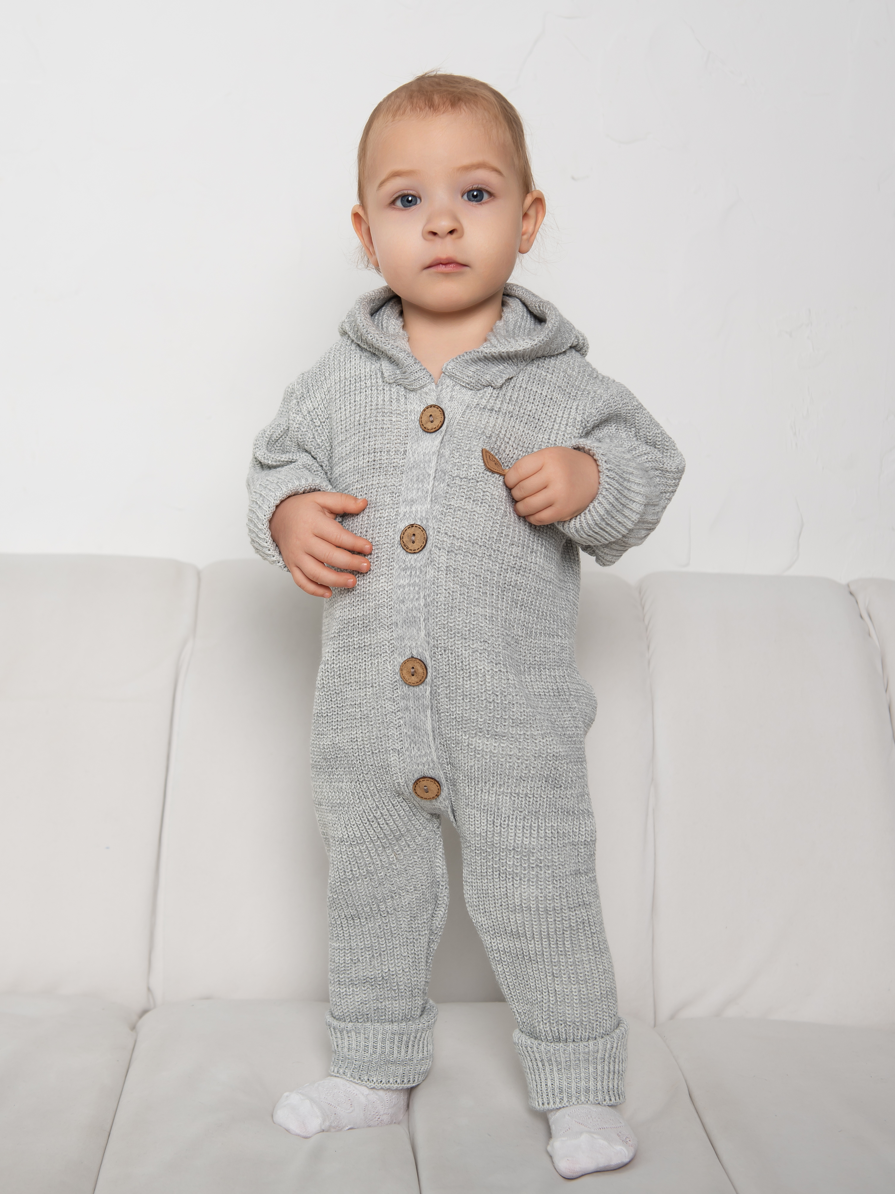 Вязанный комбинезон с глубоким капюшоном, на пуговицах.