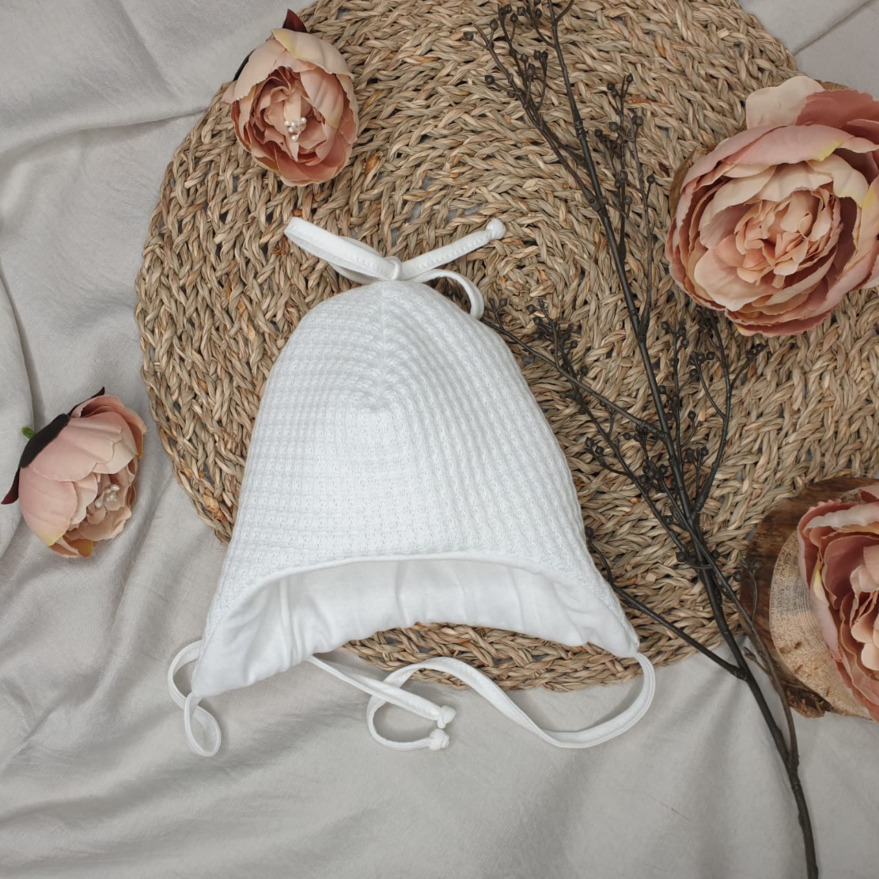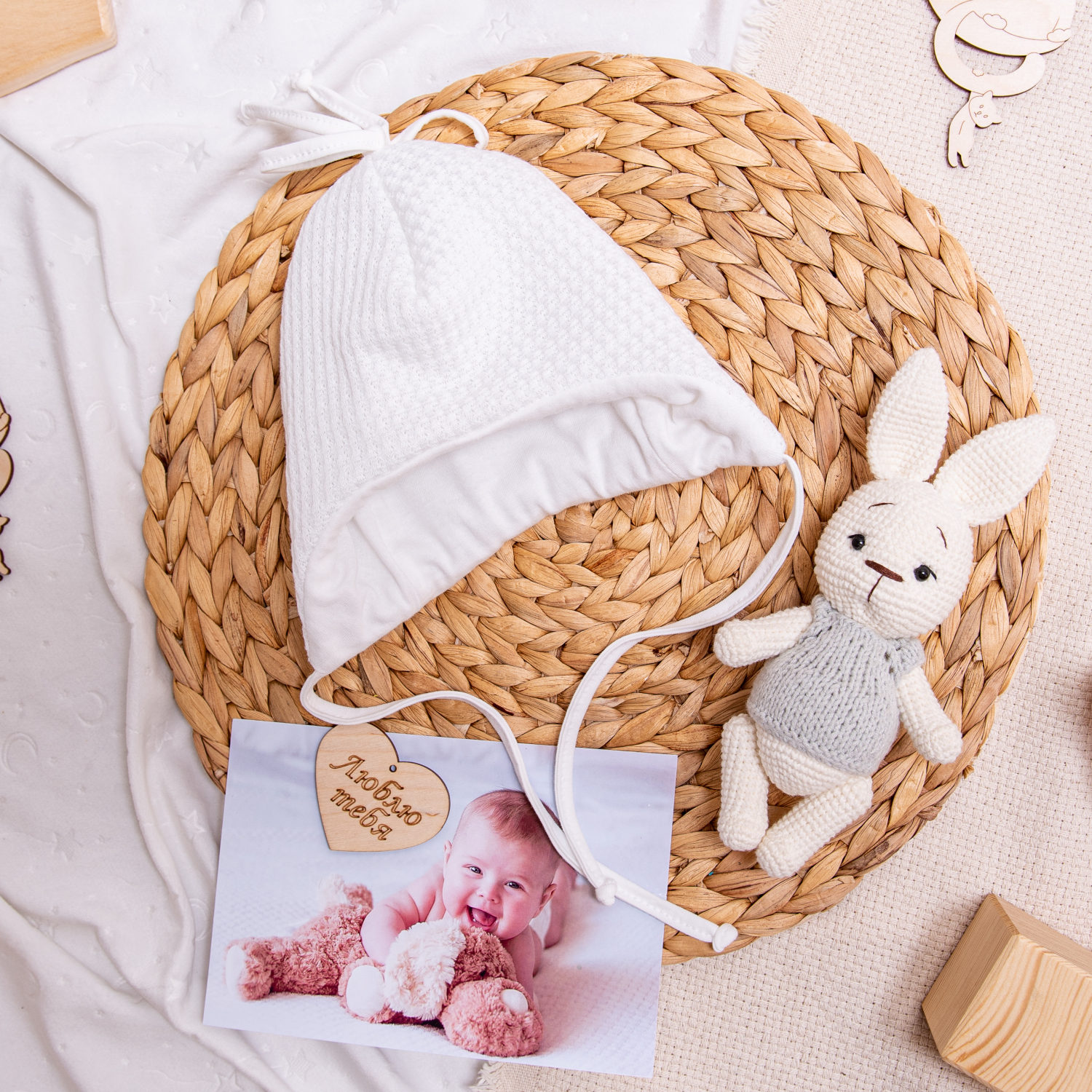 Модель молочного цвета и отлично комбинируется с любыми цветами одежды. Удобный крой, хлопковые завязки и подклад очень важны для мамочек при выборе шапочки для малыша.