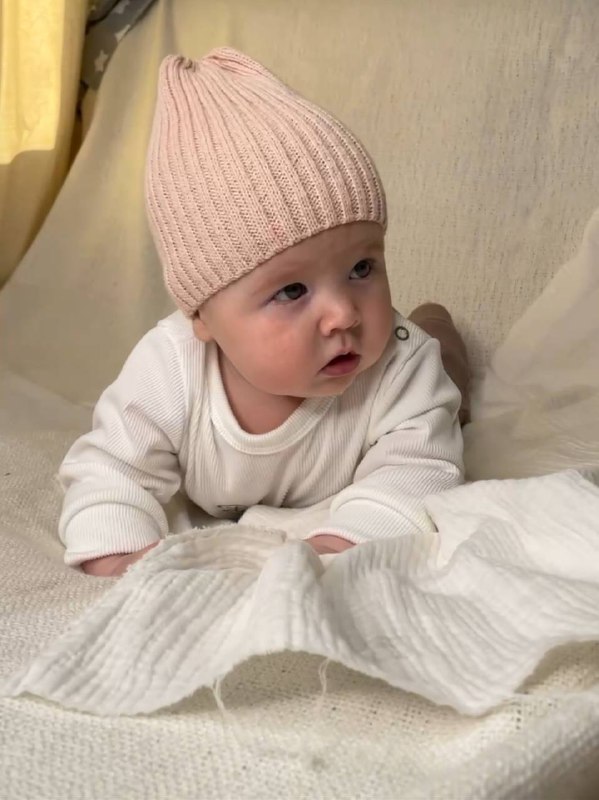 Теплая шапочка с полушерстяной нити. Удобно облегает голову малыша, модель создана в стиле "Бини".