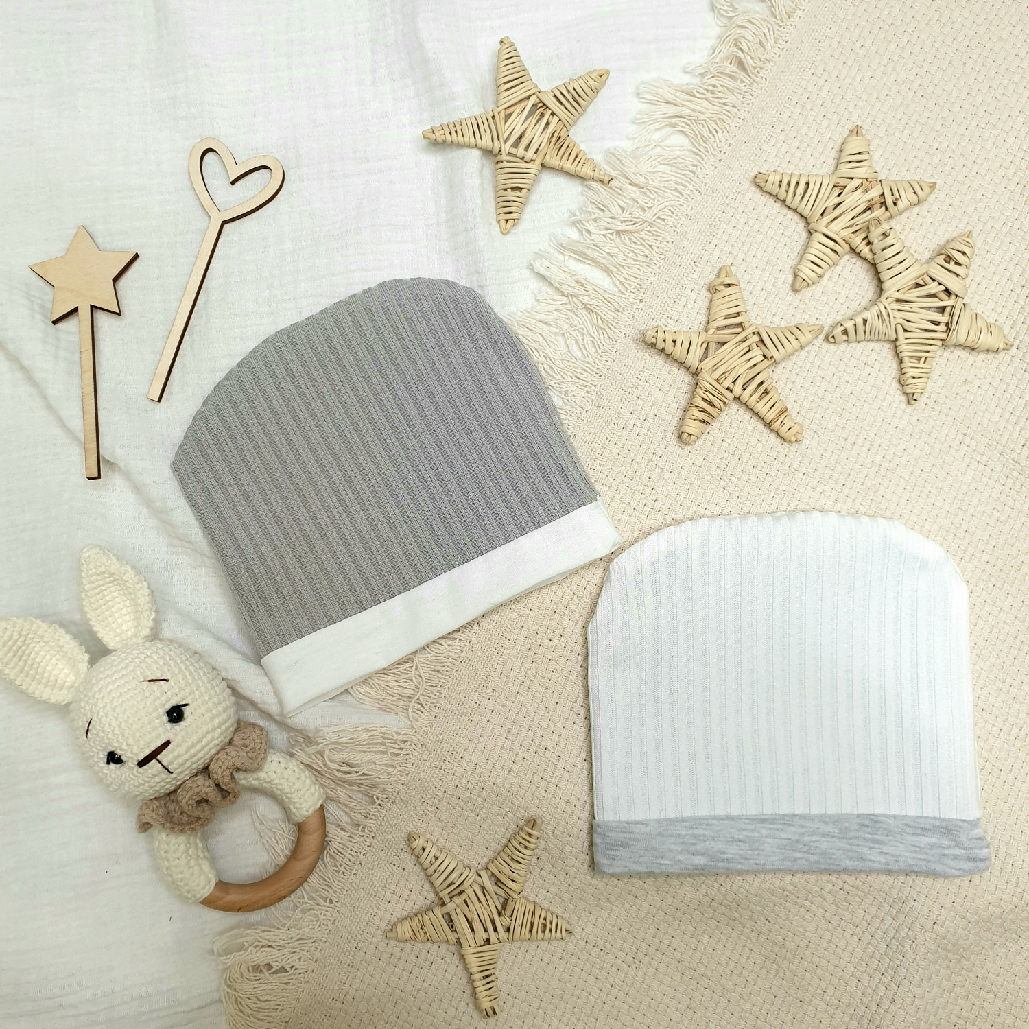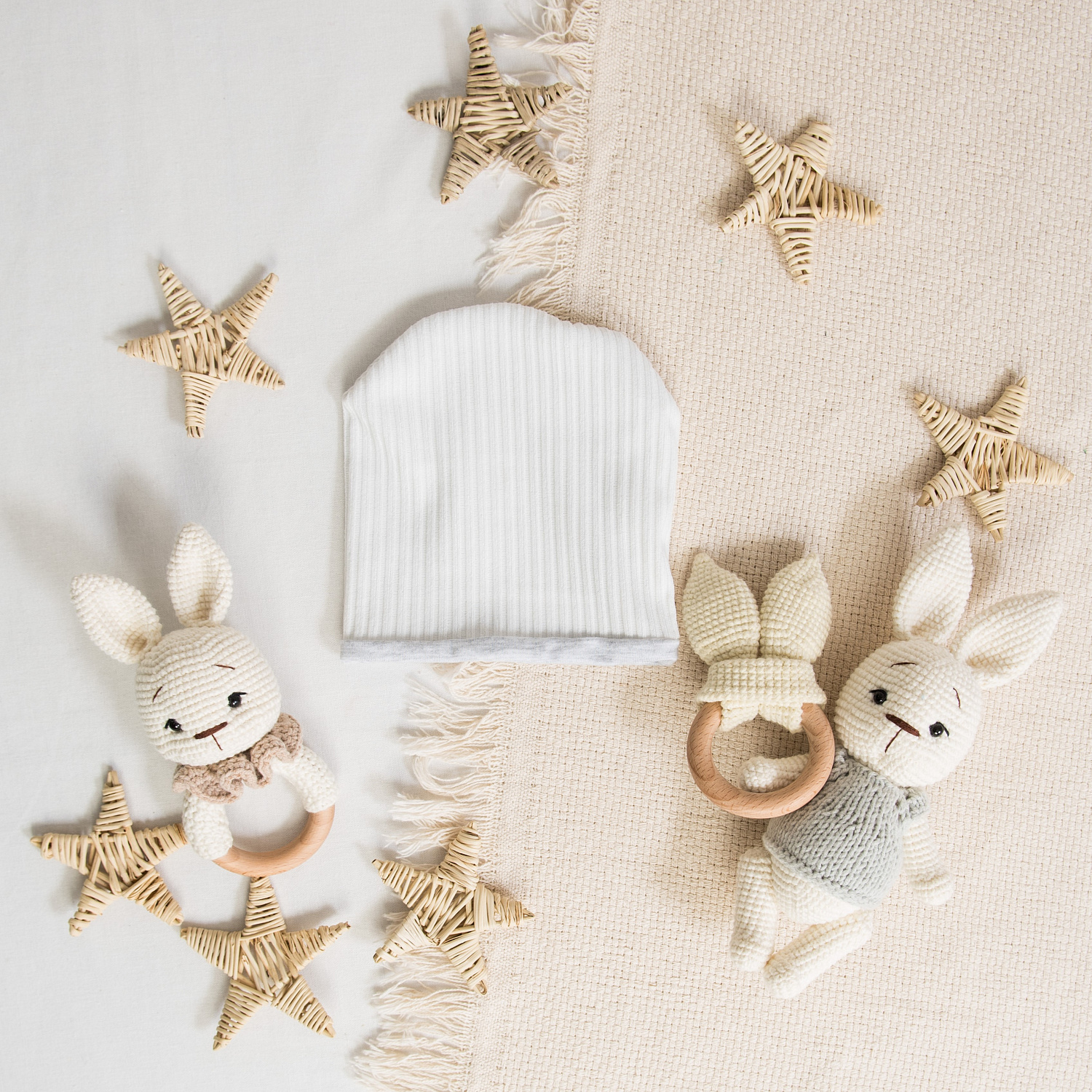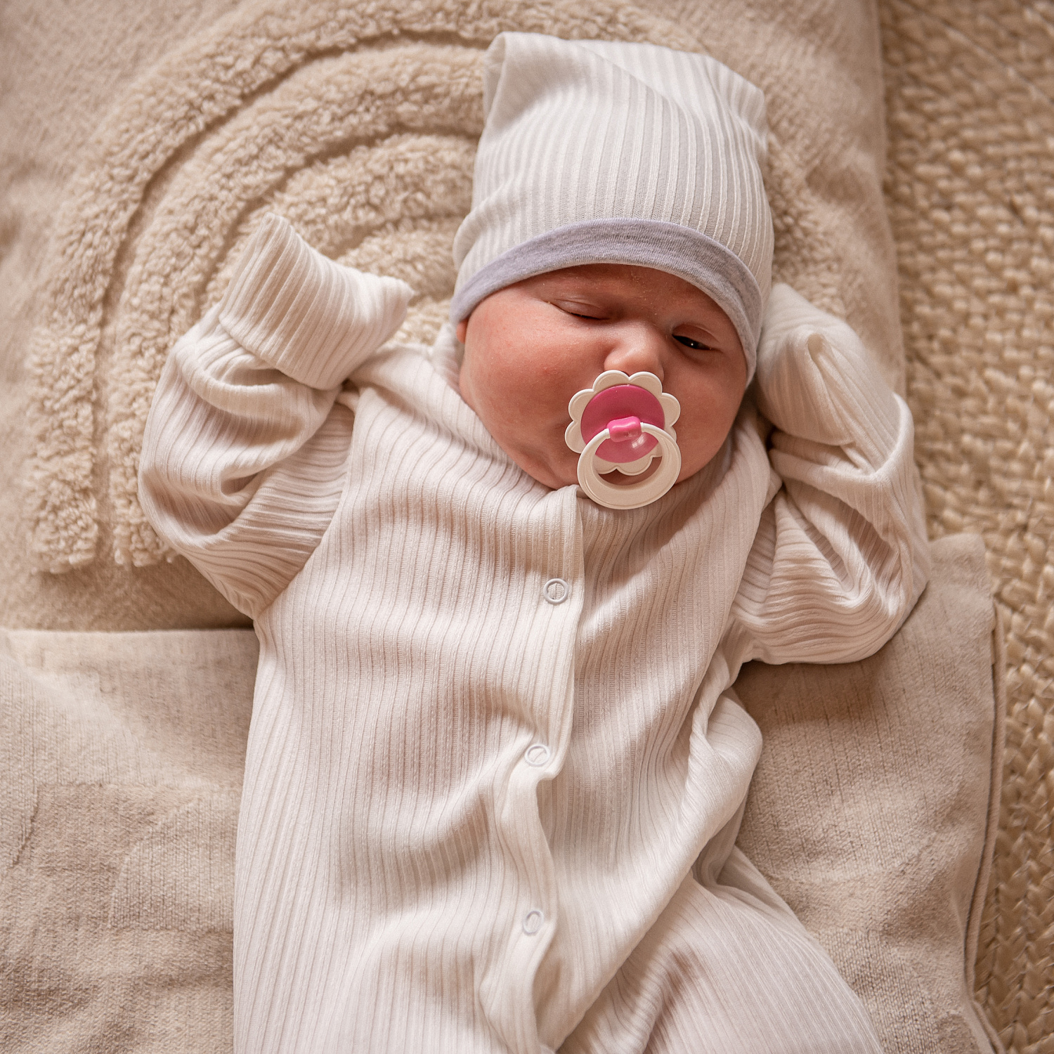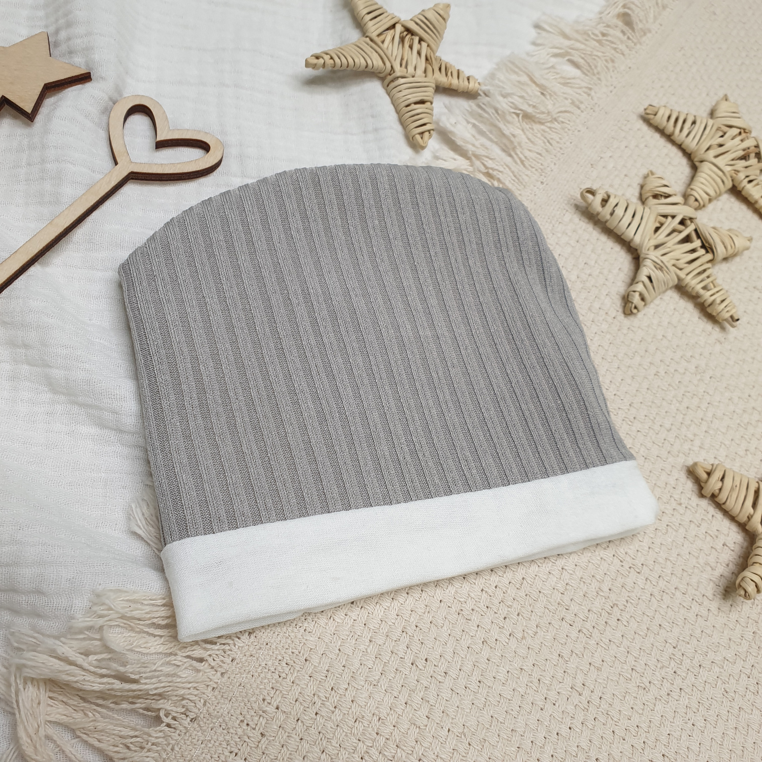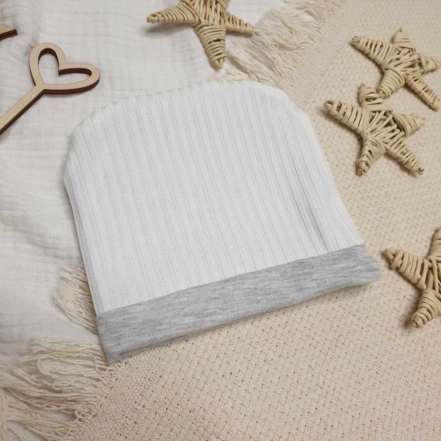 Нейтральные расцветки шапочки позволяют скомбинировать её с любым цветом наряда малыша.