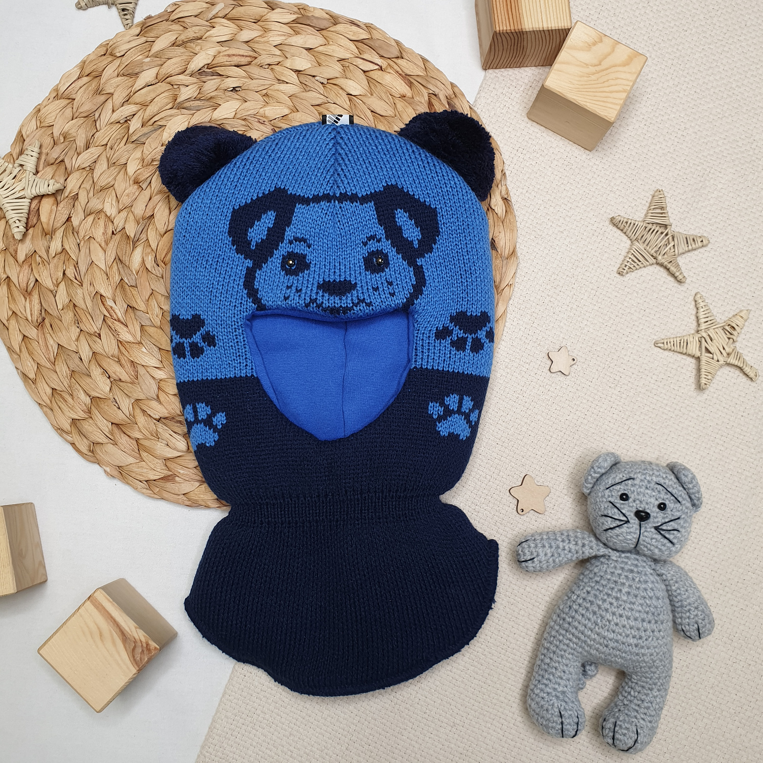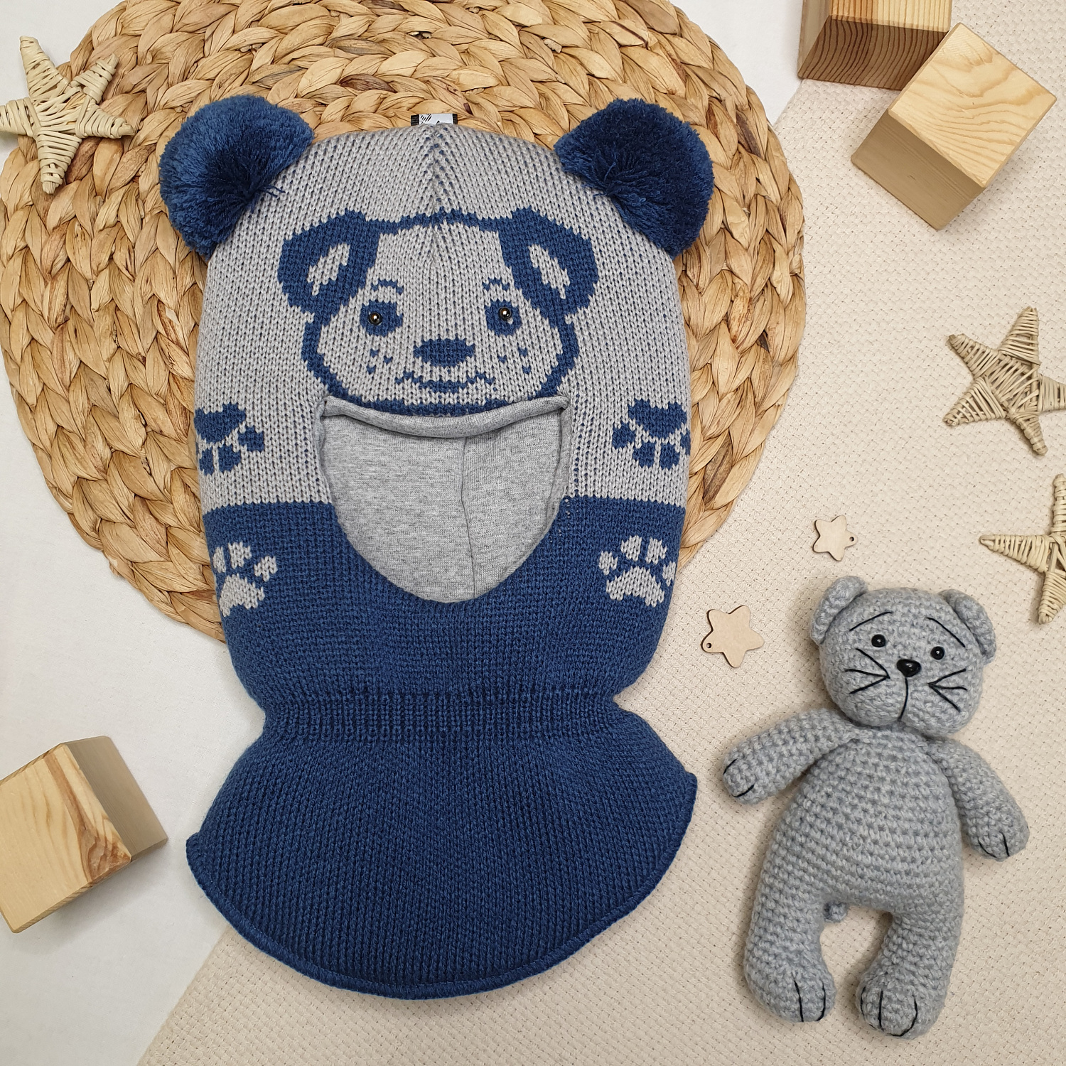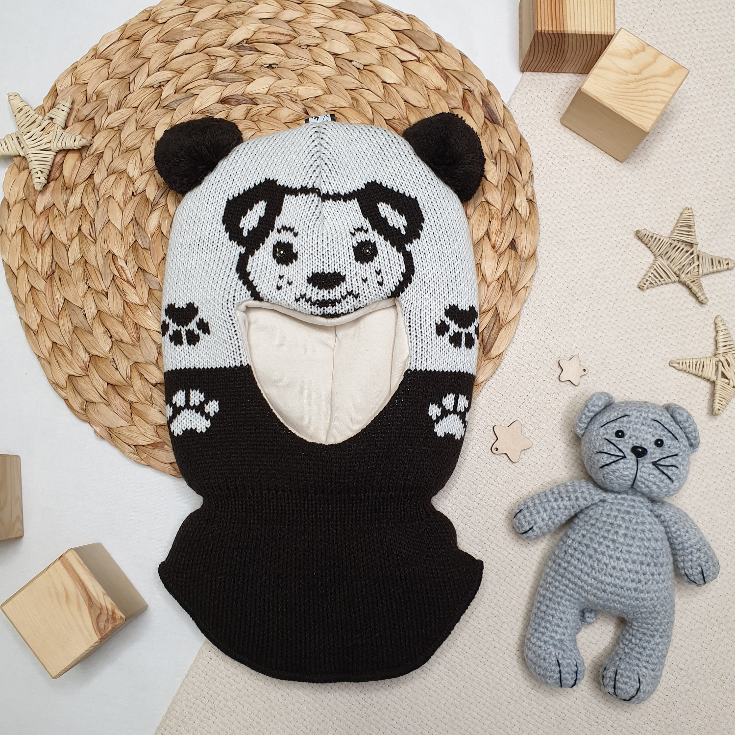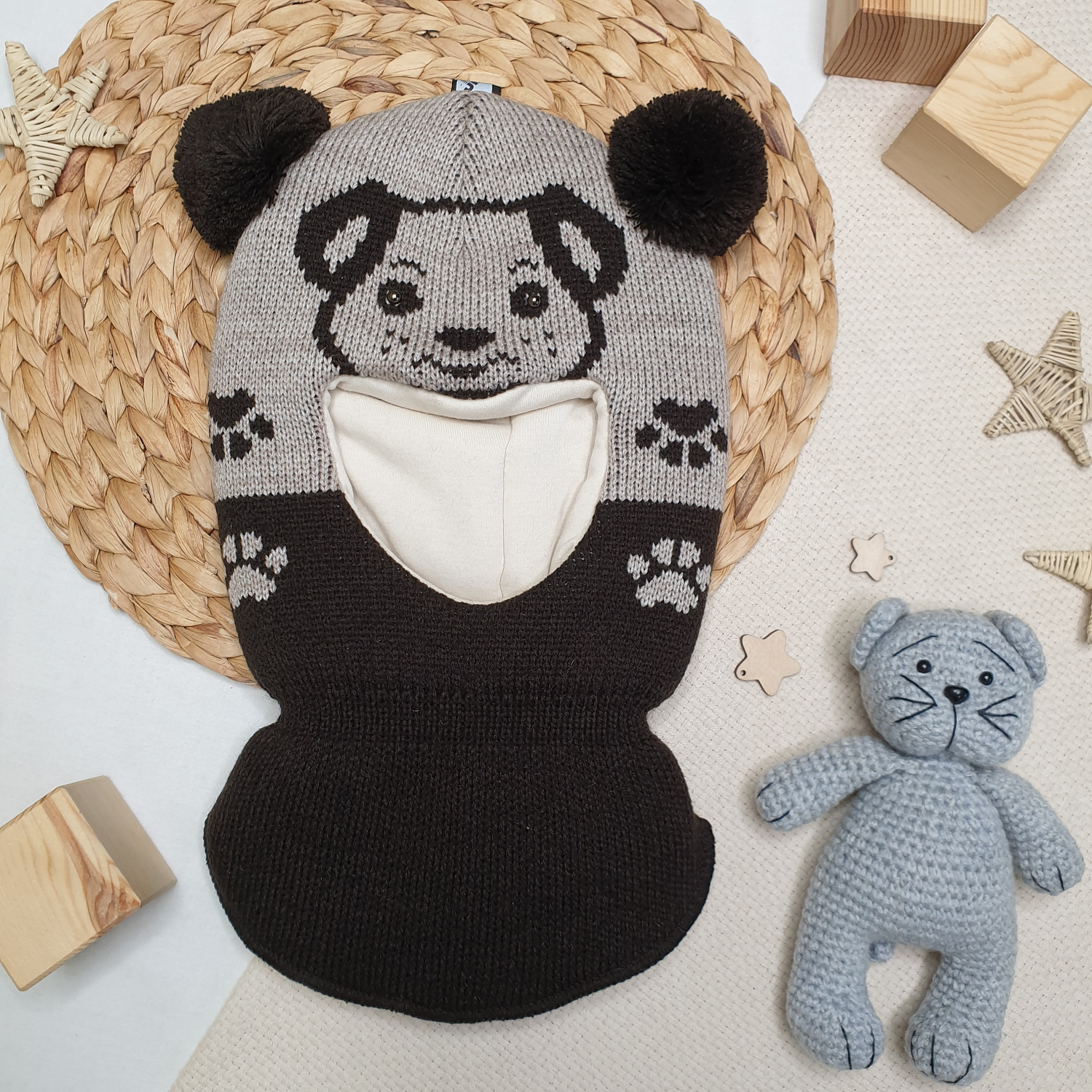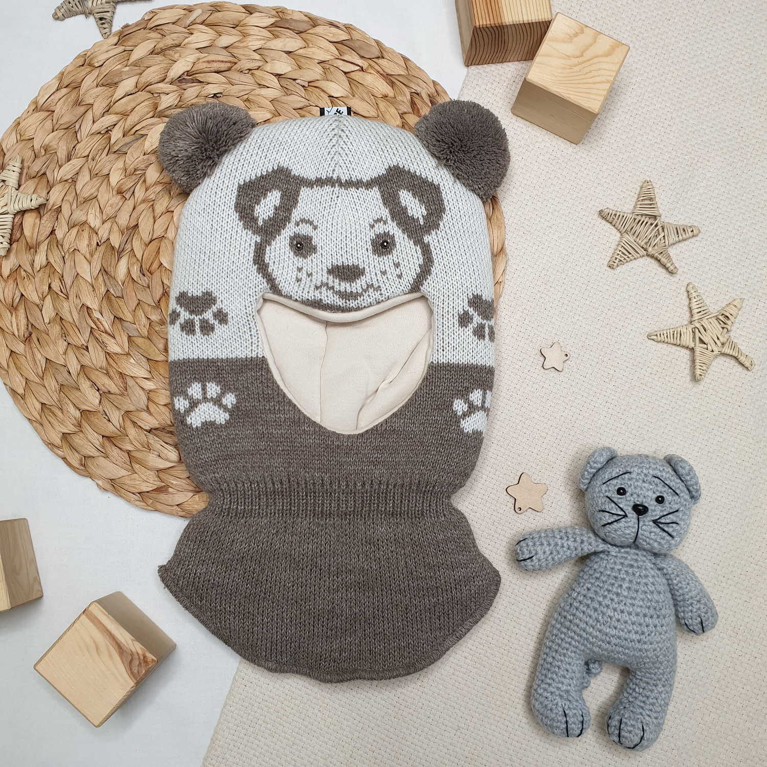 Вязаный узор в виде мордочки и лапок дополнен забавными ушками-помпонами.