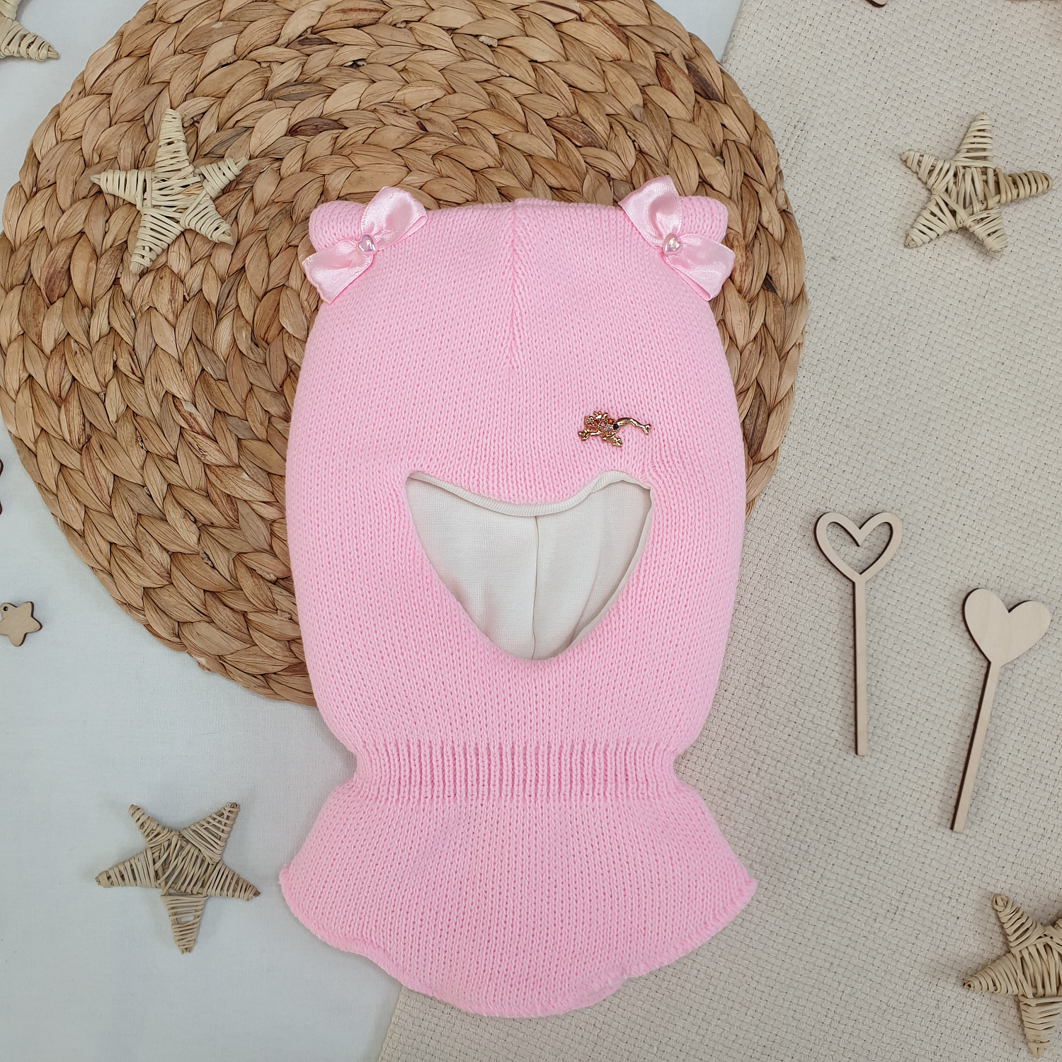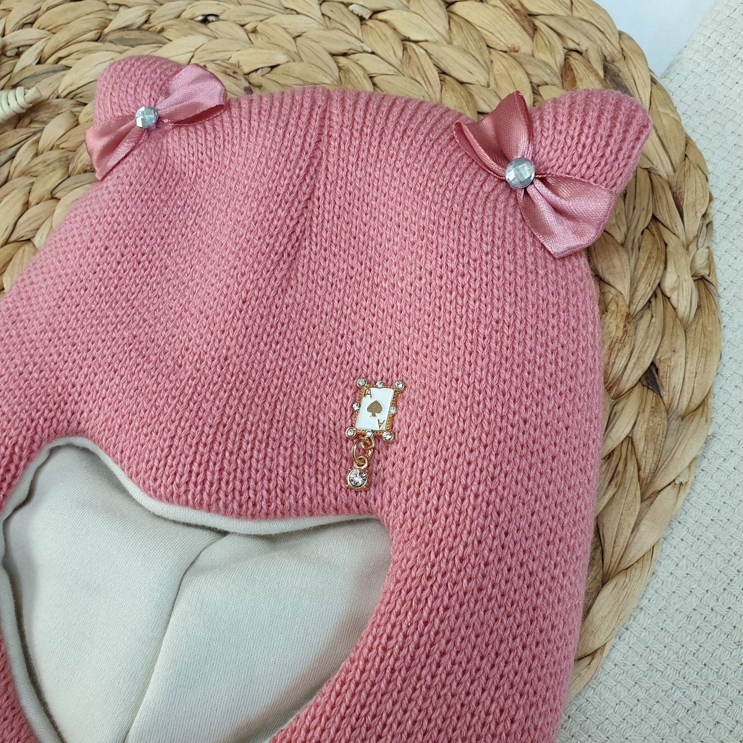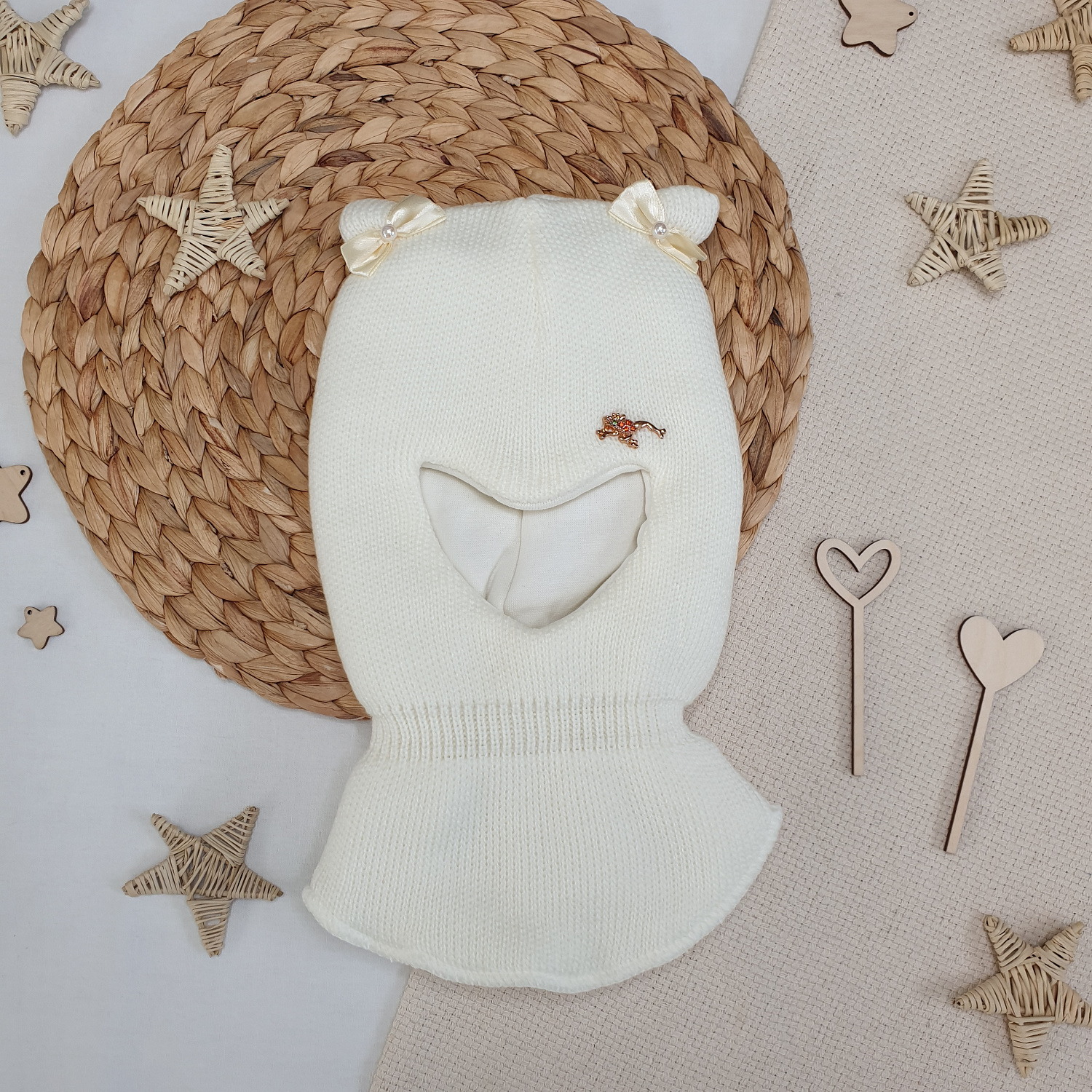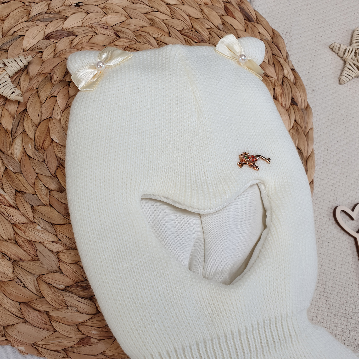 Однотонная вязка дополнена декоративным элементом и бантиками на ушках.