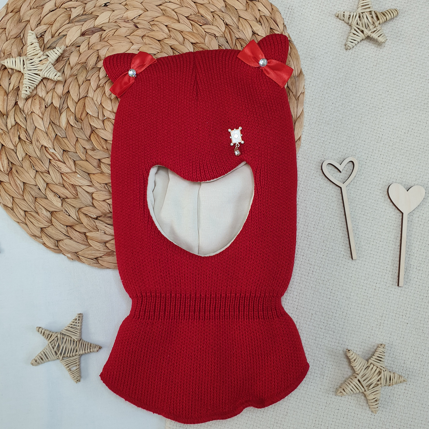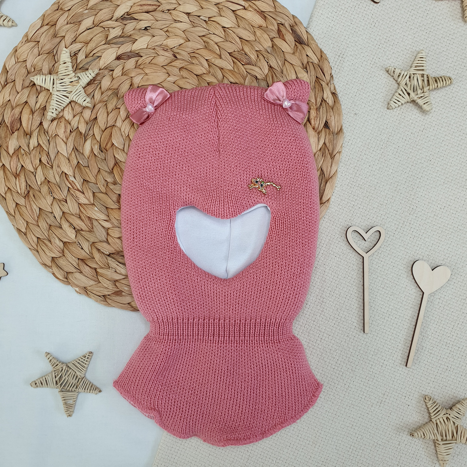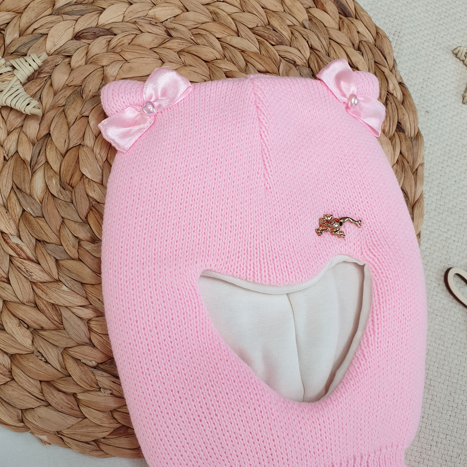 Однотонная вязка дополнена декоративным элементом и бантиками на ушках.