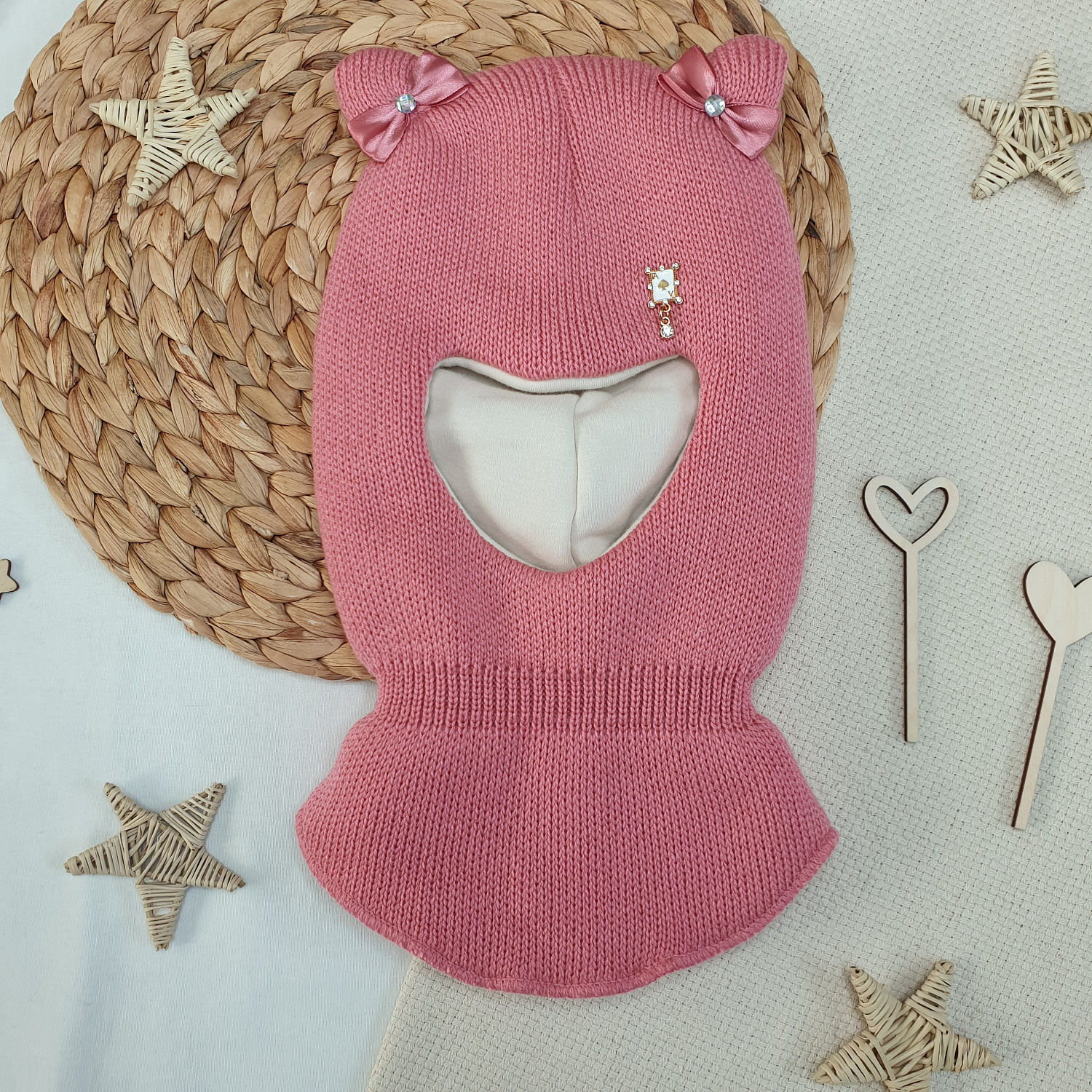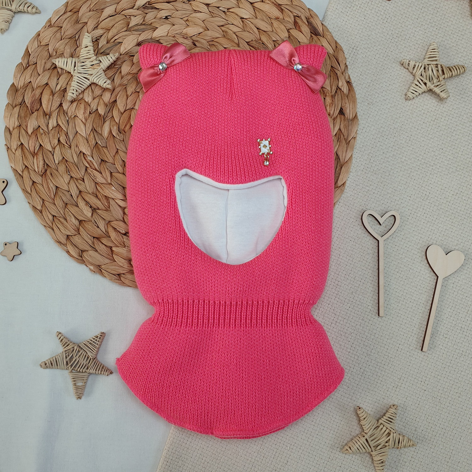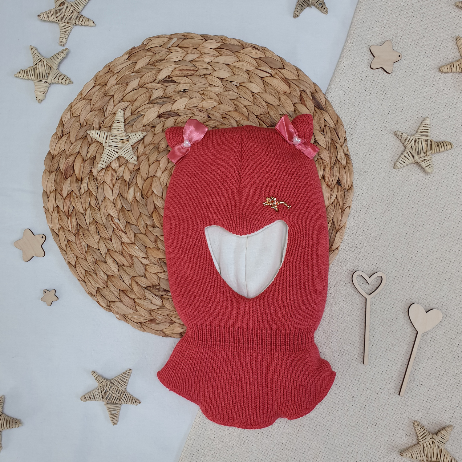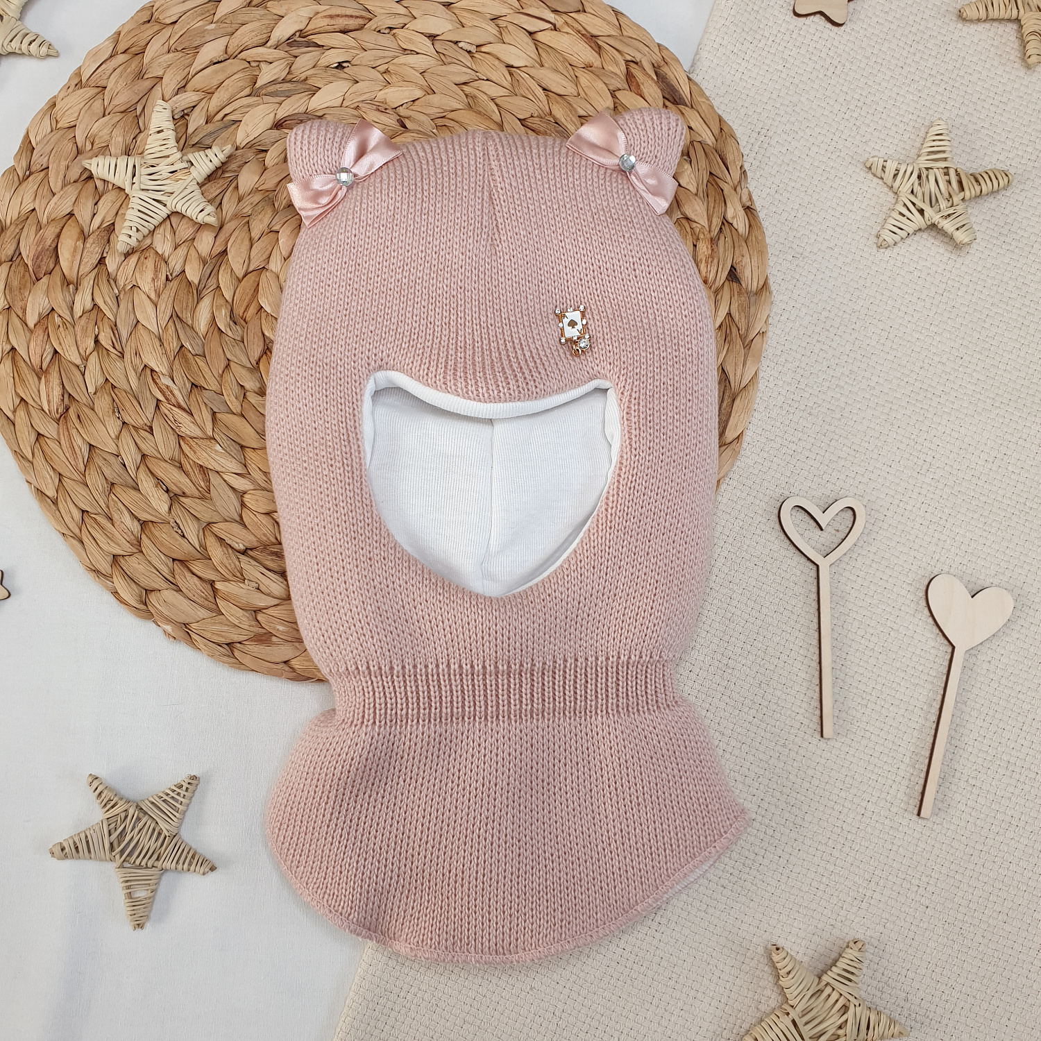 Однотонная вязка дополнена декоративным элементом и бантиками на ушках.