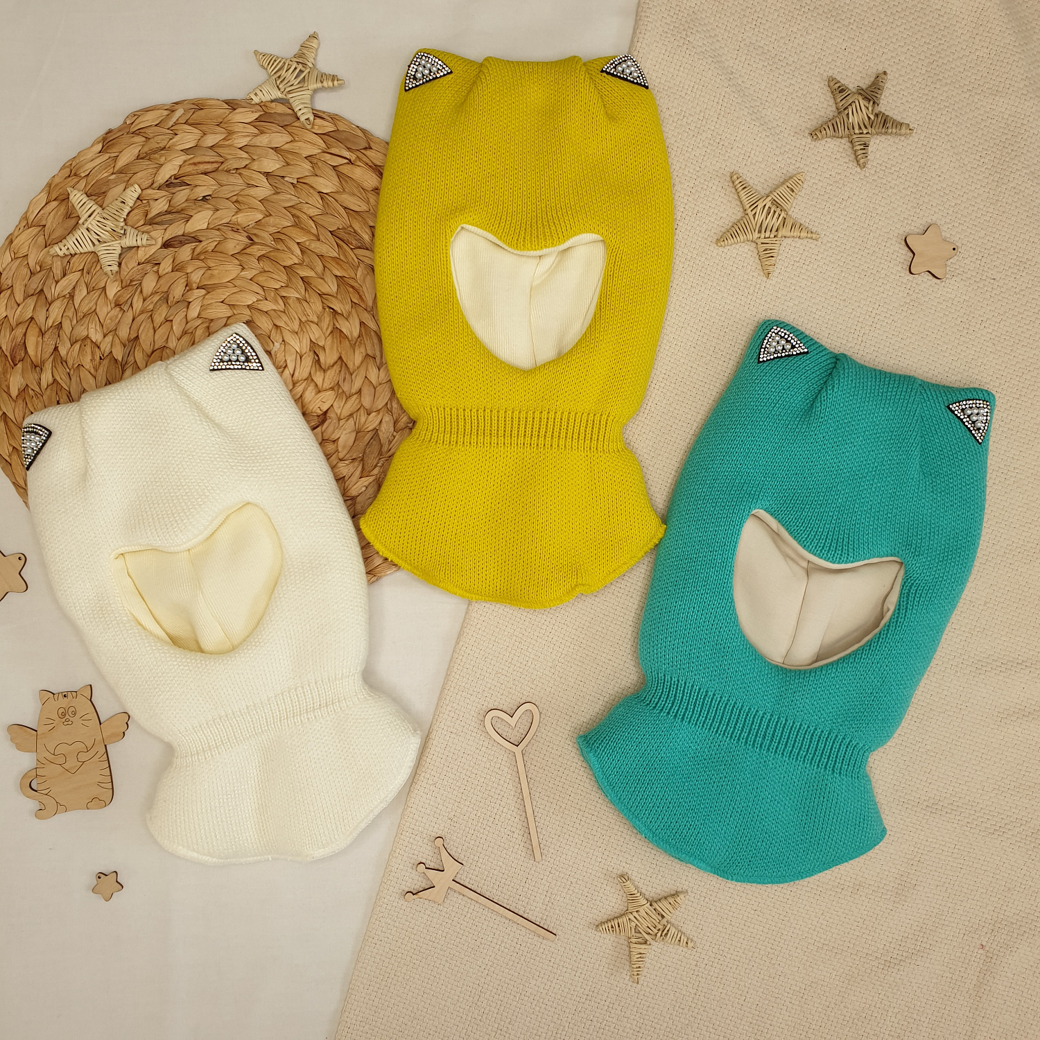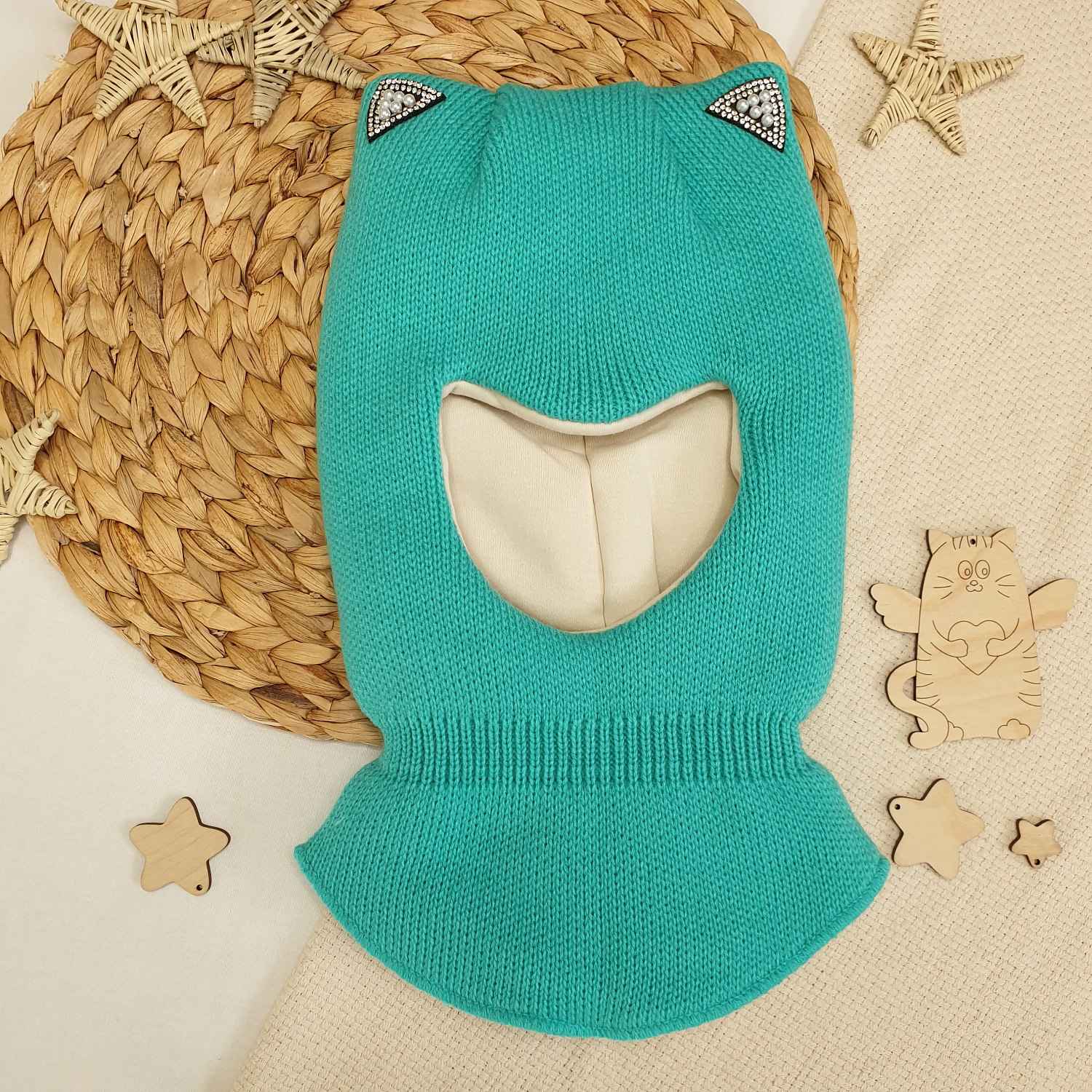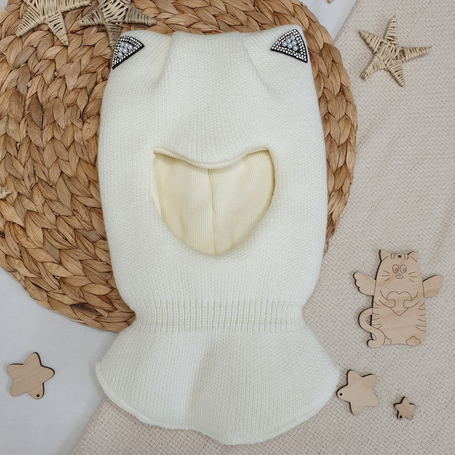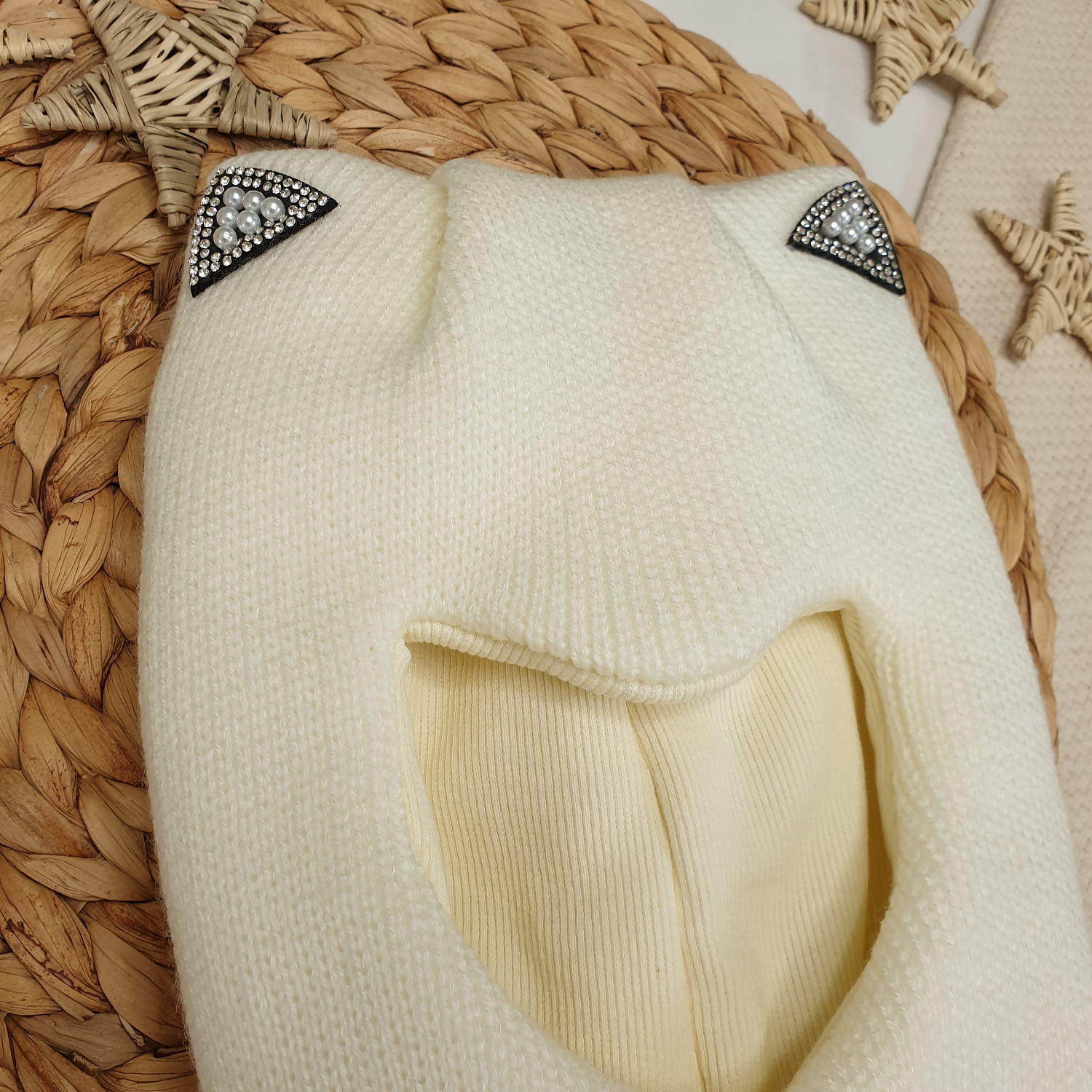 Однотонная вязка дополнена декоративным элементом и стразами на ушках.